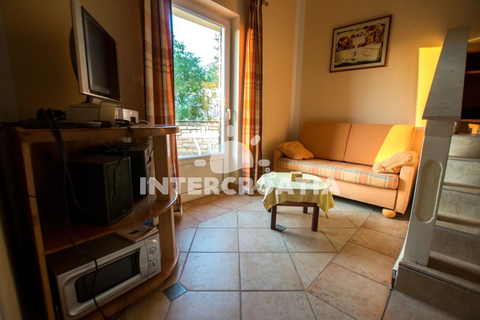 Vzdálenosti: tenisové kurty 0 m, Moře 330 m, pláž 450 m (skalnatá, oblázková a betonové desky), restaurace 300 m, centrum 300 m, bar 350 m, půjčovna motorových člunů 350 m, pošta 350 m, veřejná doprava 350 m, supermarket 350 m, půjčovna kol 500 m, směnárna 500 m, čerpací stanice 1,5 km, lékárna 1,5 km, park Plitvice 2 km, diskotéka 3 km, ambulance 4,5 km, banka 25 km, letiště (Zadar) 40 km, trajekt (Zadar) 45 km,