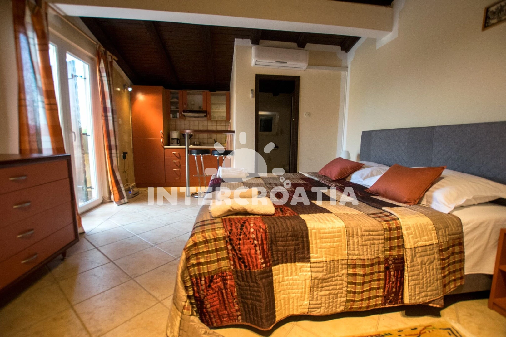 Apartmán typu studio (32 m2) s balkonem. Nachází se ve zvýšeném přízemí objektu. Kuchyňská linka je vybavena varnou deskou, kávovarem, nádobím, lednicí, mrazákem. K dispozici dvoulůžko, televize se satelitním programem. Koupelna se sprchovým koutem, umyvadlem, WC.