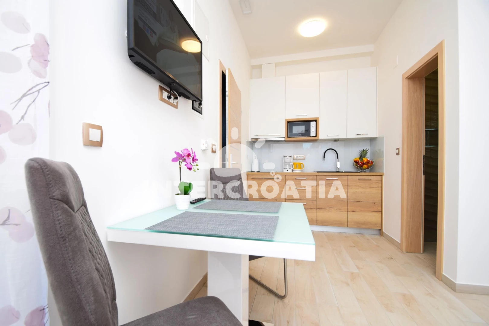 Apartmán (2) s balkonem. Nachází se v objektu. Kuchyňská linka je vybavena varnou deskou, kávovarem, myčkou na nádobí, mikrovlnnou troubou, rychlovarnou konvicí, nádobím, mini lednicí, mrazákem. K…