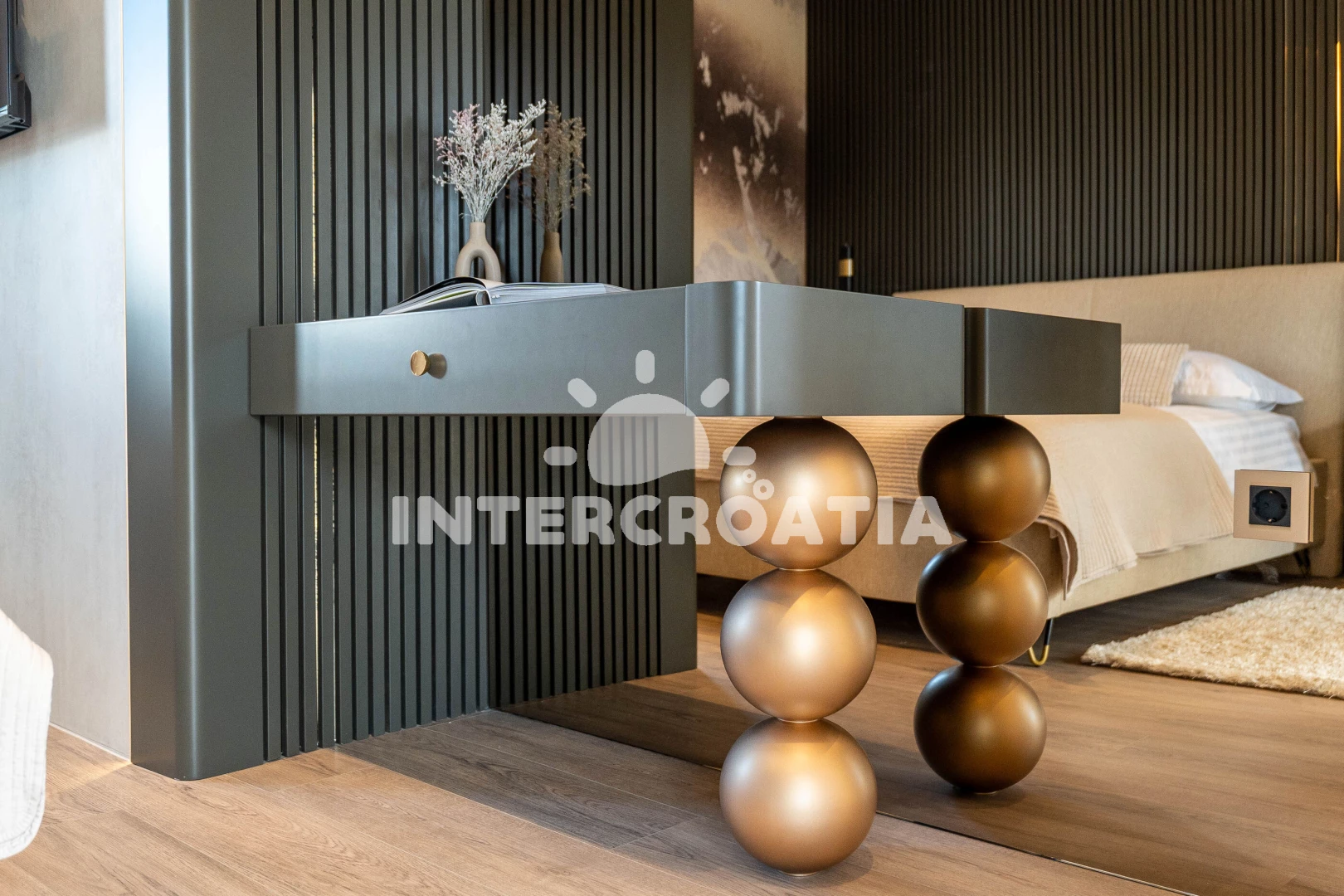 Apartmán (40 m2). Nachází se v 1. patře objektu. Apartmán má 1 ložnici a je vhodný pro až 4 osoby. Kuchyňská linka je vybavena varnou deskou, troubou, myčkou na nádobí, mikrovlnnou troubou, nádobím, lednicí. V obývací místnosti je rozložitelná pohovka (extra lůžko pro 2 osoby). K dispozici televize se satelitním programem, žehlička. Ložnice s dvoulůžkem. Koupelna se sprchovým koutem, umyvadlem, fénem a WC.
