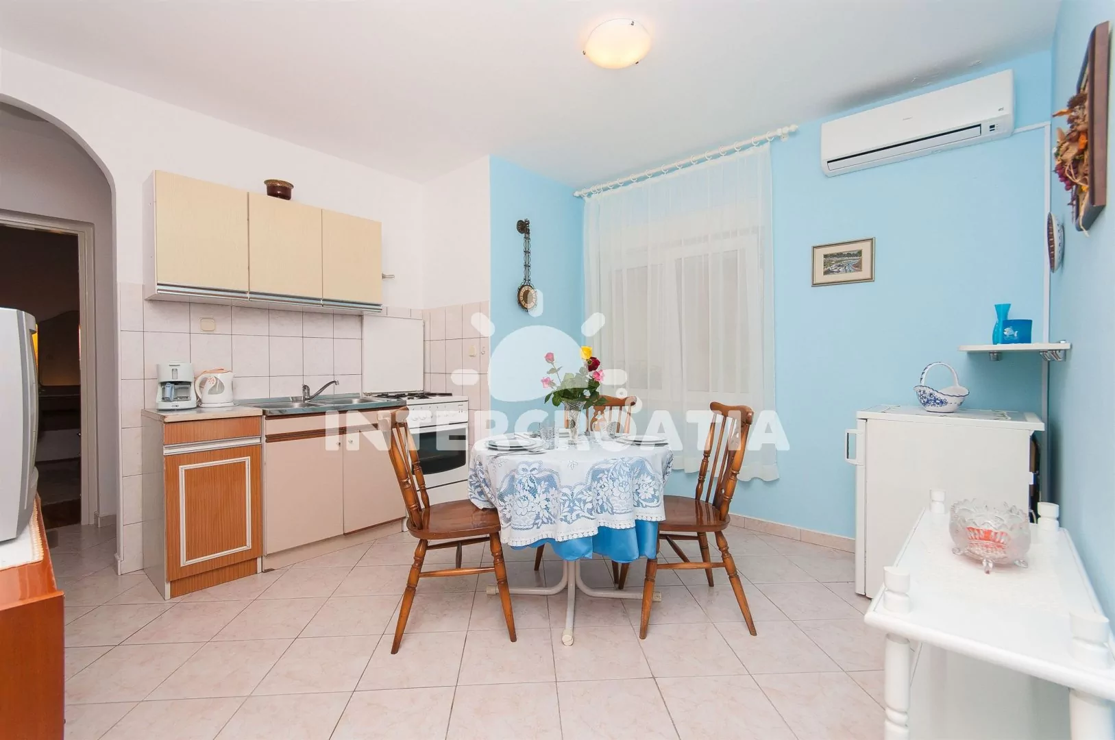 Útulný apartmán s jednou ložnicí, nacházející se v přízemí. Vstup, obývací místnost spojená s kuchyní. Kuchyňská linka se sporákem, troubou, mikrovlnnou troubou, lednicí, kávovarem, rychlovarnou…