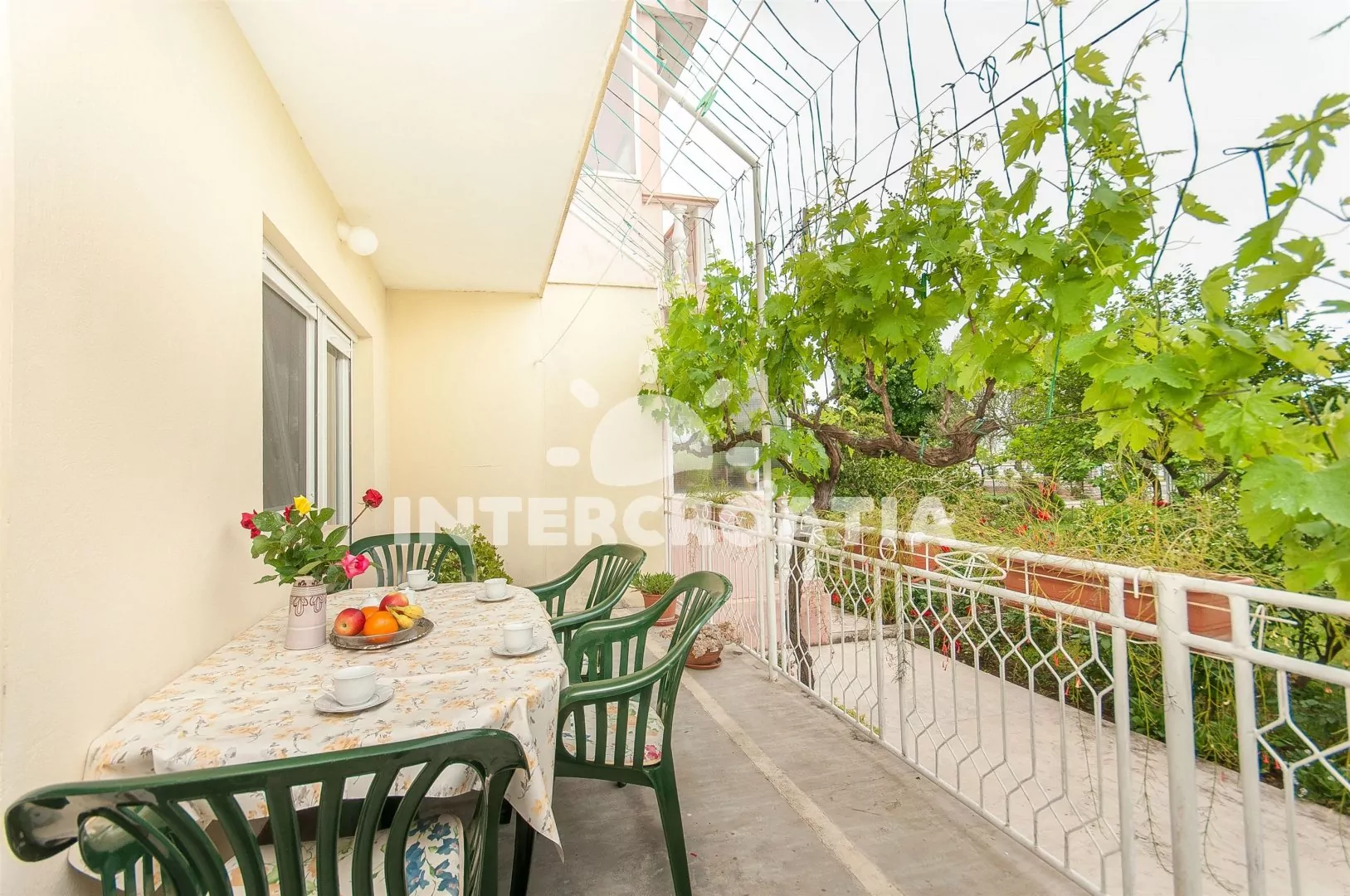 Třípokojový apartmán se dvěma ložnicemi a terasou s posezením, nacházející se v přízemí. Vstup, obývací místnost spojená s kuchyní. Kuchyňská linka se sporákem (elektřina/plyn), troubou, mikrovlnnou troubou, lednicí s mrazákem, kávovarem, rychlovarnou konvicí a nádobím. V obývací místnosti jídelní stůl pro 4 osoby a televize se satelitem. První ložnice s dvoulůžkem. Druhá ložnice s dvoulůžkem a jedním jednolůžkem. Koupelna s vanou, umyvadlem, wc, bidetem a vysoušečem vlasů. Hosté mají k dispozici terasu s posezením a v zahradě gril. Parkování u objektu.