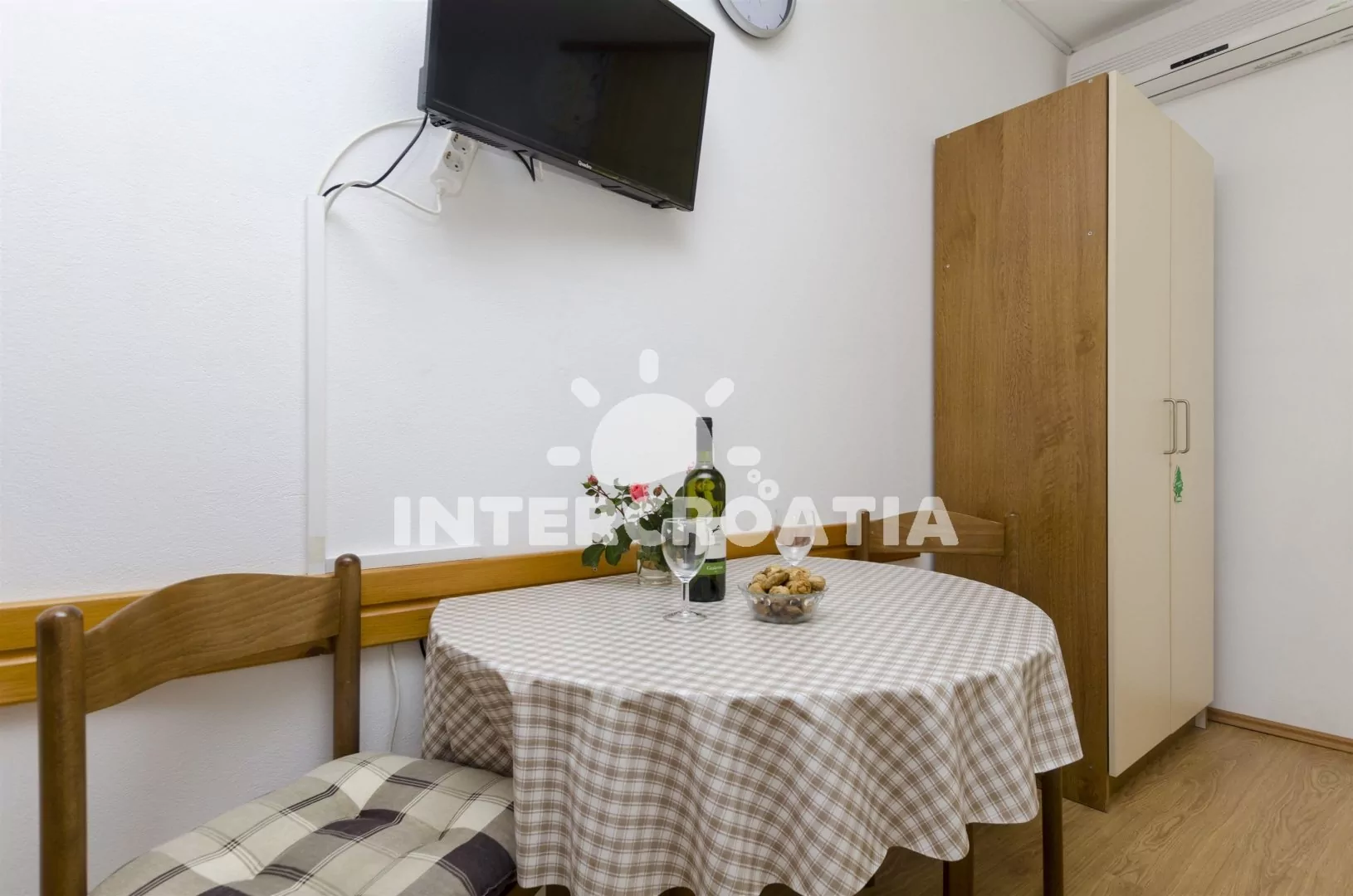 Apartmán typu studio v prvním patře je vhodný pro 2 osoby. Obývací místnost je spojena s kuchyní. Kuchyňská linka je vybavena dvouplotýnkovým sporákem, nádobím a lednicí s mrazákem, na požádání mikrovlnná trouba a rychlovarná konvice. Obývací místnost s jídelním stolem pro 2 osoby, televizí se satelitním programem, jedním dvoulůžkem a klimatizací. Koupelna se sprchovým koutem, umyvadlem a wc. Hostům je k dispozici společná terasa s grilem a parkovací místa u objektu zdarma.