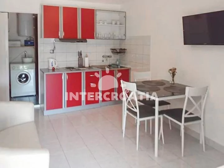 Apartmán (40 m2) s terasou, posezením a výhledem na moře se nachází v přízemí domu. Apartmán má 2 ložnice a je vhodný pro až 3 osoby. Obývací pokoj je spojený s kuchyní. Kuchyňská linka je vybavena dvouplotýnkovým vařičem, digestoří, rychlovarnou konvicí, nádobím a lednicí s mrazákem. Obývací pokoj s jídelním stolem, pohovkou, televizí a vstupem na terasu. Ložnice s dvoulůžkem a jedním jednolůžkem. Koupelna s vanou, sprchovou zástěnou, umyvadlem, pračkou a wc. Hostům je k dispozici parkování u objektu zdarma.
