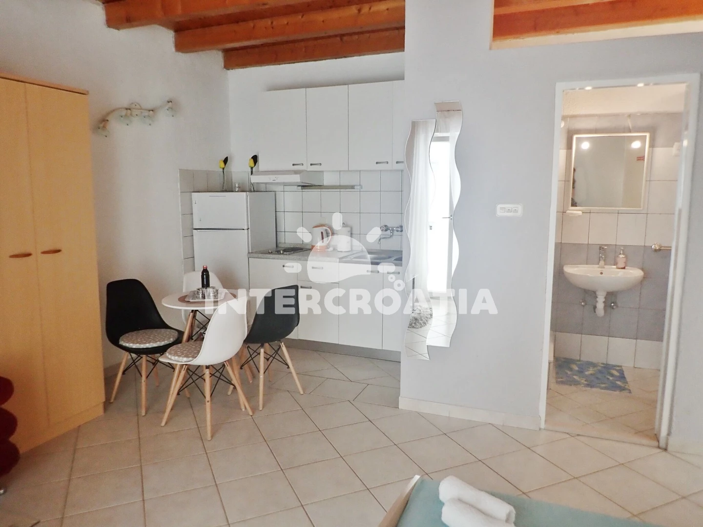 Vzdálenosti: Moře 20 m, pláž 30 m (oblázková a betonové desky), restaurace 10 m, bar 10 m, kotviště pro čluny 30 m, půjčovna motorových člunů 30 m, veřejná doprava 200 m, supermarket 4 km, centrum 4 km, lékárna 12 km, půjčovna kol 12 km, směnárna 12 km, pošta 12 km, čerpací stanice 12 km, park Plitvice 13 km, tenisové kurty 14 km, diskotéka 14 km, ambulance 15 km, letiště (Zadar) 35 km, muzeum 57 km, potápění 57 km, banka 57 km, trajekt (Zadar) 57 km,