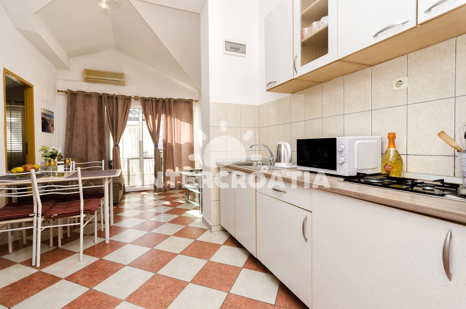 Apartmán se nachází 210 m od moře a pláže. Pláž je betonové desky, skalnatá a větší kamení. U objektu je k dispozici společná zahrada s posezením a grilem.