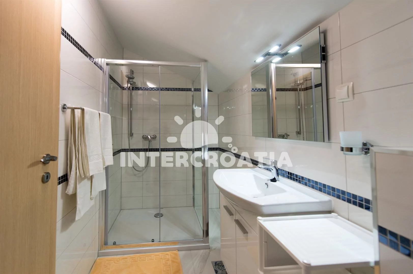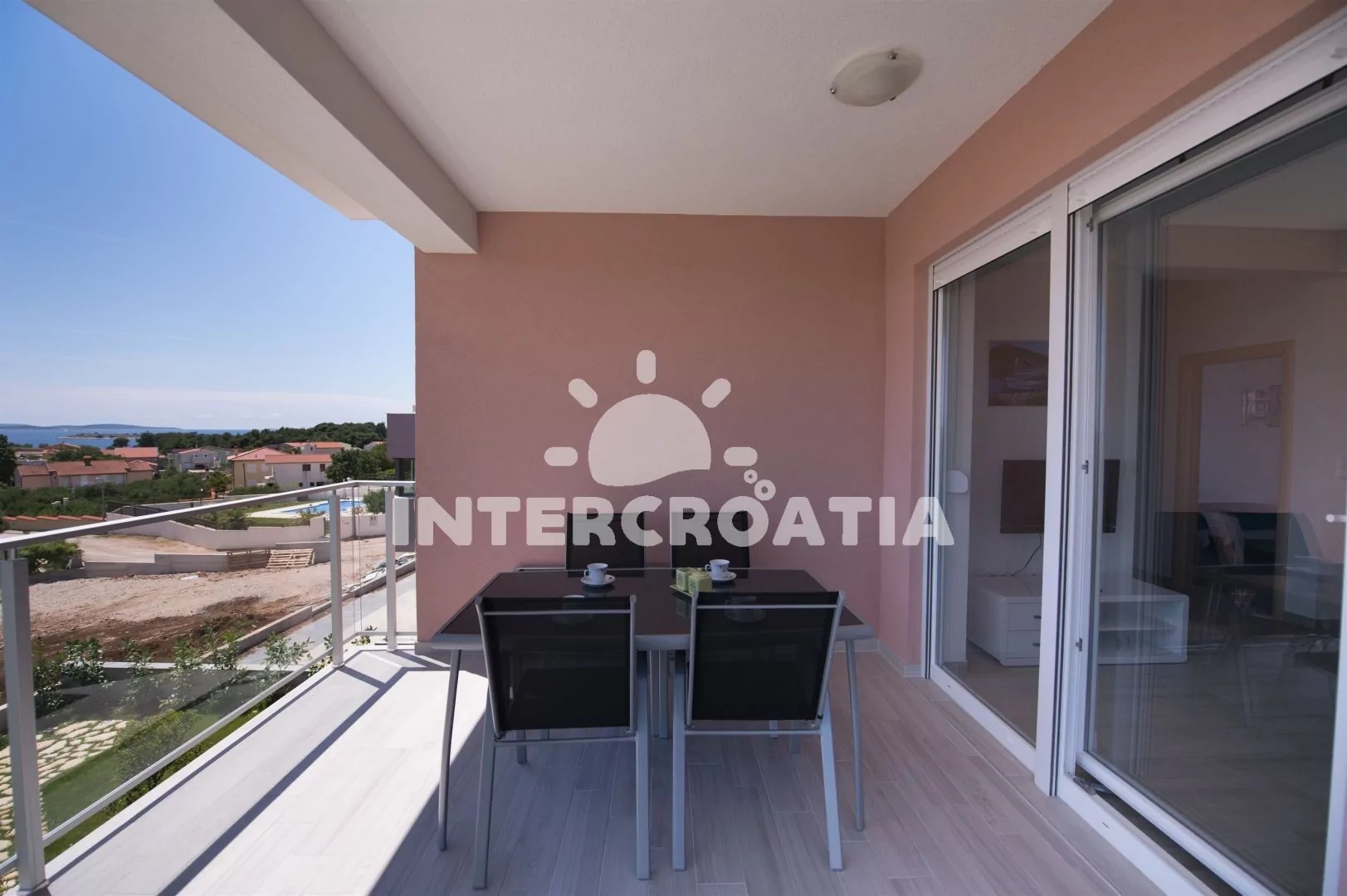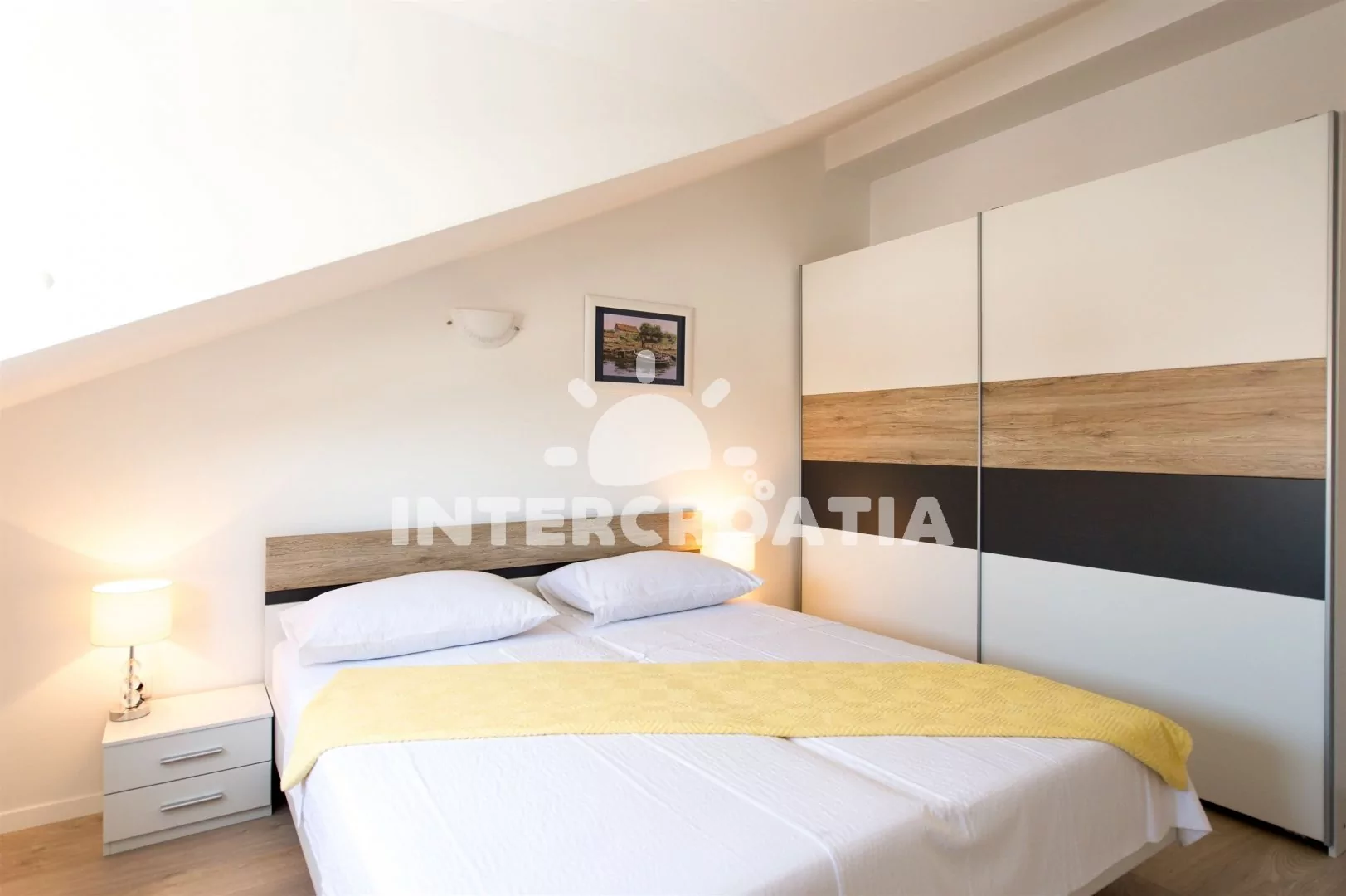 Dvoupatrový apartmán (92 m2) s výhledem na moře, vlastní terasou a balkonem je vhodný pro 6 až 8 osob. Obývací pokoj je spojený s kuchyní. Kuchyňská linka je vybavena sklokeramickou varnou deskou, digestoří, vestavěnou troubou, myčkou na nádobí, rychlovarnou konvicí, kávovarem, nádobím a lednicí s mrazákem. Obývací pokoj s jídelním stolem pro 6 osob, pohovkou (rozložitelná na extra lůžko pro 2 osoby), televizí se satelitním programem, klimatizací a vstupem na balkon. První i druhá ložnice je vybavena vždy s jedním dvoulůžkem a klimatizací. Třetí ložnice s dvěma jednolůžky a klimatizací. První koupelna se sprchovým koutem, umyvadlem, pračkou, fénem a wc. Druhá koupelna se sprchovým koutem, umyvadlem a wc. Hosté mají k dispozici zapůjčení cyklistických kol a parkování u objektu zdarma.