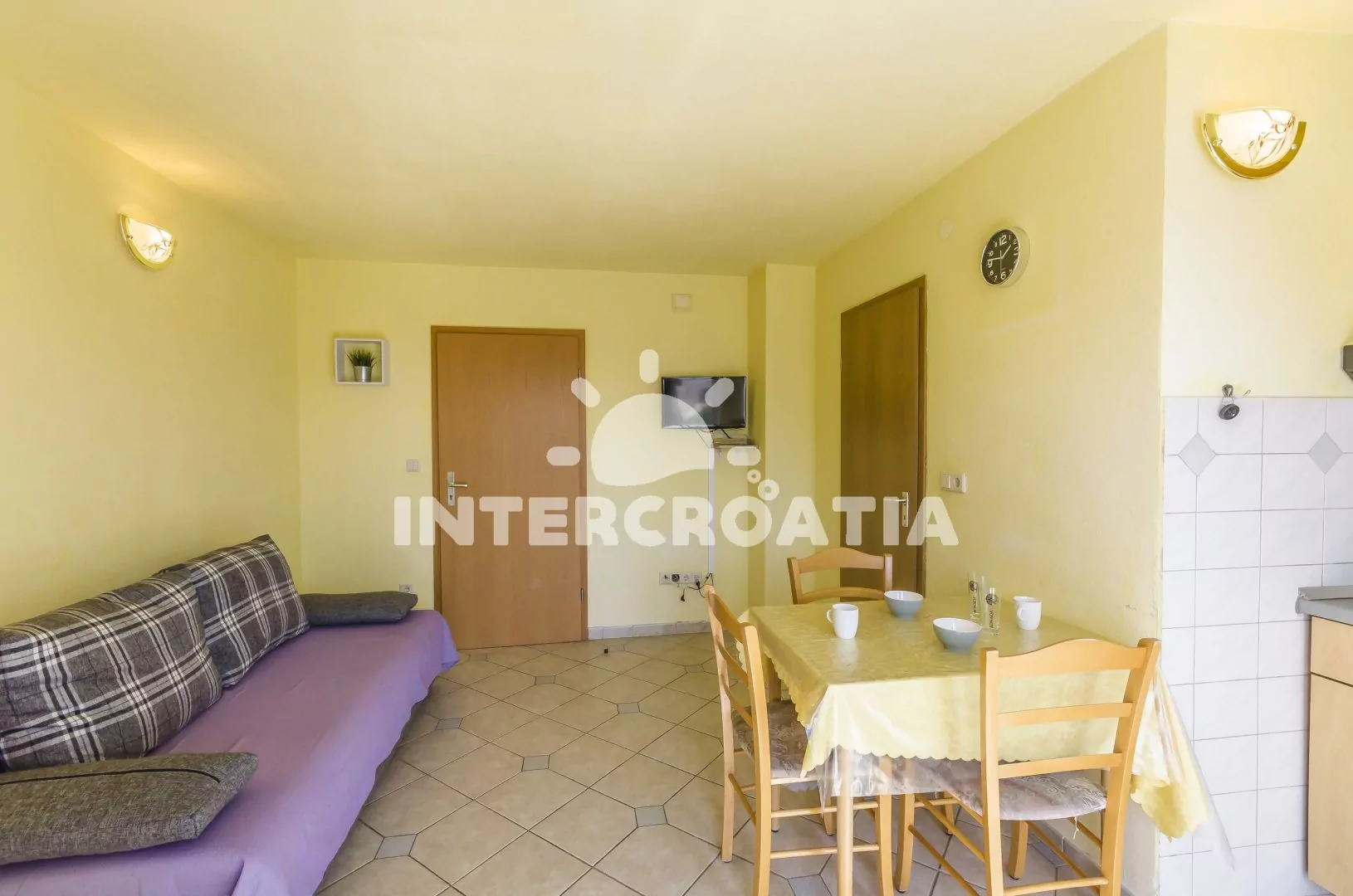 Apartmán s částečným výhledem na moře a vlastním balkonem se nachází v druhém patře domu a je vhodný pro 2 až 3 osoby. Obývací pokoj je spojený s kuchyní. Kuchyňská linka je vybavena dvouplotýnkovým sporákem, digestoří, rychlovarnou konvicí, kávovarem, nádobím a lednicí s mrazákem. Obývací pokoj s jídelním stolem pro 3 osoby, pohovkou (rozložitelná na extra lůžko pro 1 osobu), televizí, klimatizací a vstupem na balkon. Ložnice s jedním dvoulůžkem. Koupelna se sprchovým koutem, umyvadlem a wc. Hostům je k dispozici parkování u objektu zdarma.