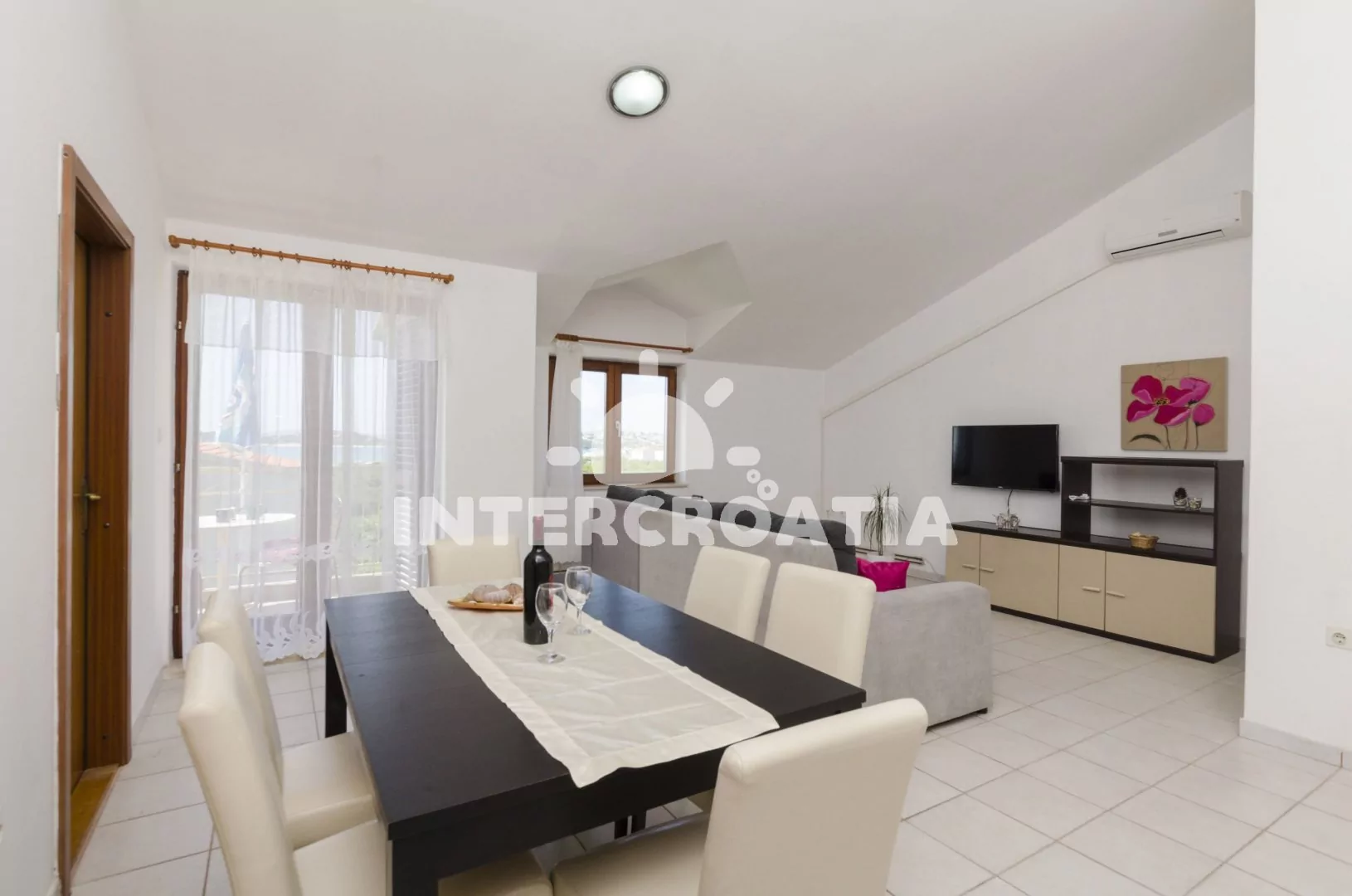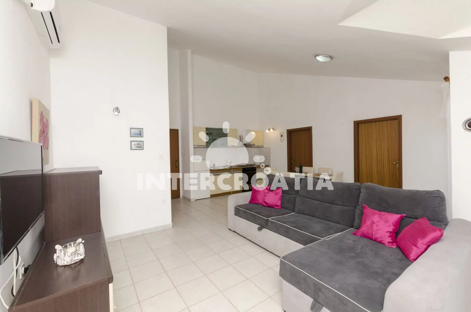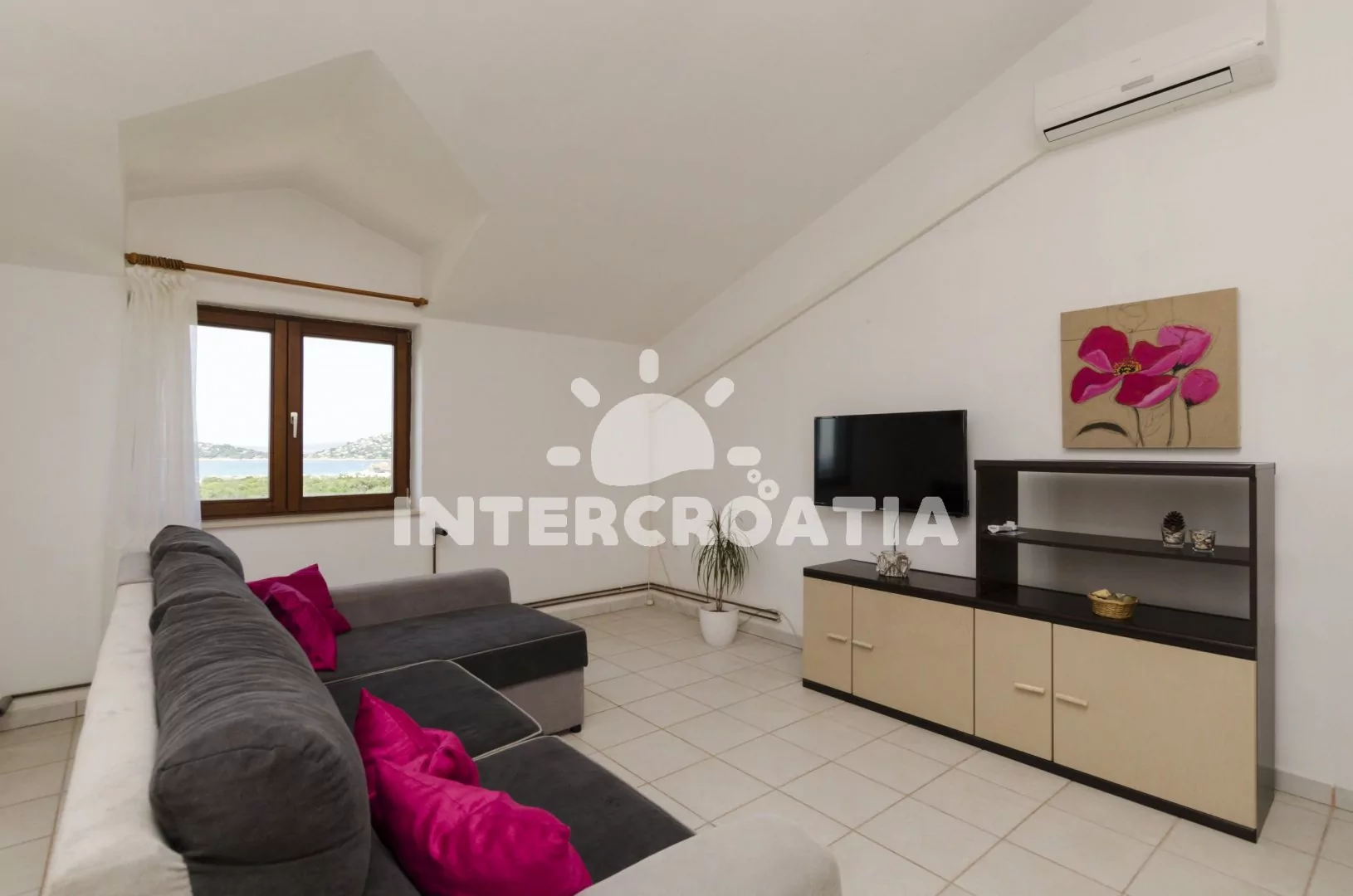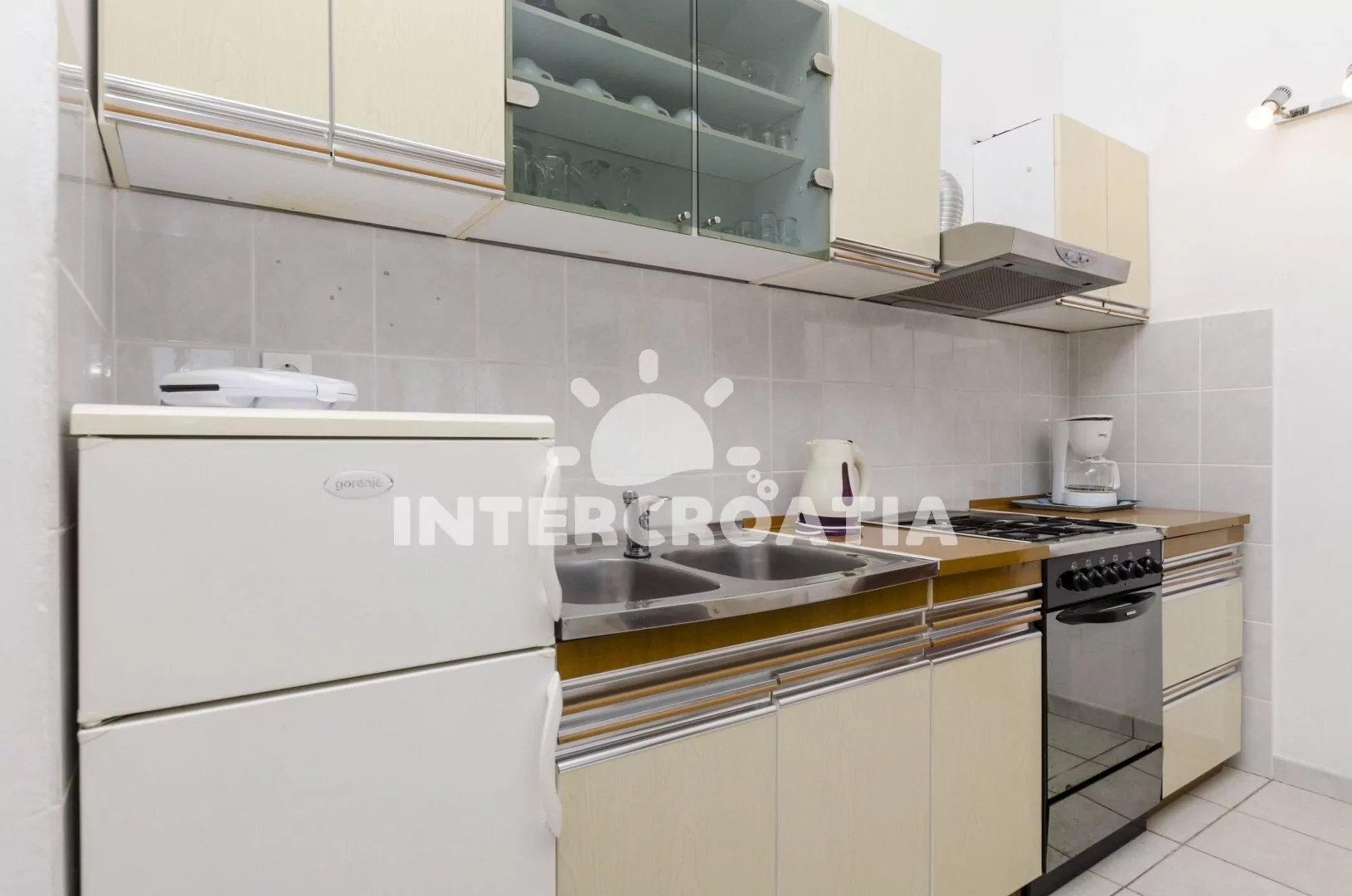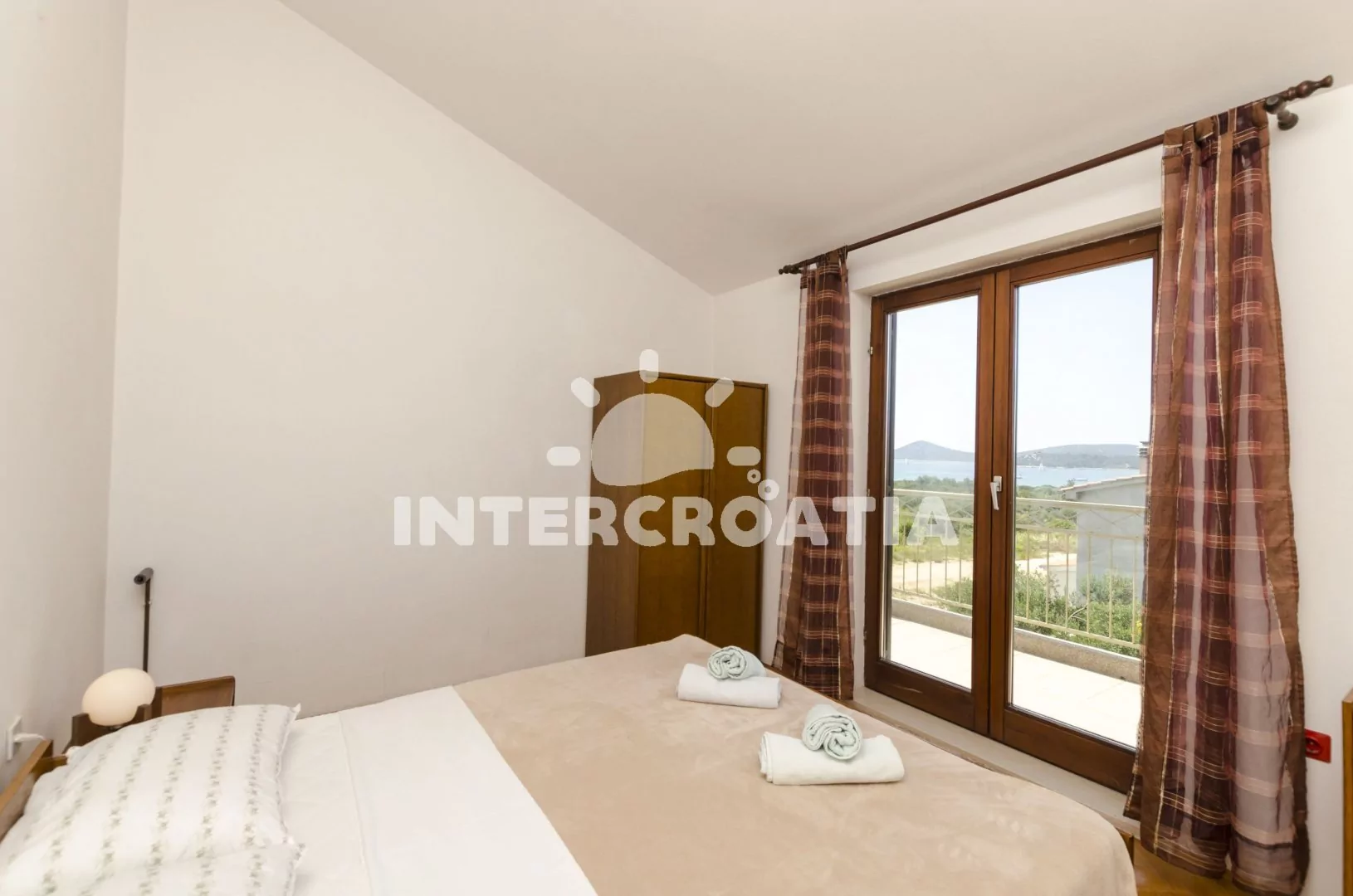Apartmán (65 m2) s vlastní terasou a výhledem na moře se nachází v prvním patře domu a je vhodný pro 4 až 5 osob. Obývací pokoj je spojený s kuchyní. Kuchyňská linka je vybavena sporákem, digestoří, troubou, kávovarem, rychlovarnou konvicí, nádobím a lednicí s mrazákem. Obývací pokoj s jídelním stolem pro 6 osob, rohovou pohovkou (rozložitelná na extra lůžko pro 1 osobu), televizí se satelitním programem, klimatizací a vstupem na terasu. První ložnice s dvoulůžkem a vstupem na balkon. Druhá ložnice s dvěma jednolůžky. Koupelna se sprchovým koutem, umyvadlem a wc. Hostům je k dispozici parkování u objektu zdarma.