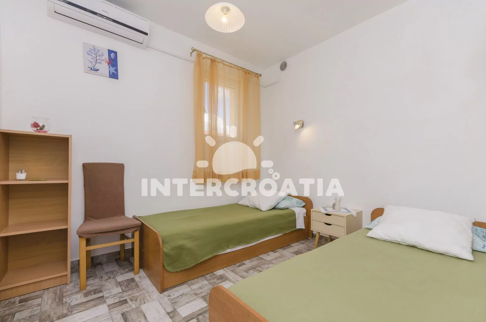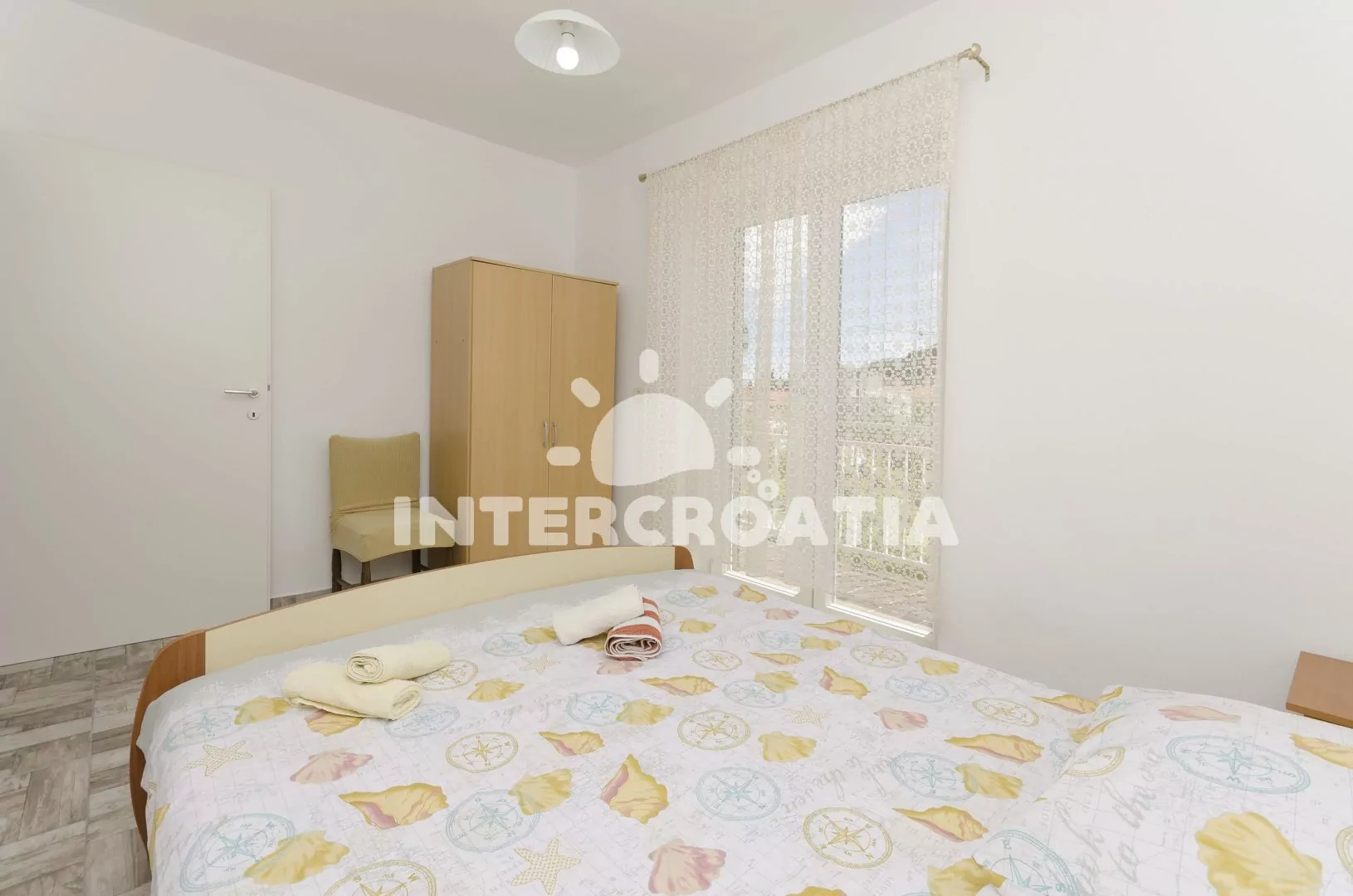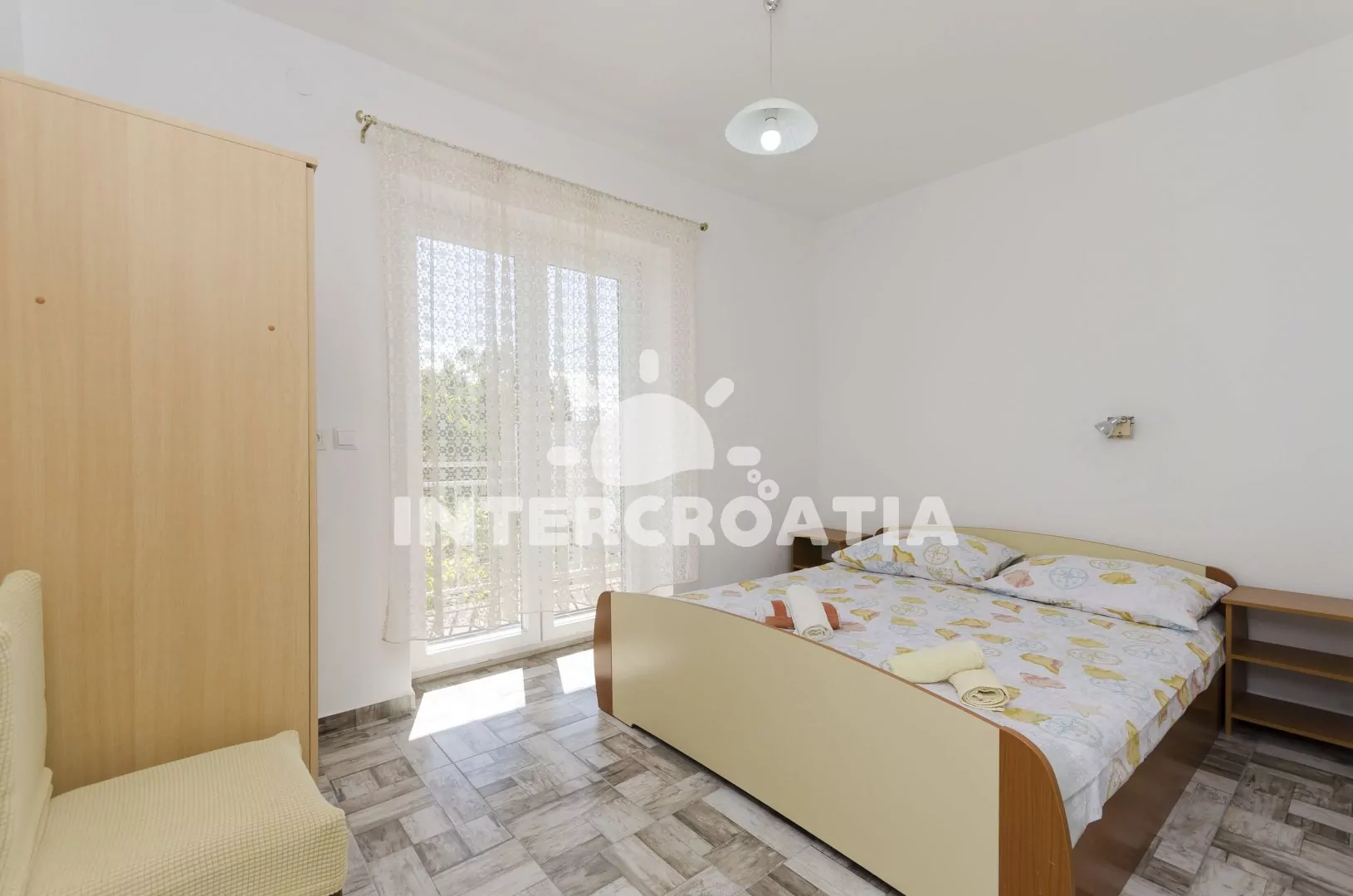 Apartmán (40 m2) s krásnou terasou a balkonem je umístěný v prvním patře a je vhodný pro 4 osoby. Obývací pokoj je spojený s kuchyní. Kuchyňská linka je vybavena sporákem, troubou, rychlovarnou konvicí, nádobím a lednicí s mrazákem. Obývací pokoj s jídelním stolem pro 4 osoby, pohovkou, televizí, klimatizací a vstupem na terasu. První ložnice je vybavena jedním dvoulůžkem. Druhá ložnice s dvěma jednolůžky. Koupelna se sprchovým koutem, umyvadlem a wc. Hostům je k dispozici parkování u objektu zdarma.