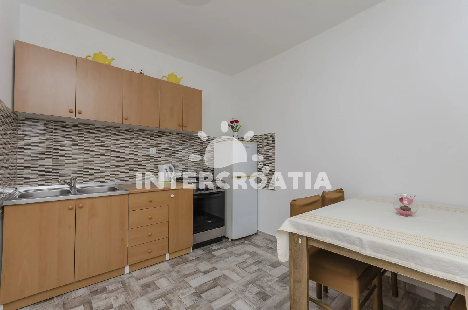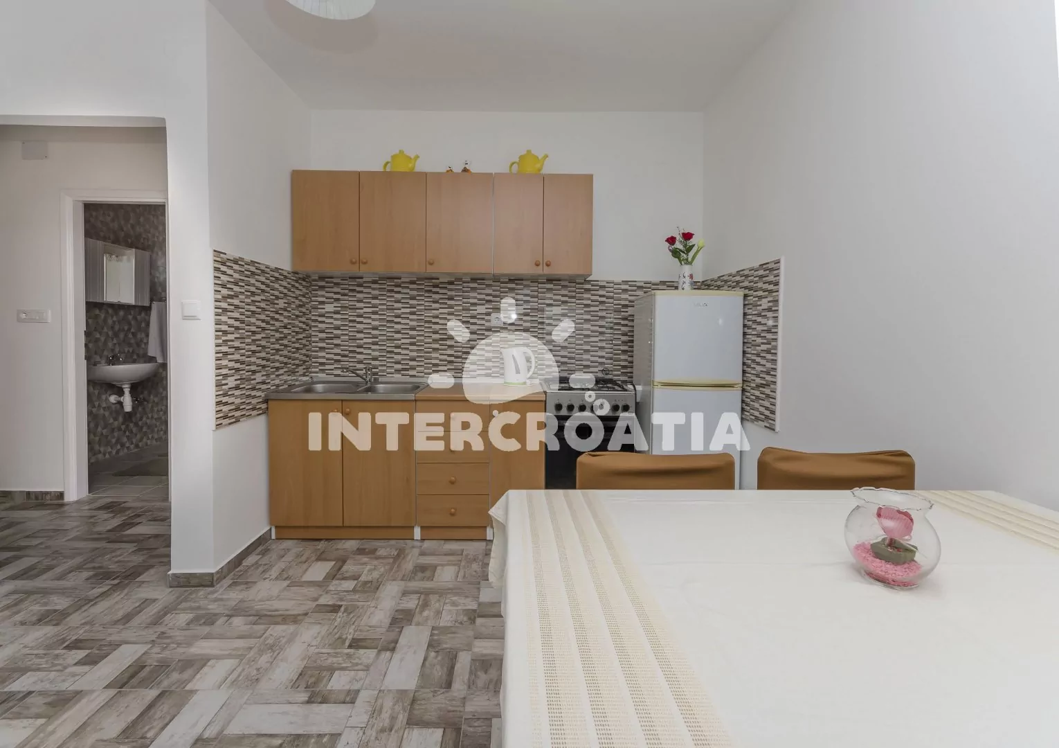 Apartmán (40 m2) s krásnou terasou a balkonem je umístěný v prvním patře a je vhodný pro 4 osoby. Obývací pokoj je spojený s kuchyní. Kuchyňská linka je vybavena sporákem, troubou, rychlovarnou…