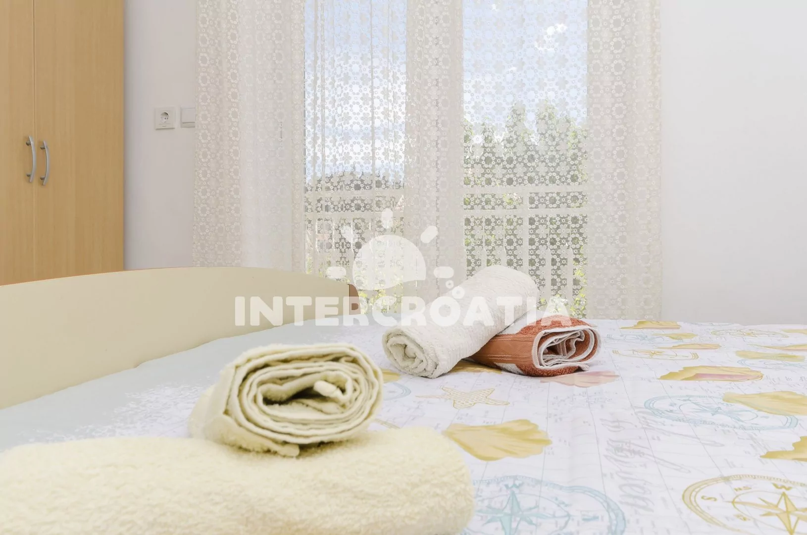 Vzdálenosti: Moře a pláž 300 m, velká oblázková pláž 800 m, centrum 250 m, supermarket 200 m, restaurace, veřejná doprava, pošta, bar, směnárna 300 m, přístav 400 m, lékárna 800 m, čerpací stanice 3 km, letiště 68 km, trajekt 98 km.