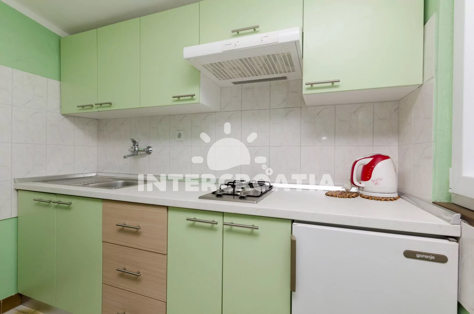 Vzdálenosti: Moře a oblázková pláž 50 m, centrum, půjčovna cyklistických kol 50 m, supermarket, restaurace, bar 30 m, lékárna, ambulance, směnárna, veřejná doprava 300 m, pošta 400 m, přístav 500 m, diskotéka, čerpací stanice 3 km, trajekt 20 km, letiště 62 km.