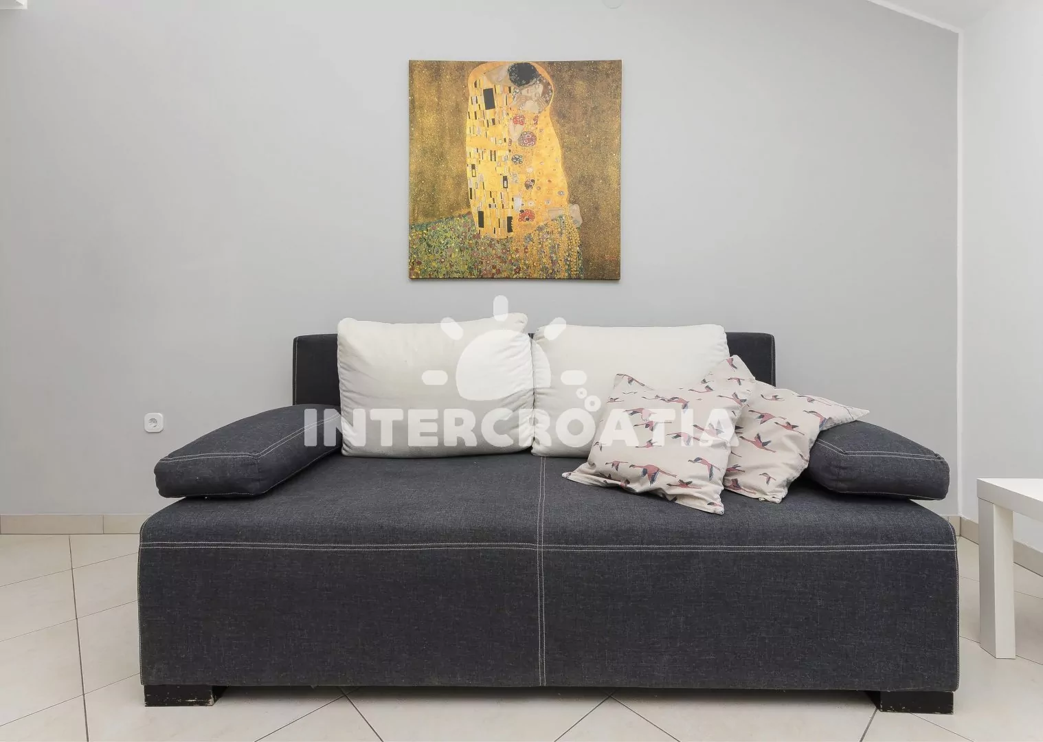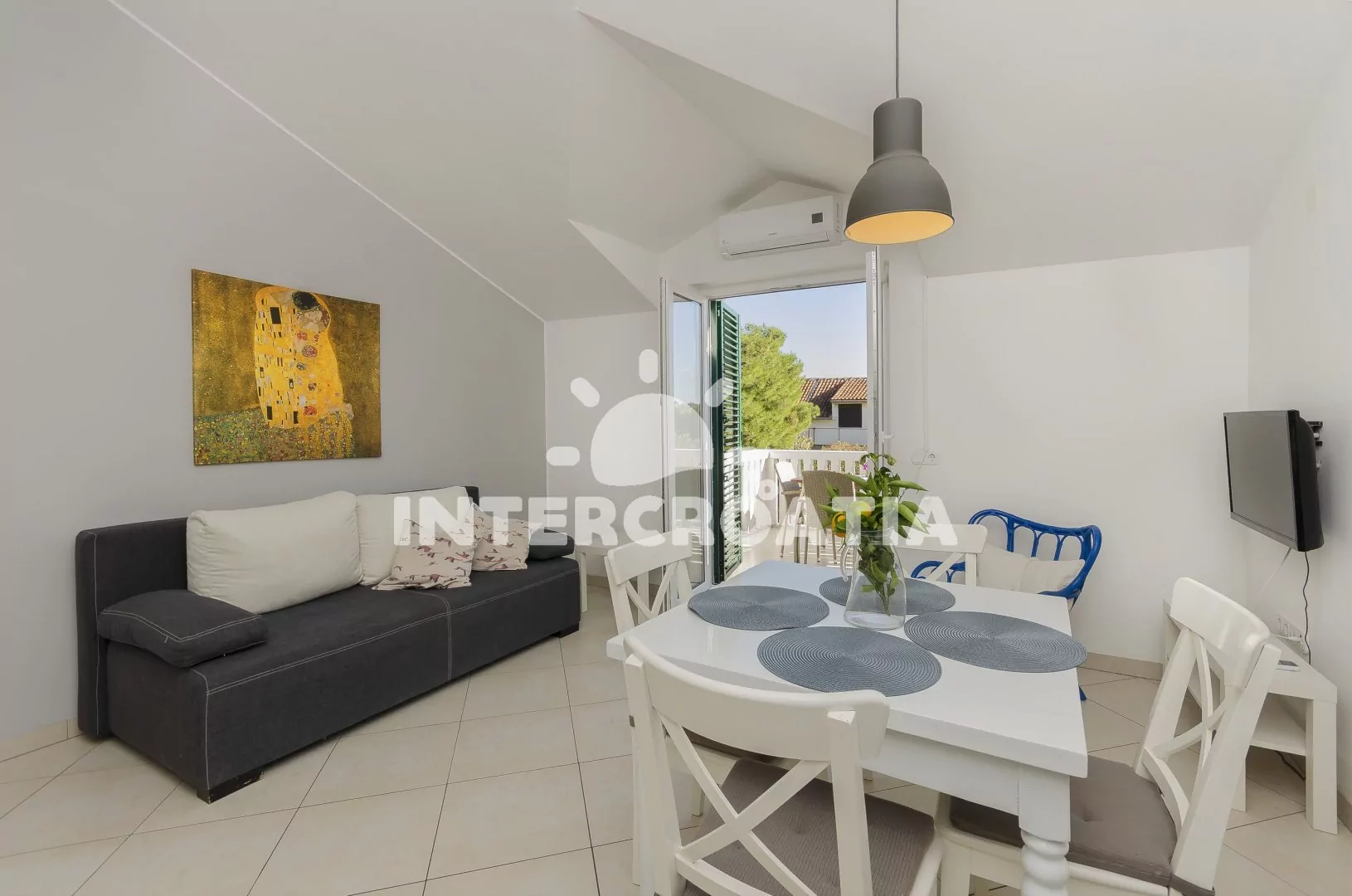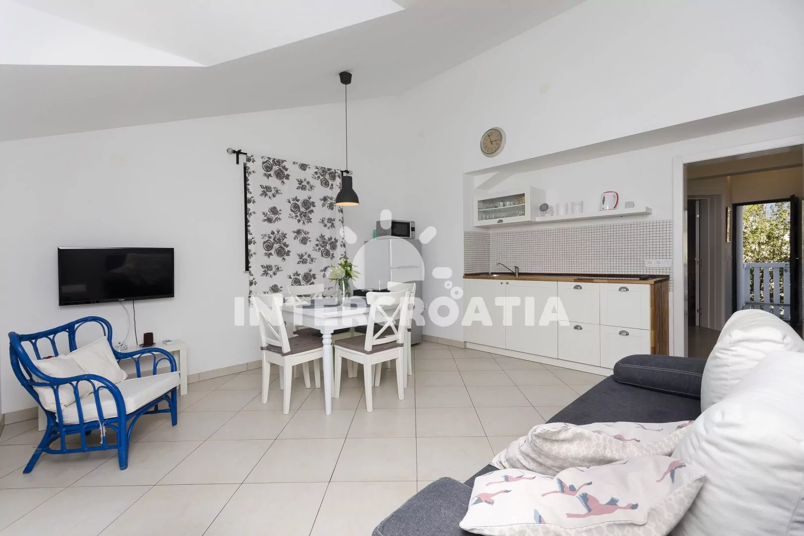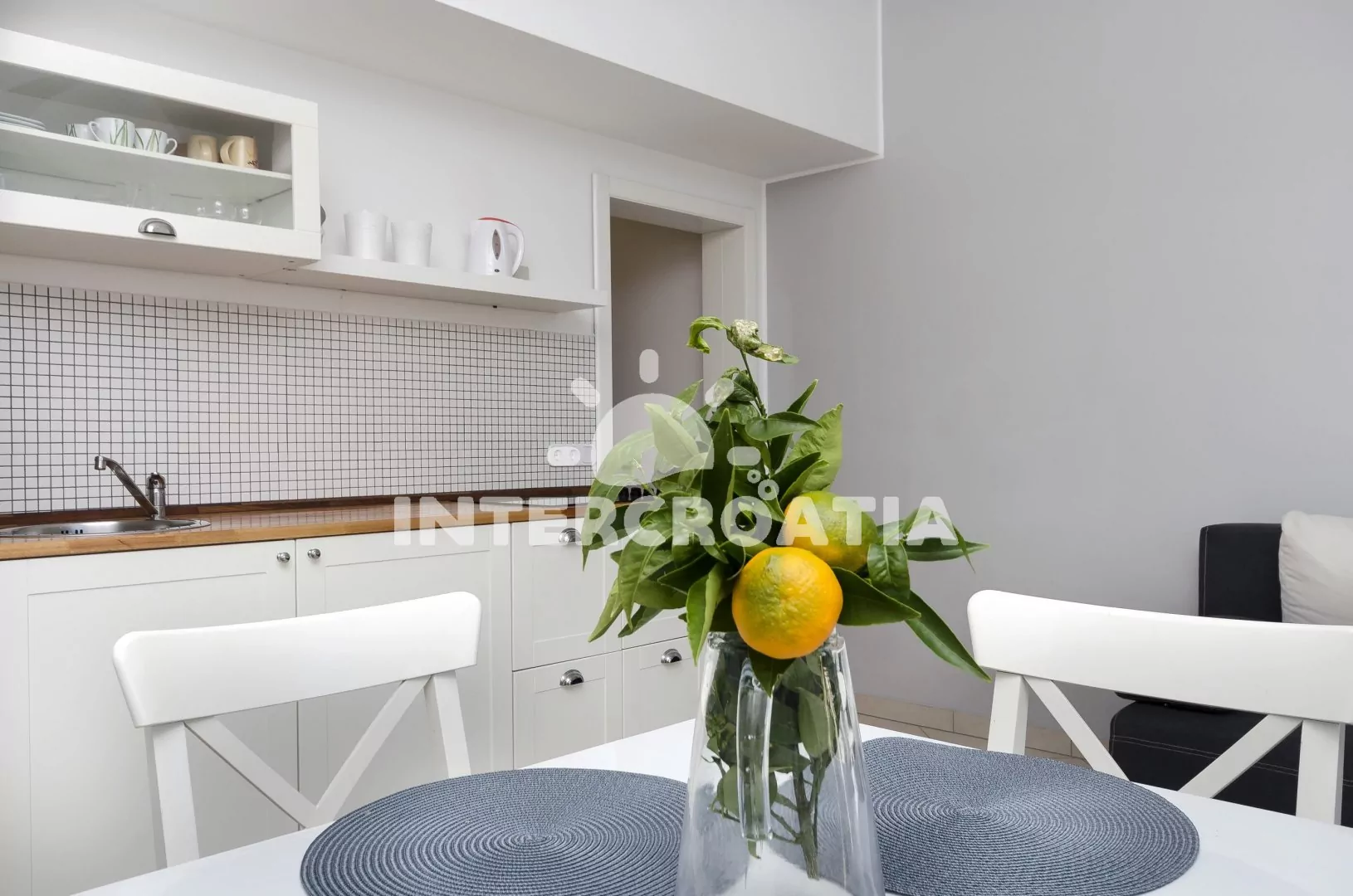 Moderně zařízený apartmán (45 m2) s terasou, výhledem do zahrady a klidné ulice. Apartmán se nachází v 1. patře domu a je vhodný pro 2 až 4 osoby. Obývací pokoj je spojený s kuchyní. Kuchyňská linka je vybavena varnou deskou, mikrovlnnou troubou, myčkou na nádobí, rychlovarnou konvicí, kávovarem, nádobím a lednicí s mrazákem. Obývací pokoj s jídelním stolem pro 4 osoby, pohovkou (rozložitelná na extra lůžko pro 2 osoby), televizí, klimatizací a vstupem na terasu. Ložnice s jedním dvoulůžkem. Koupelna se sprchovým koutem, umyvadlem a wc. Hostům je k dispozici parkování u objektu zdarma.