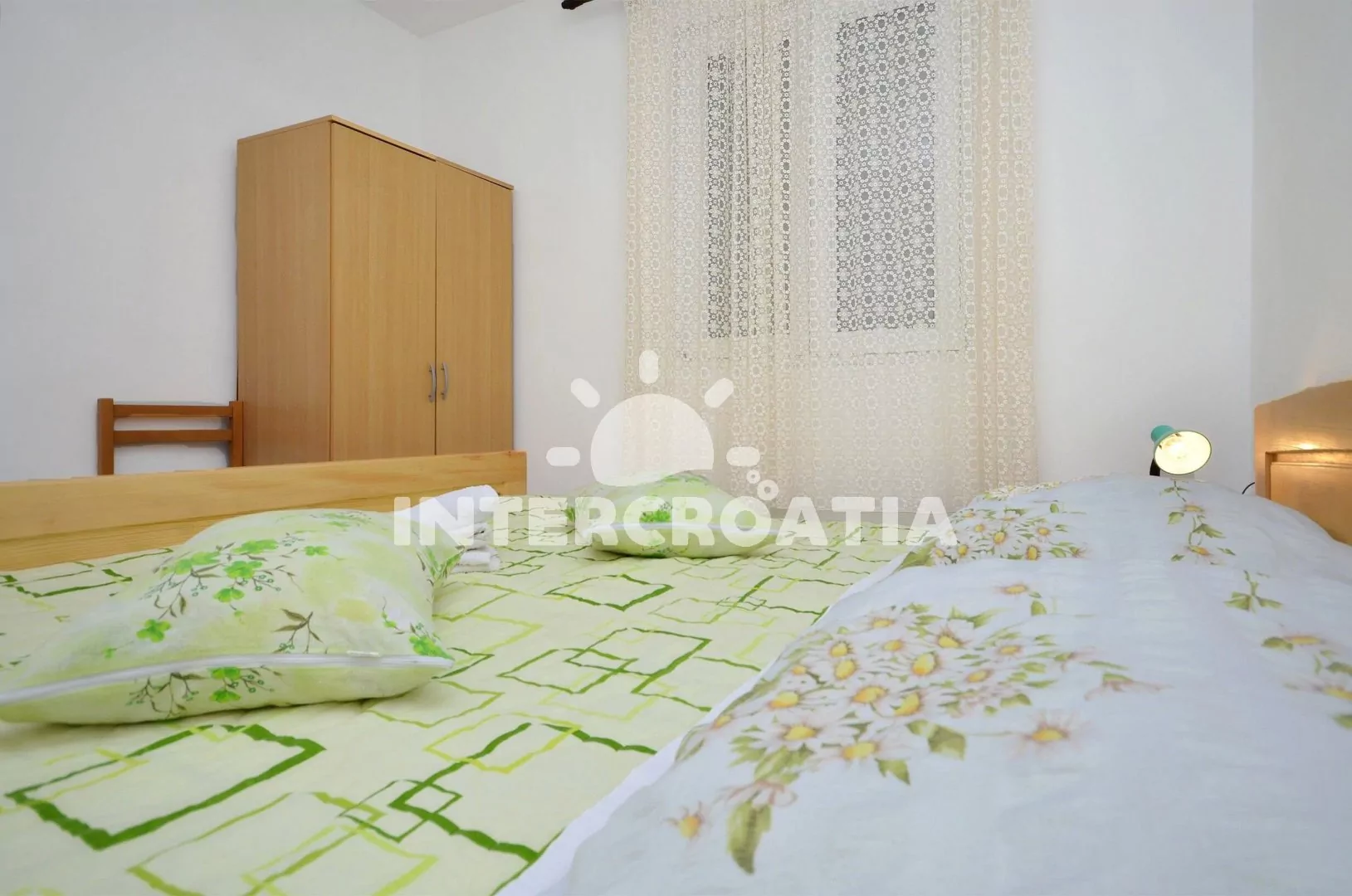 Apartmán (44 m2) s terasou a venkovním posezením se nachází v přízemí domu. Apartmán má 1 ložnici a je vhodný pro 2 až 4 osoby. Obývací pokoj je spojený s kuchyní. Kuchyňská linka je vybavena sporákem s troubou, rychlovarnou konvicí, nádobím a lednicí s mrazákem. Obývací pokoj s jídelním stolem pro 4 osoby, pohovkou (rozložitelná na extra lůžko pro 2 osoby), televizí se satelitním programem, klimatizací a vstupem na terasu. Ložnice s jedním dvoulůžkem. Koupelna s vanou, umyvadlem a wc. Hostům je k dispozici parkování u objektu zdarma.