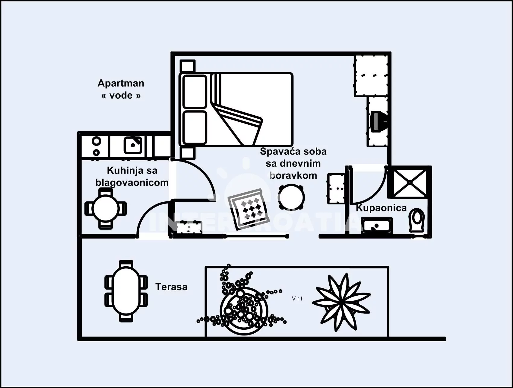Apartmán (25 m2) s terasou a venkovním posezením se nachází v suterénu domu. Apartmán má 1 ložnici a je vhodný pro 2 osoby. Kuchyň s jídelním stolem, kuchyňskou linkou a vstupem na terasu. Kuchyňská…