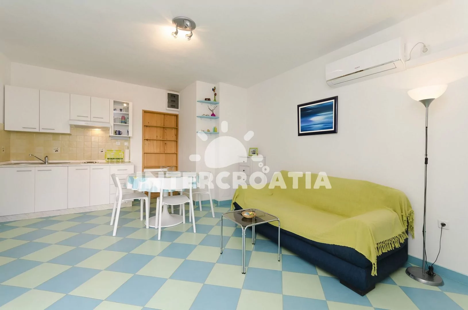 Apartmán (40 m2) s terasou a venkovním posezením se nachází ve zvýšeném přízemí domu. Apartmán má 1 ložnici a je vhodný pro 2 až 4 osoby. Obývací pokoj je spojený s kuchyní. Kuchyňská linka je vybavena dvouplotýnkovým vařičem, rychlovarnou konvicí, toustovačem, nádobím a lednicí s mrazákem. Obývací pokoj s jídelním stolem, pohovkou (rozložitelná na extra lůžko pro 2 osoby), televizí se satelitním programem a klimatizací. Ložnice s jedním dvoulůžkem. Koupelna se sprchovým koutem, umyvadlem, fénem a wc. Hostům je k dispozici parkování u objektu zdarma.