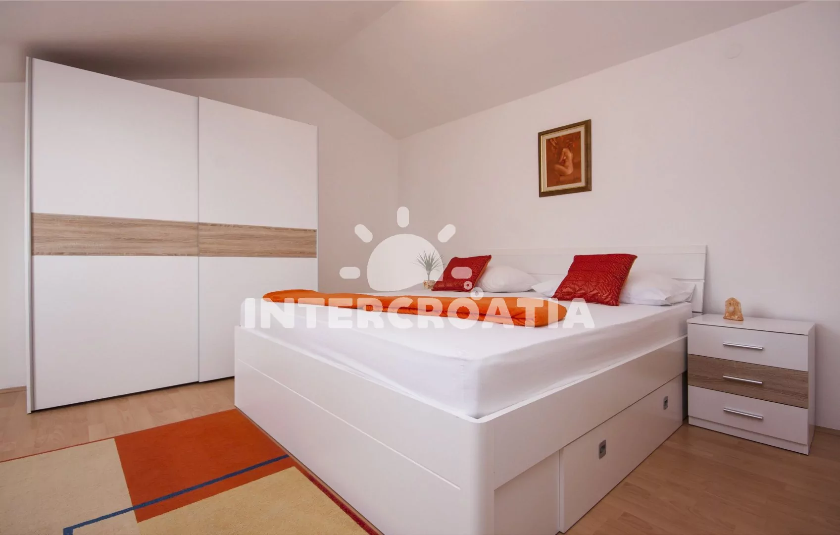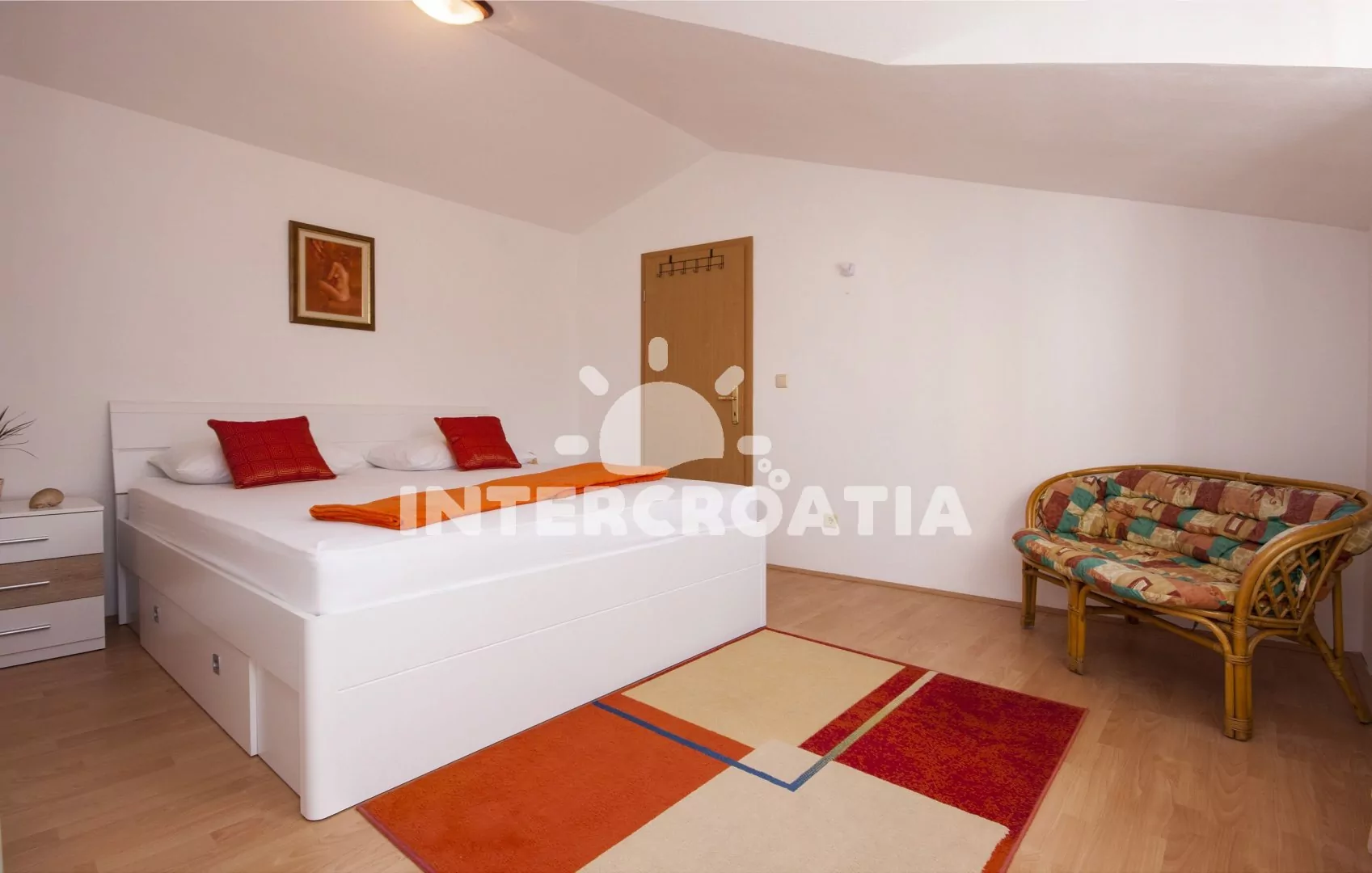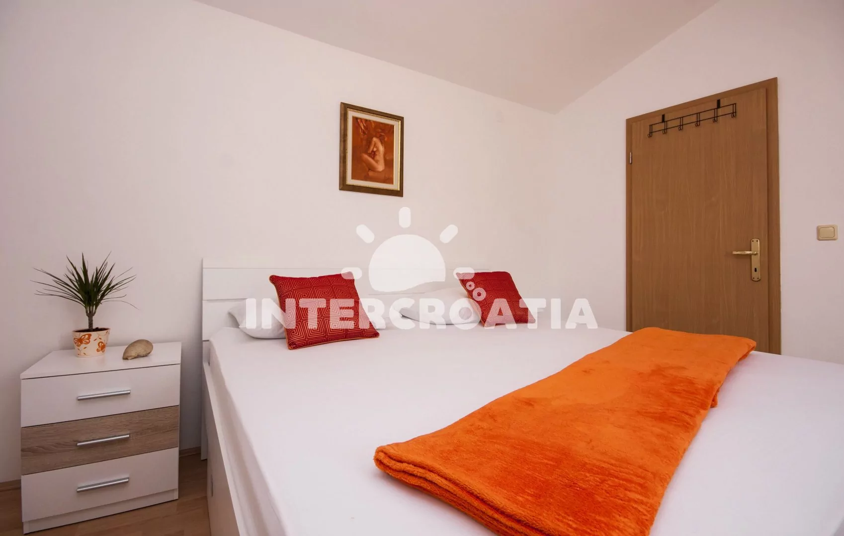 Apartmán (100 m2) s balkonem, terasou, venkovním posezením a výhledem na moře se nachází ve 2. patře domu. Apartmán má 2 ložnice a je vhodný pro 4 až 5 osob. Obývací pokoj je spojený s kuchyní. Kuchyňská linka je vybavena varnou deskou, digestoří, vestavěnou troubou, myčkou na nádobí, mikrovlnnou troubou, toustovačem, rychlovarnou konvicí, nádobím a lednicí s mrazákem. Obývací pokoj s jídelním stolem, pohovkou (rozložitelná na extra lůžko pro 1 osobu), televizí se satelitním programem, rádiem, klimatizací a vstupem na balkon/terasu. První i druhá ložnice je vybavena vždy s jedním dvoulůžkem. Koupelna se sprchovým koutem, umyvadlem, fénem a wc. Hostům je k dispozici parkování u objektu zdarma.