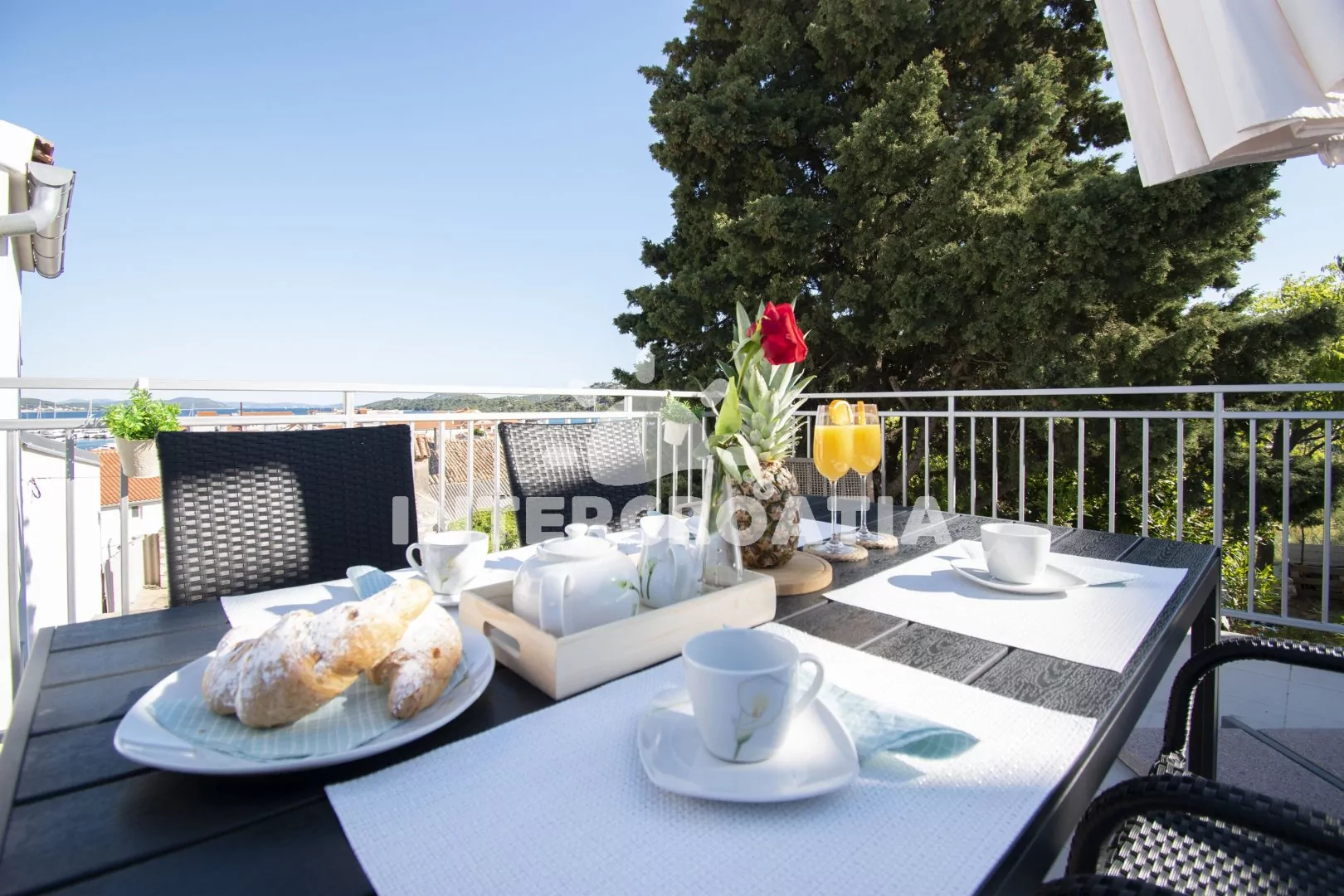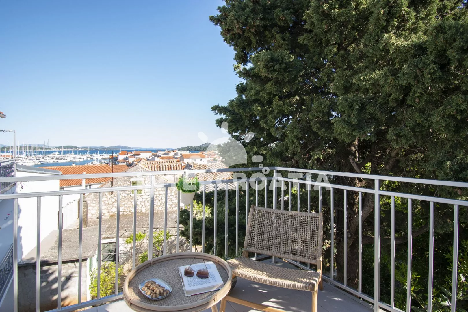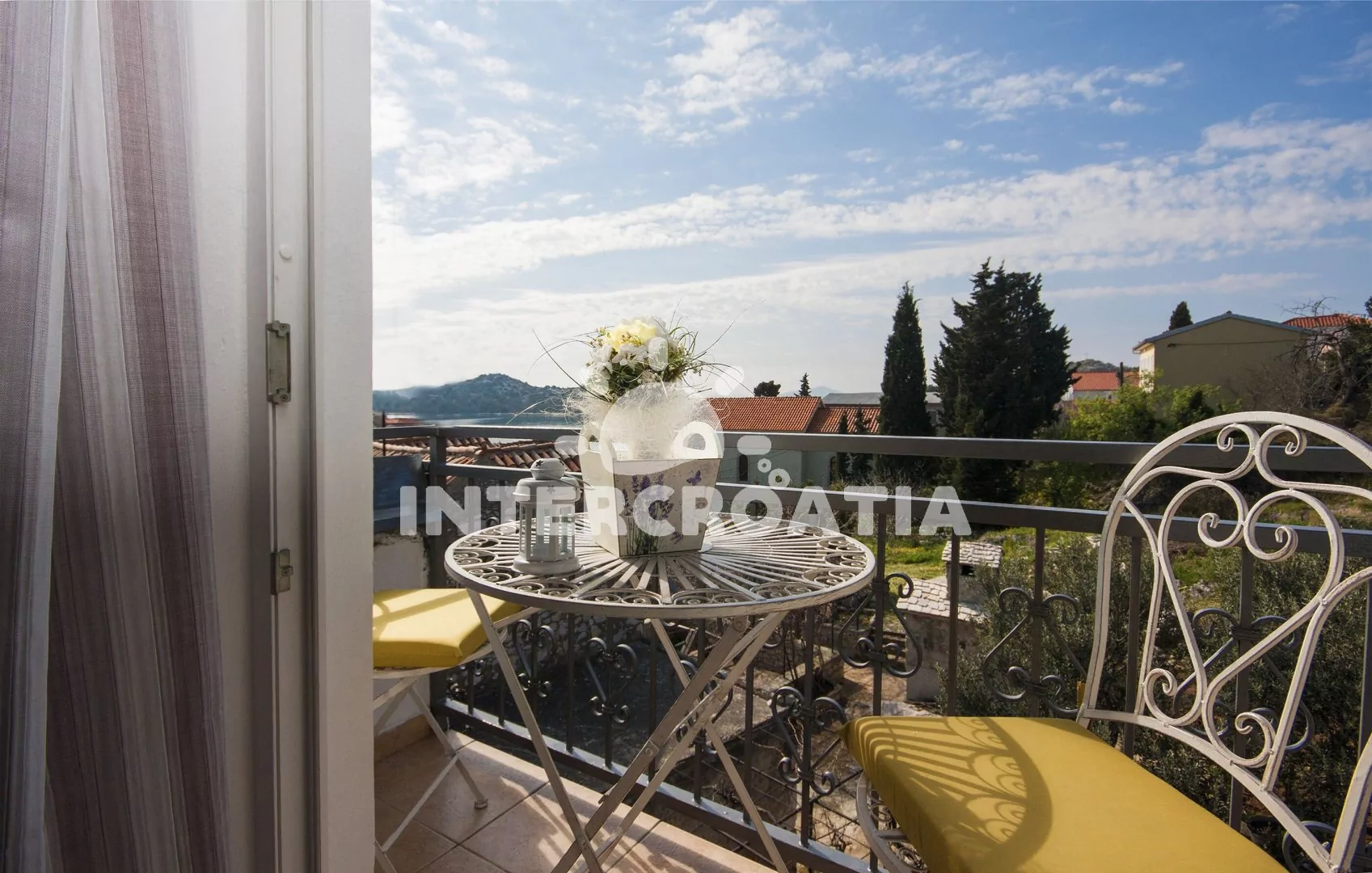 Apartmán (100 m2) s balkonem, terasou, venkovním posezením a výhledem na moře se nachází ve 2. patře domu. Apartmán má 2 ložnice a je vhodný pro 4 až 5 osob. Obývací pokoj je spojený s kuchyní. Kuchyňská linka je vybavena varnou deskou, digestoří, vestavěnou troubou, myčkou na nádobí, mikrovlnnou troubou, toustovačem, rychlovarnou konvicí, nádobím a lednicí s mrazákem. Obývací pokoj s jídelním stolem, pohovkou (rozložitelná na extra lůžko pro 1 osobu), televizí se satelitním programem, rádiem, klimatizací a vstupem na balkon/terasu. První i druhá ložnice je vybavena vždy s jedním dvoulůžkem. Koupelna se sprchovým koutem, umyvadlem, fénem a wc. Hostům je k dispozici parkování u objektu zdarma.