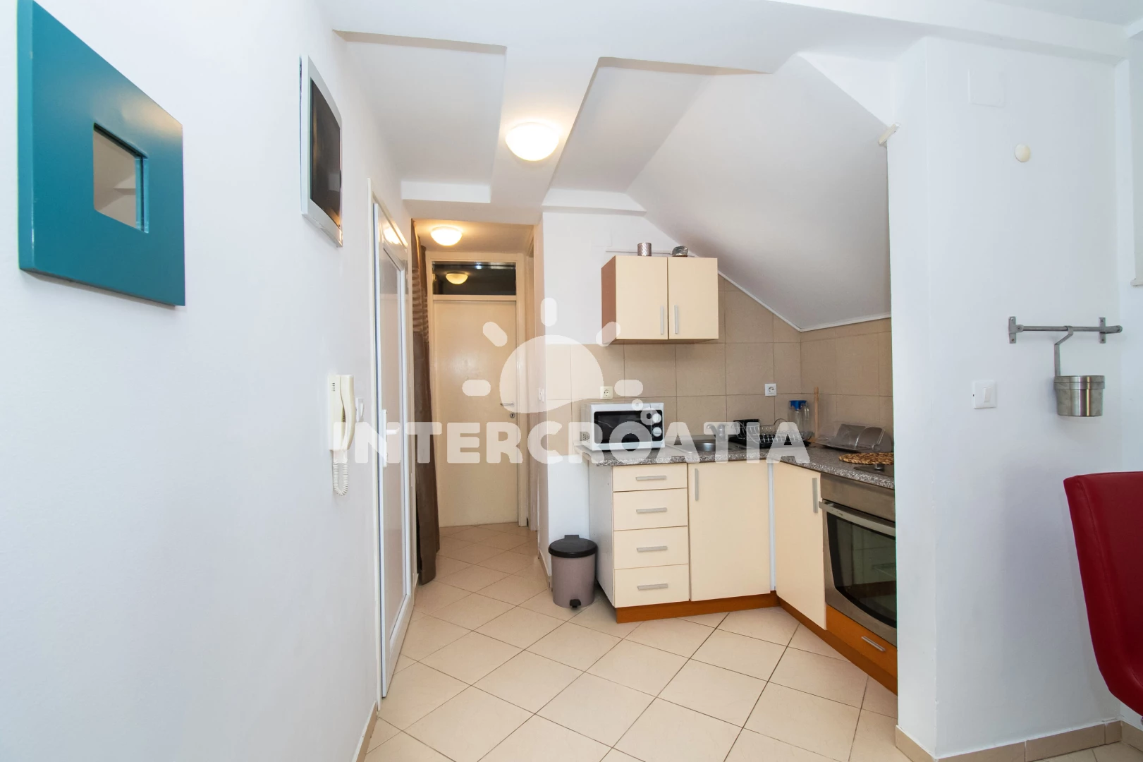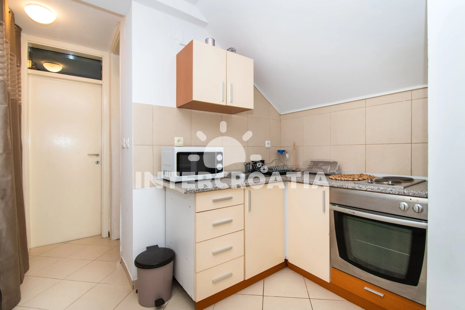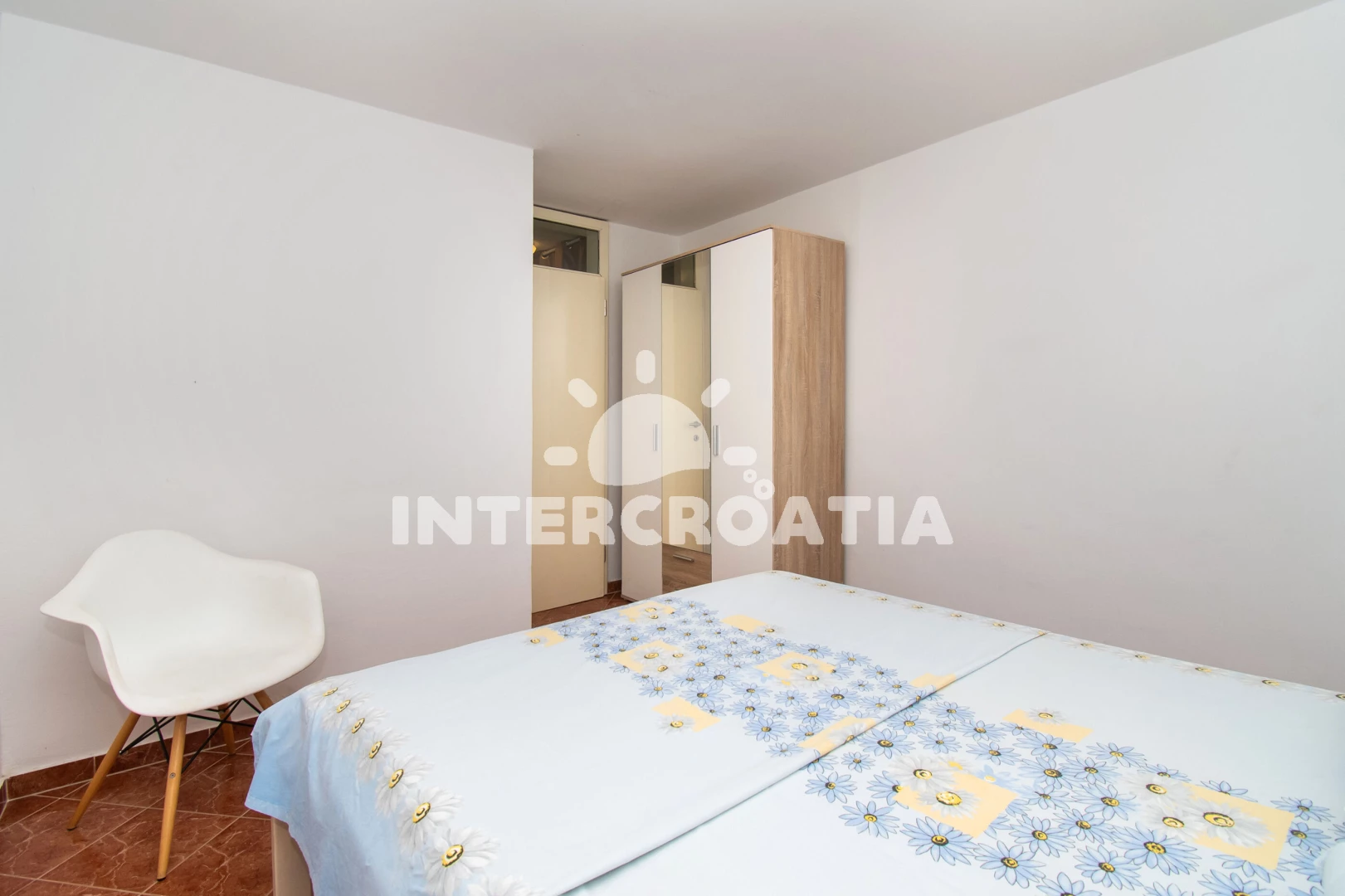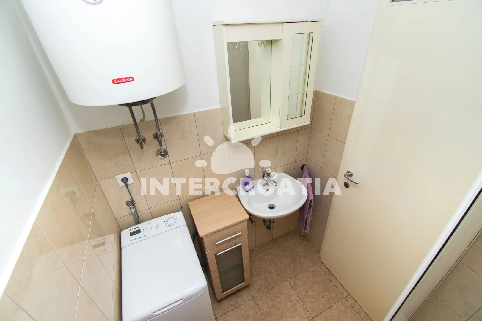 Apartmán se nachází 65 m od moře a pláže. Pláž je skalnatá, oblázková, větší kamení a betonové desky.