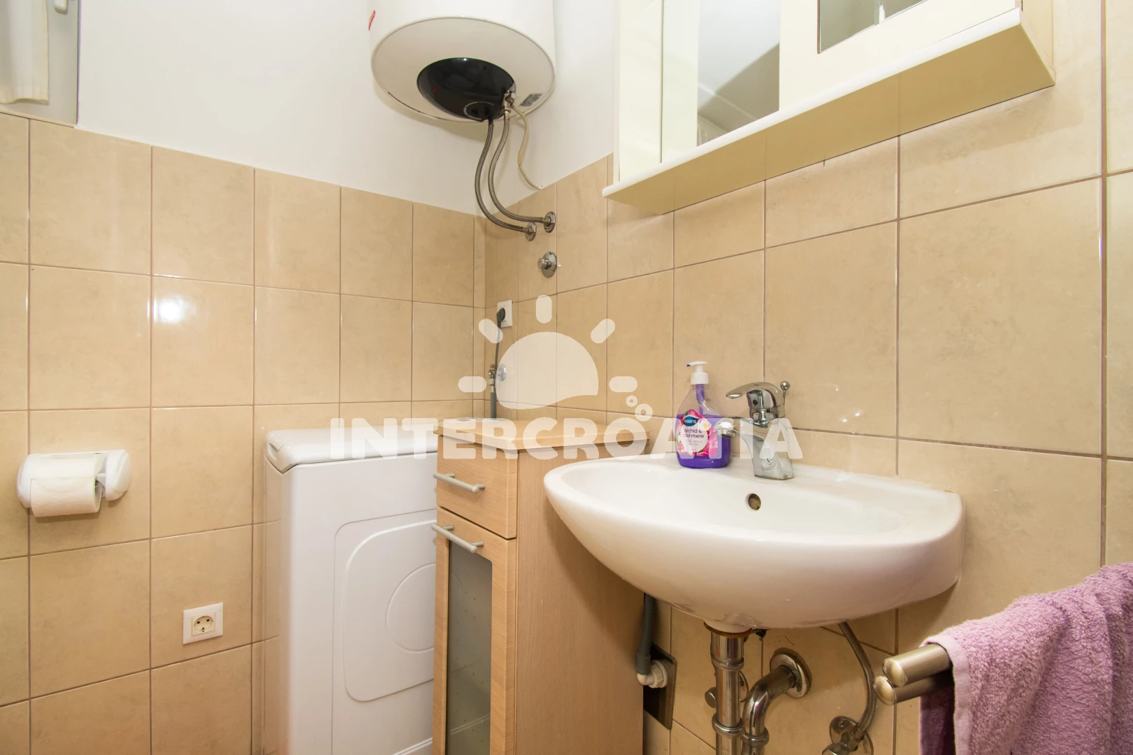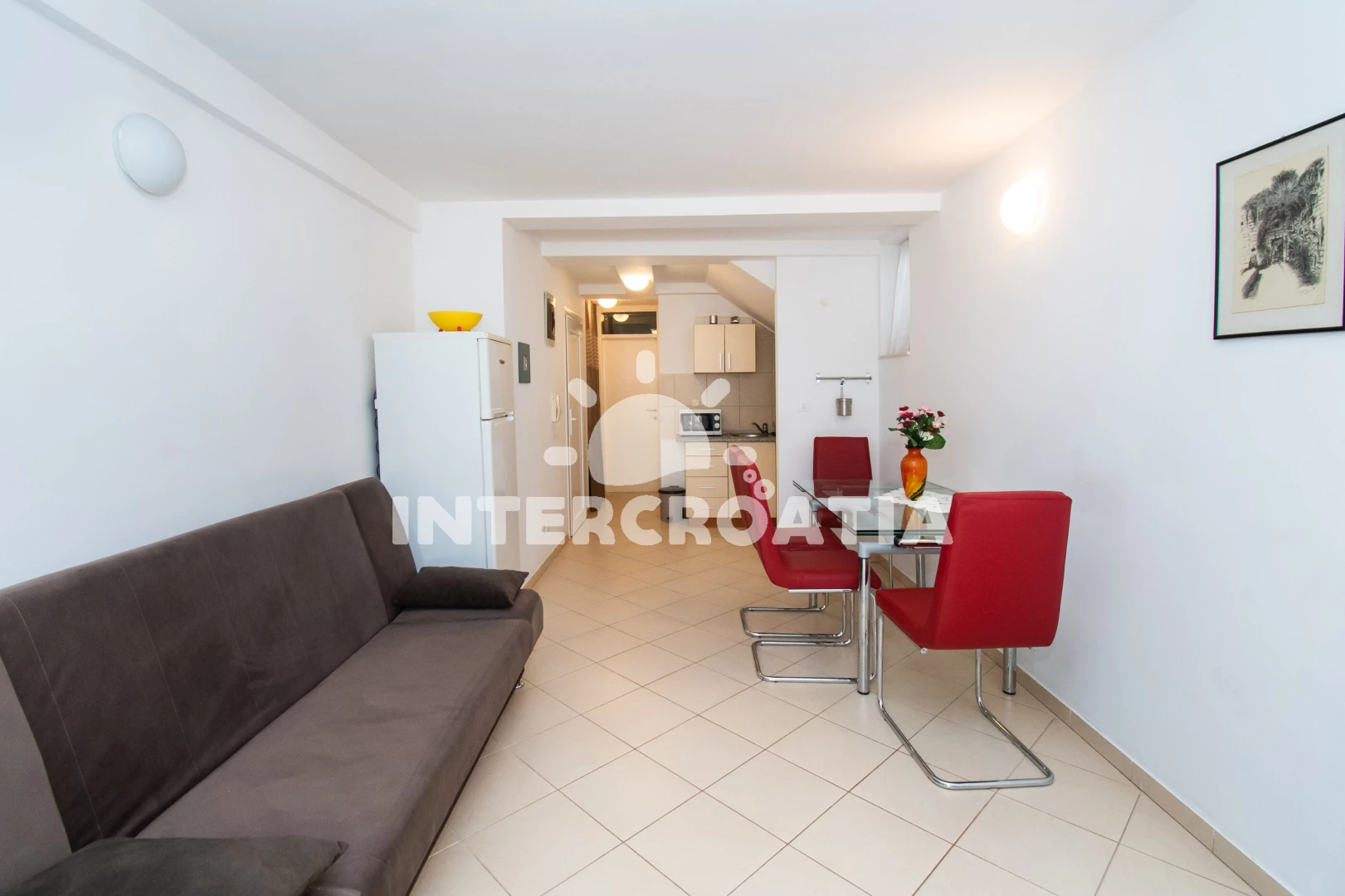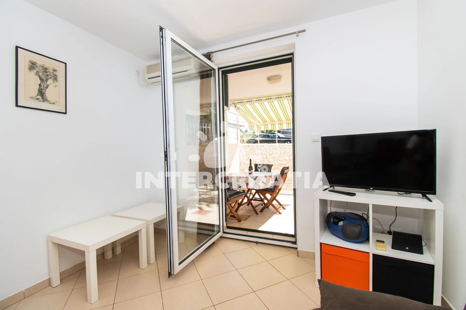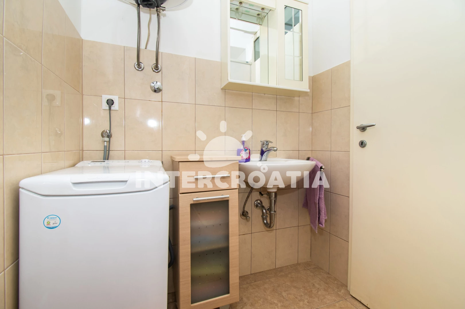 Apartmán se nachází 65 m od moře a pláže. Pláž je skalnatá, oblázková, větší kamení a betonové desky.