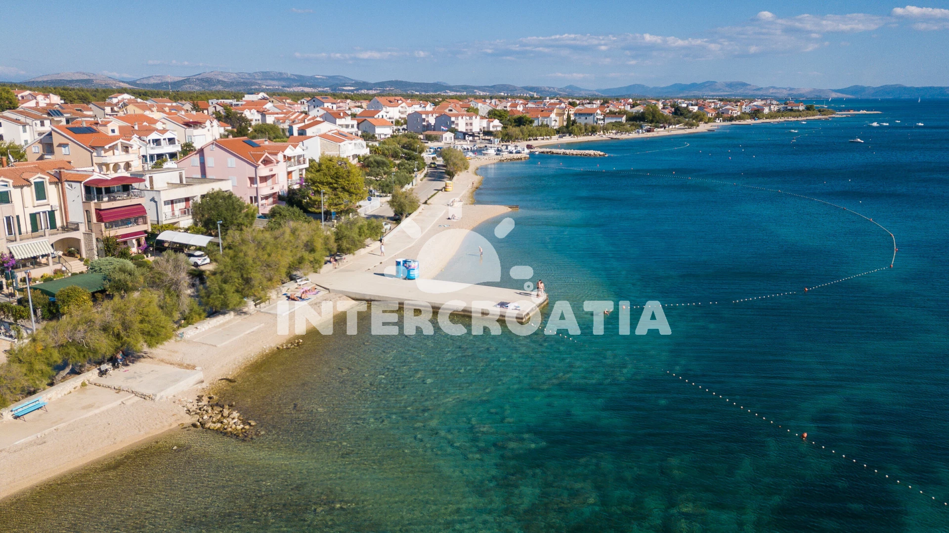 Vzdálenosti: Moře 20 m, pláž 20 m (oblázková a betonové desky), restaurace 50 m, bar 150 m, tenisové kurty 300 m, supermarket 500 m, ambulance 1,4 km, lékárna 1,4 km, centrum 1,5 km, pošta 1,8 km, diskotéka 2 km, banka 2 km, letiště (Zadar) 60 km,