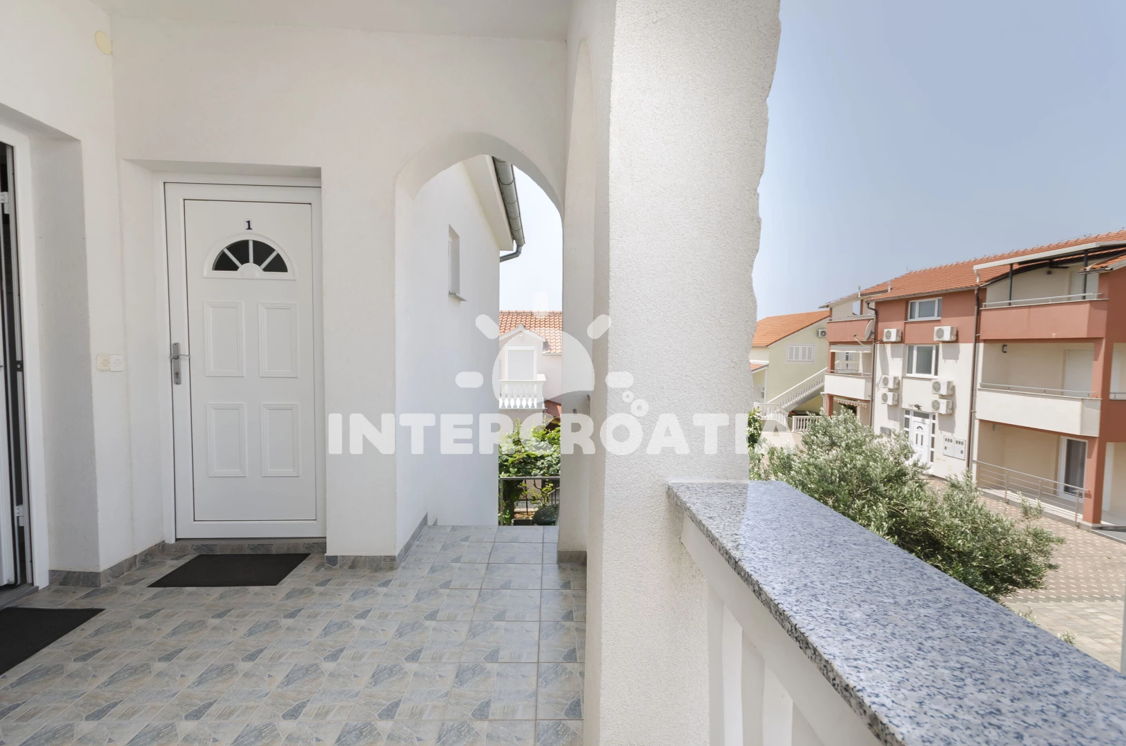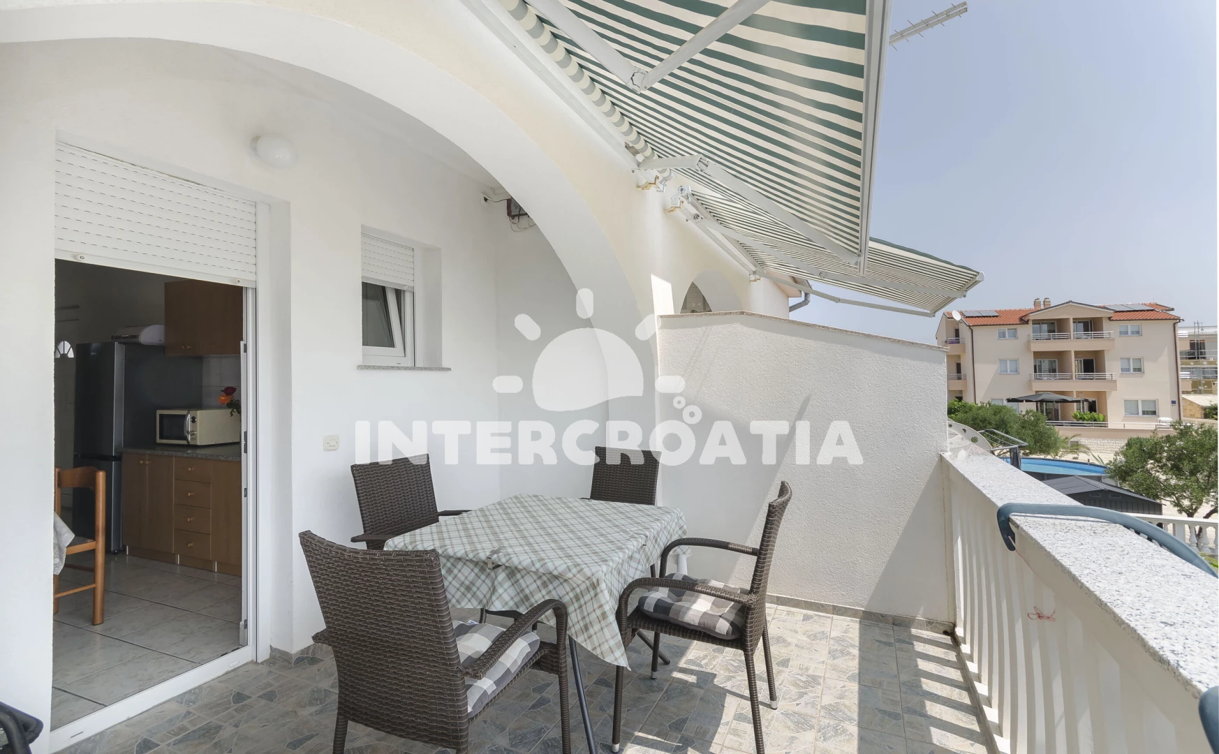 Vzdálenosti: Moře 650 m, pláž 1 km (oblázková a betonové desky), supermarket 500 m, restaurace 800 m, čerpací stanice 900 m, marina 1,1 km, banka 1,3 km, centrum 1,4 km, lékárna 1,4 km, ambulance 1,4 km, pošta 1,5 km,