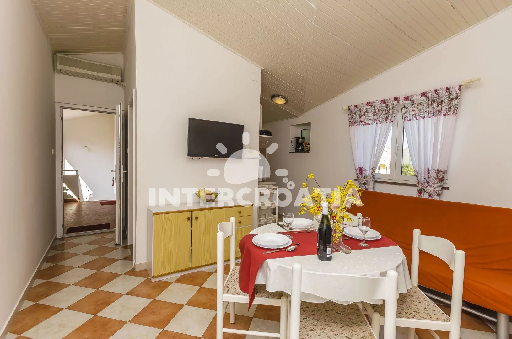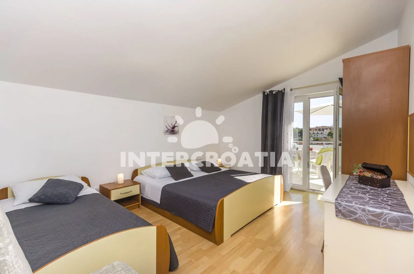Vzdálenosti: Moře 70 m, pláž (oblázky) 70 m, centrum 100 m, market 400 m, pošta 1 km, lékárna 1 km, nemocnice 1 km, restaurace 50 m, směnárna 1 km, banka 1 km, přístav 1 km, tenisové kurty 500 m, diskotéka 500 m, bar 50 m, čerpací stanice 2,5 km, veřejná doprava 1 km.