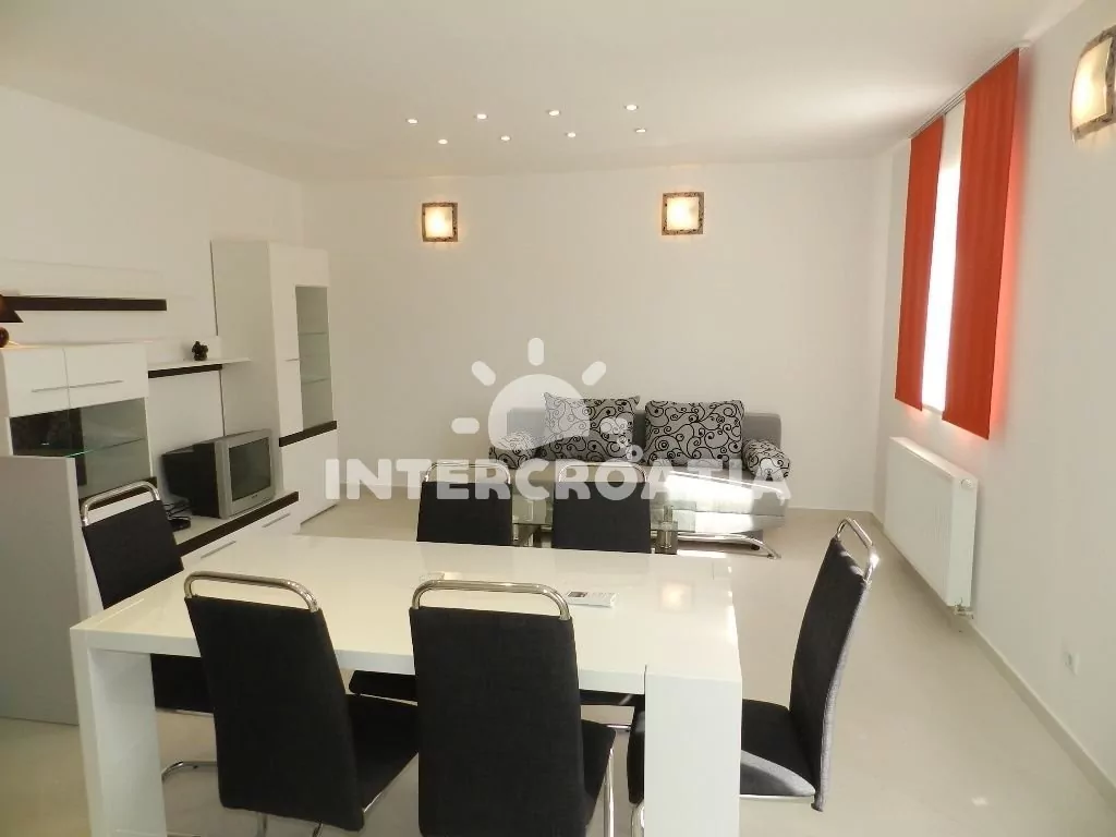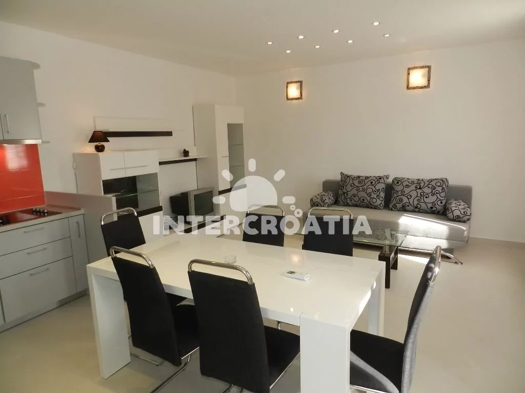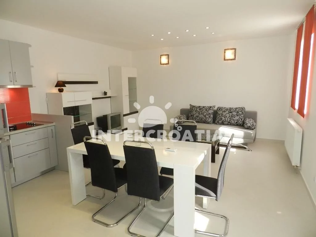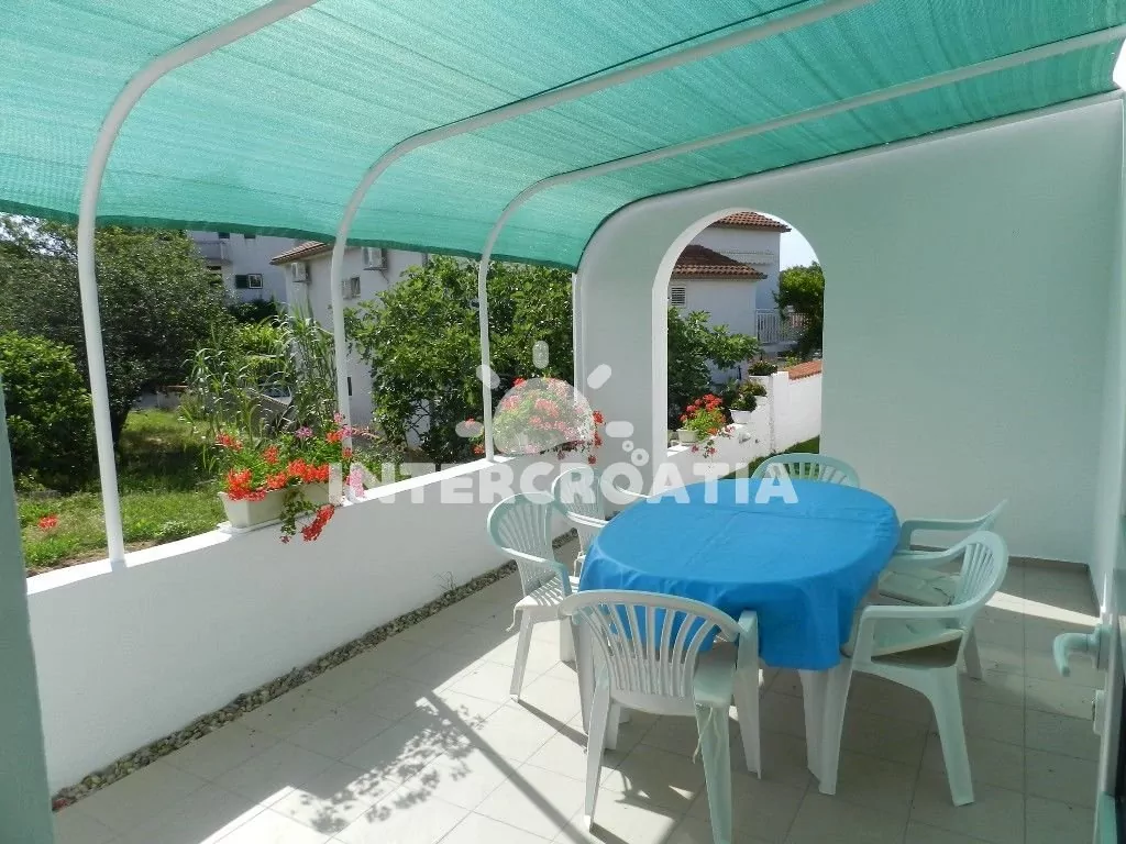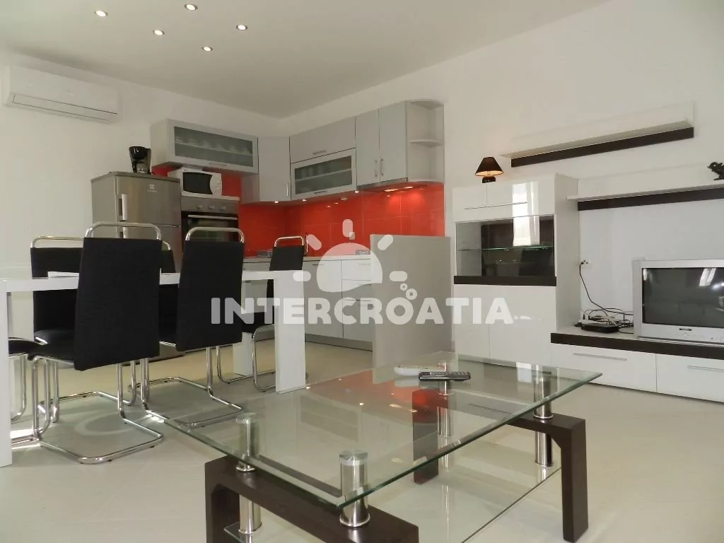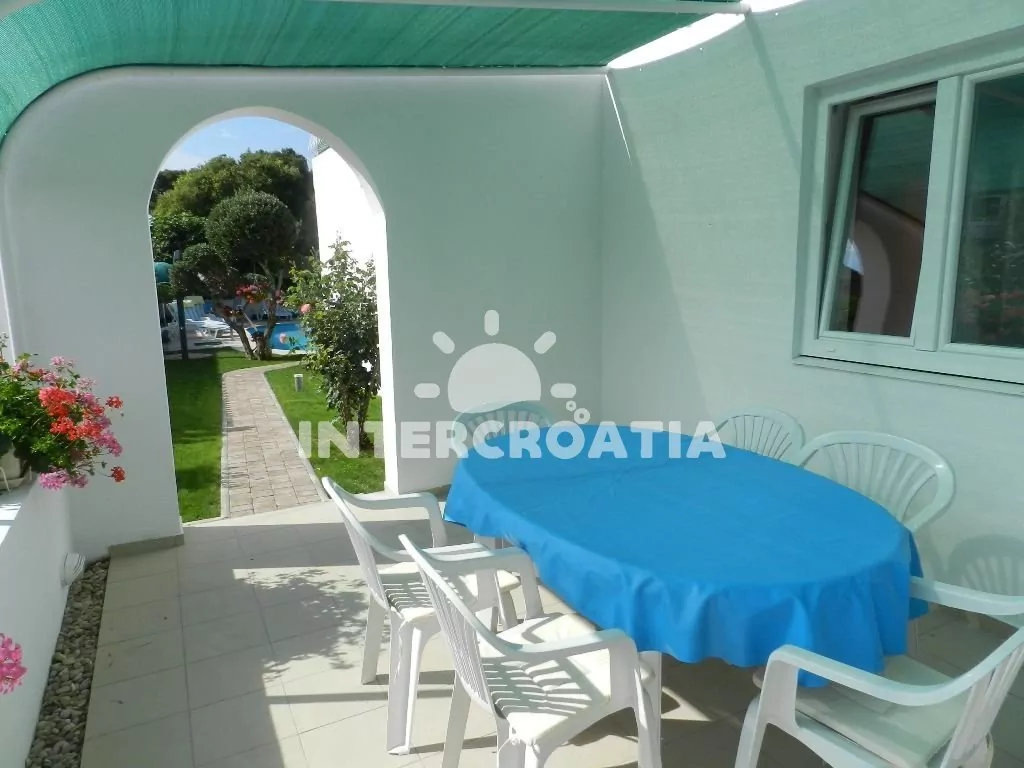 Luxusní apartmán s krytou terasou a posezením, nacházející se v přízemí. Vstup, obývací místnost spojená s kuchyní. Kuchyňská linka se sklokeramickou varnou deskou, troubou, mikrovlnnou troubou, lednicí s mrazákem, kávovarem, nádobím a myčkou na nádobí. V obývací místnosti jídelní stůl pro 6 osob, pohovka (rozložitelná na extra lůžko pro 2 osoby) a televize se satelitem. Ložnice s dvoulůžkem. Koupelna se sprchovým koutem, umyvadlem a wc. Hosté mají k dispozici krytou terasu s posezením a v zahradě společný zapuštěný bazén s lehátky. Parkování u objektu.