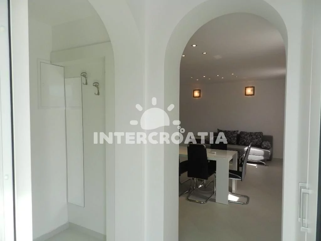 Luxusní apartmán s krytou terasou a posezením, nacházející se v přízemí. Vstup, obývací místnost spojená s kuchyní. Kuchyňská linka se sklokeramickou varnou deskou, troubou, mikrovlnnou troubou,…