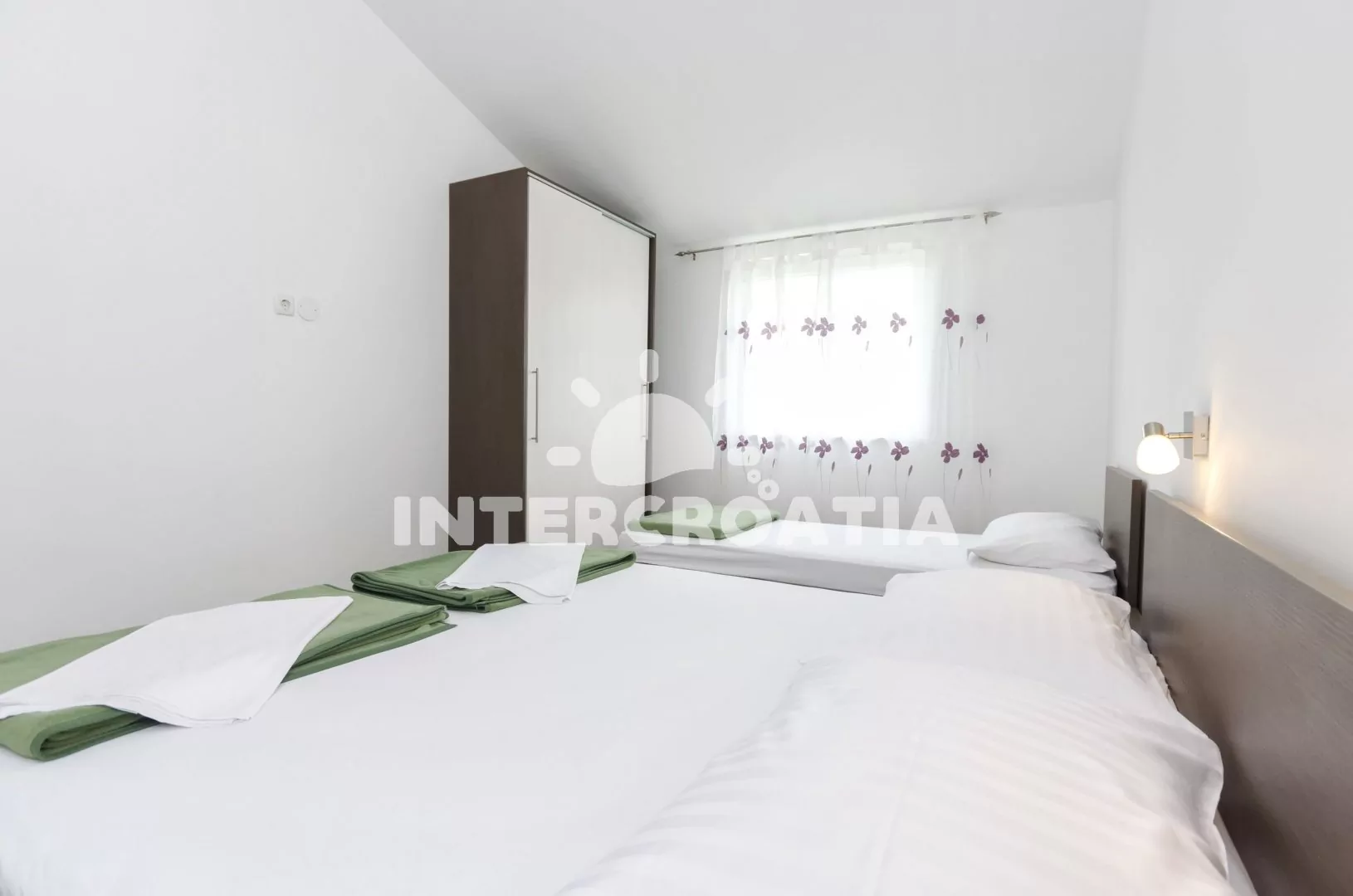 Apartmán (80 m2) s vlastní zastřešenou terasou a venkovním posezením se nachází v prvním patře domu a je vhodný pro 4 až 5 osob. Apartmán má výhled na moře a do zahrady. Obývací pokoj je spojený s kuchyní. Kuchyňská linka je vybavena sklokeramickou varnou deskou, vestavěnou troubou, myčkou na nádobí, mikrovlnnou troubou, rychlovarnou konvicí, nádobím a lednicí s mrazákem. Obývací pokoj s jídelním stolem pro 6 osob, pohovkou (rozložitelná na extra lůžko pro 1 osobu), televizí se satelitním programem, klimatizací a vstupem na terasu. První ložnice je vybavena jedním dvoulůžkem. Druhá ložnice s dvoulůžkem a jedním jednolůžkem. Koupelna se sprchovým koutem, umyvadlem, pračkou a wc. Hostům je k dispozici parkování u objektu zdarma.