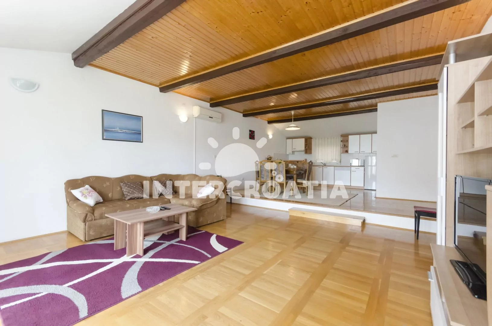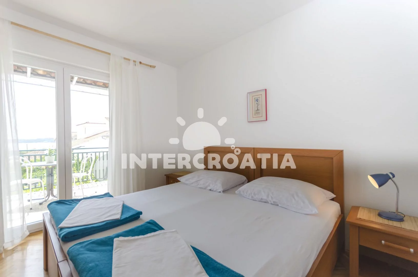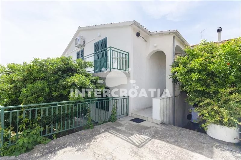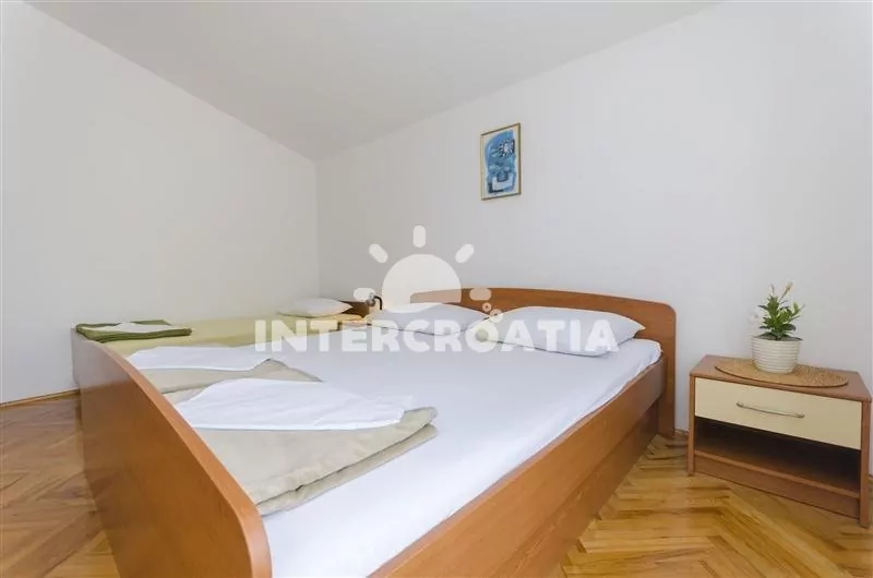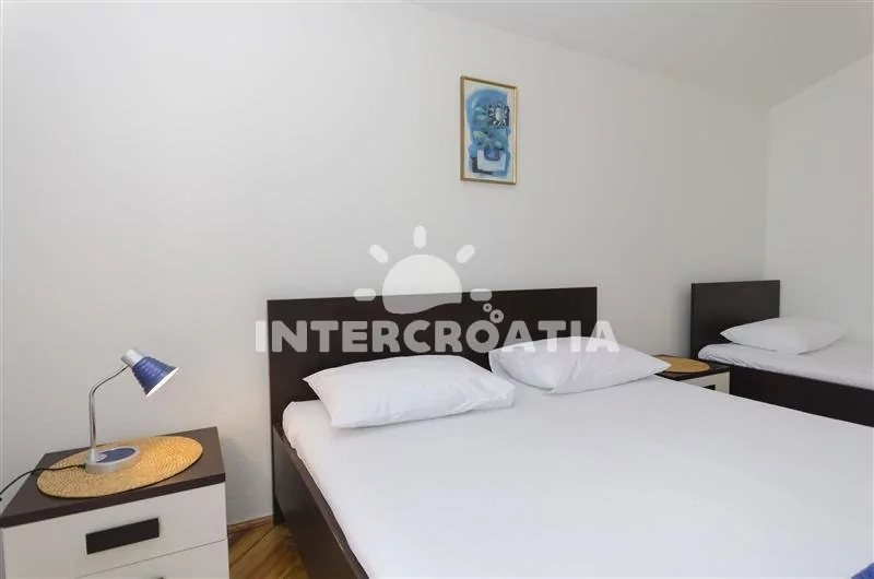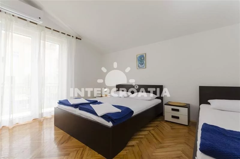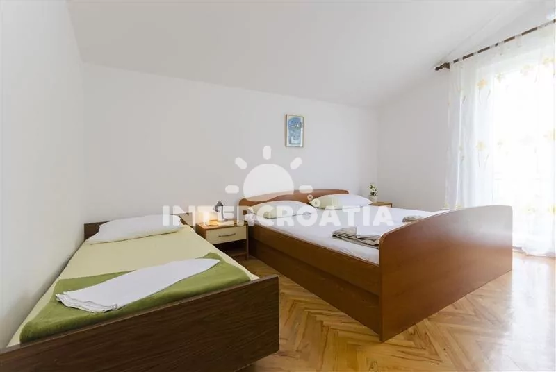 Prostorný apartmán (110 m2) s vlastní částečně zastřešenou terasou, balkonem a venkovním posezením se nachází v prvním patře domu a je vhodný pro 6 až 8 osob. Apartmán má výhled na moře a do zahrady. Obývací pokoj je spojený s kuchyní. Kuchyňská linka je vybavena sporákem, troubou, myčkou na nádobí, mikrovlnnou troubou, rychlovarnou konvicí, nádobím a lednicí s mrazákem. Obývací pokoj s jídelním stolem pro 6 osob, rohovou pohovkou, televizí se satelitním programem, klimatizací a vstupem na terasu. První ložnice je vybavena jedním dvoulůžkem a vstupem na balkon. Druhá a třetí ložnice je vybavena vždy s jedním dvoulůžkem, jedním jednolůžkem a vstupem na balkon. První koupelna s vanou, umyvadlem, pračkou a wc. Další 3 koupelny se sprchovým koutem, umyvadlem a wc. Hostům je k dispozici parkování u objektu zdarma.
