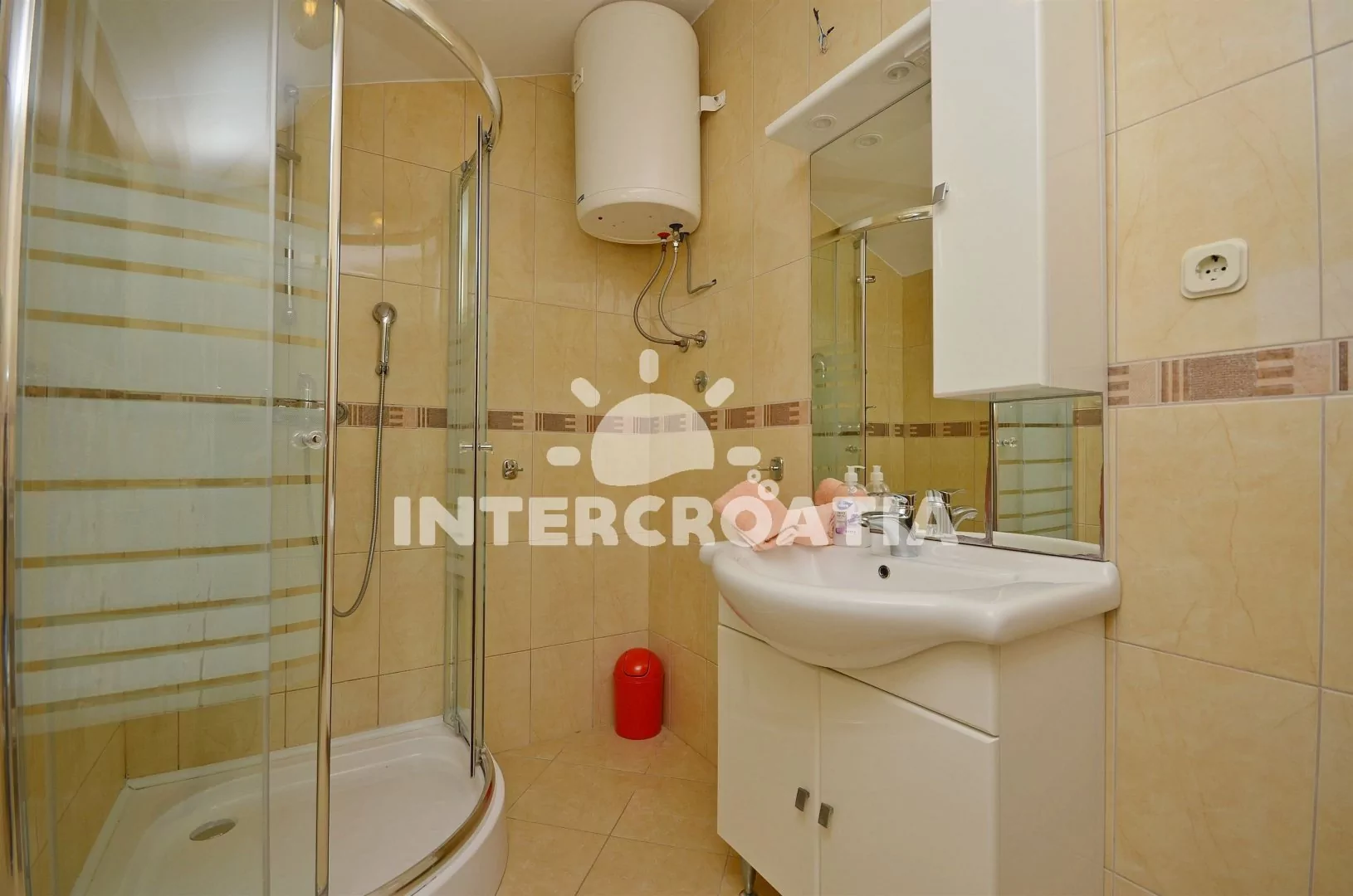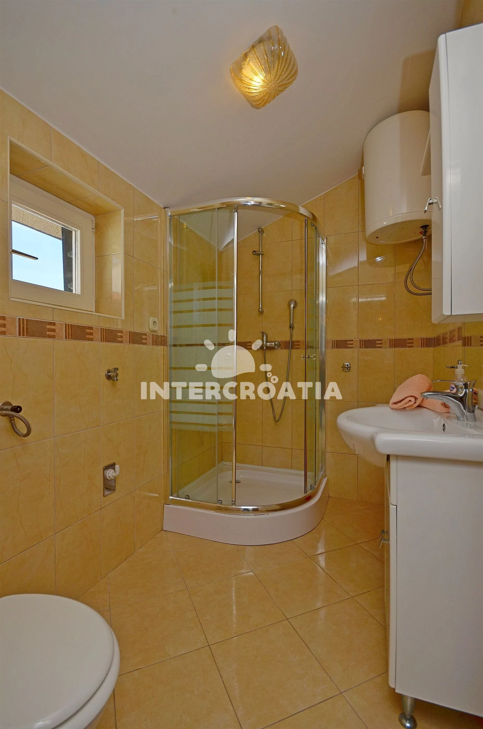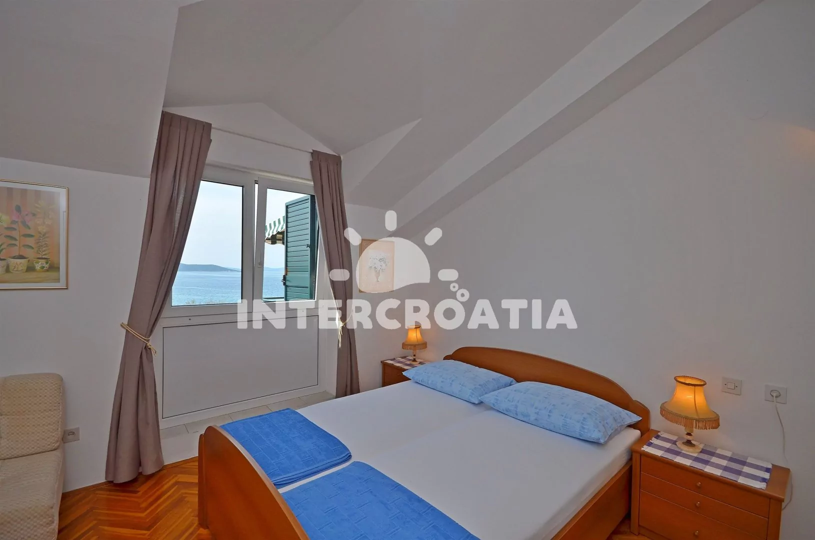 Nádherný apartmán (70 m2) s krytou terasou a výhledem na moře, se nachází v druhém patře domu. Obývací pokoj je spojený s kuchyní. Kuchyňská linka je vybavena sporákem, vestavěnou troubou,…
