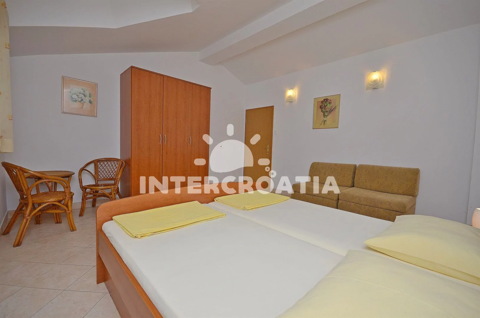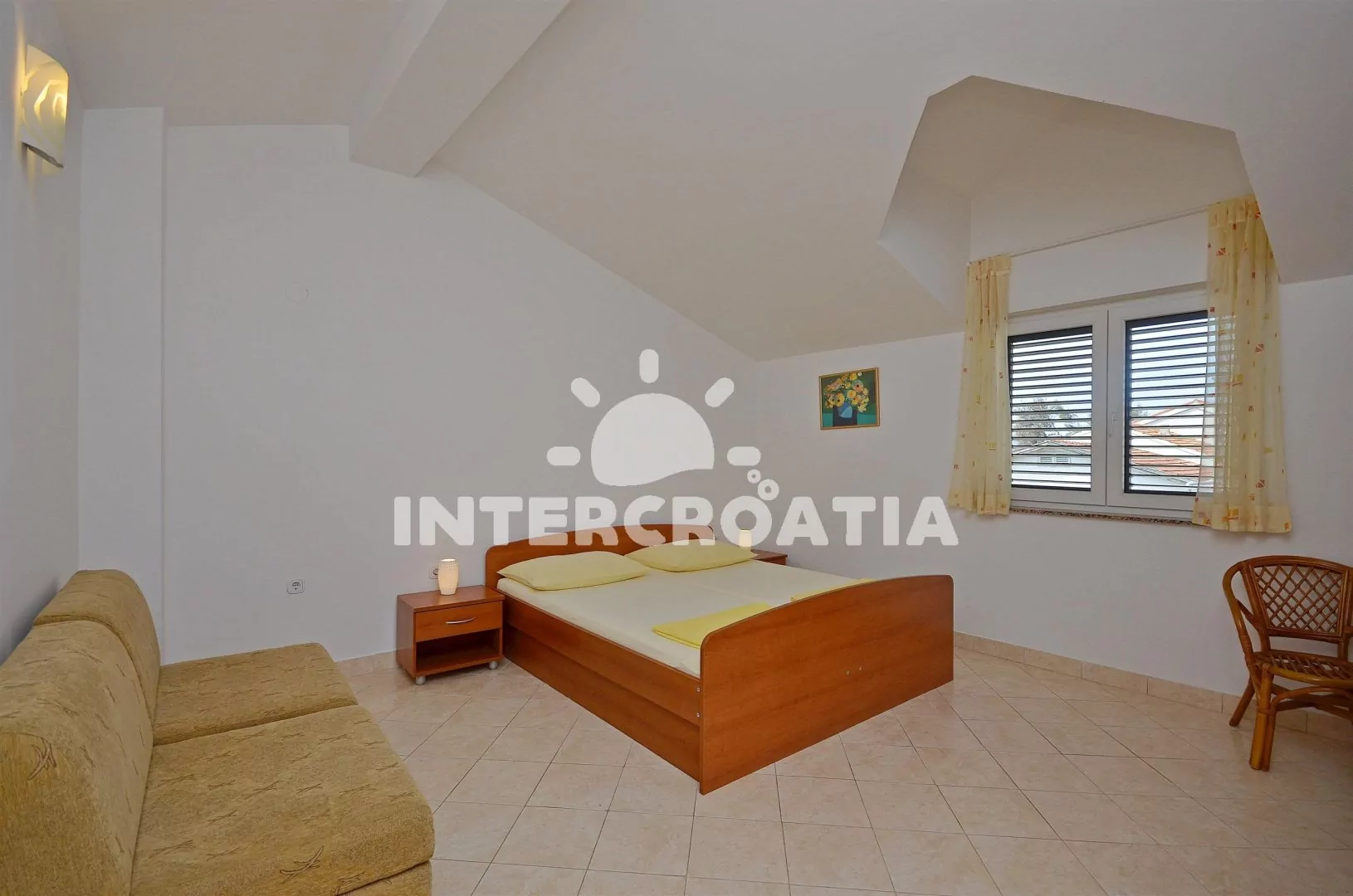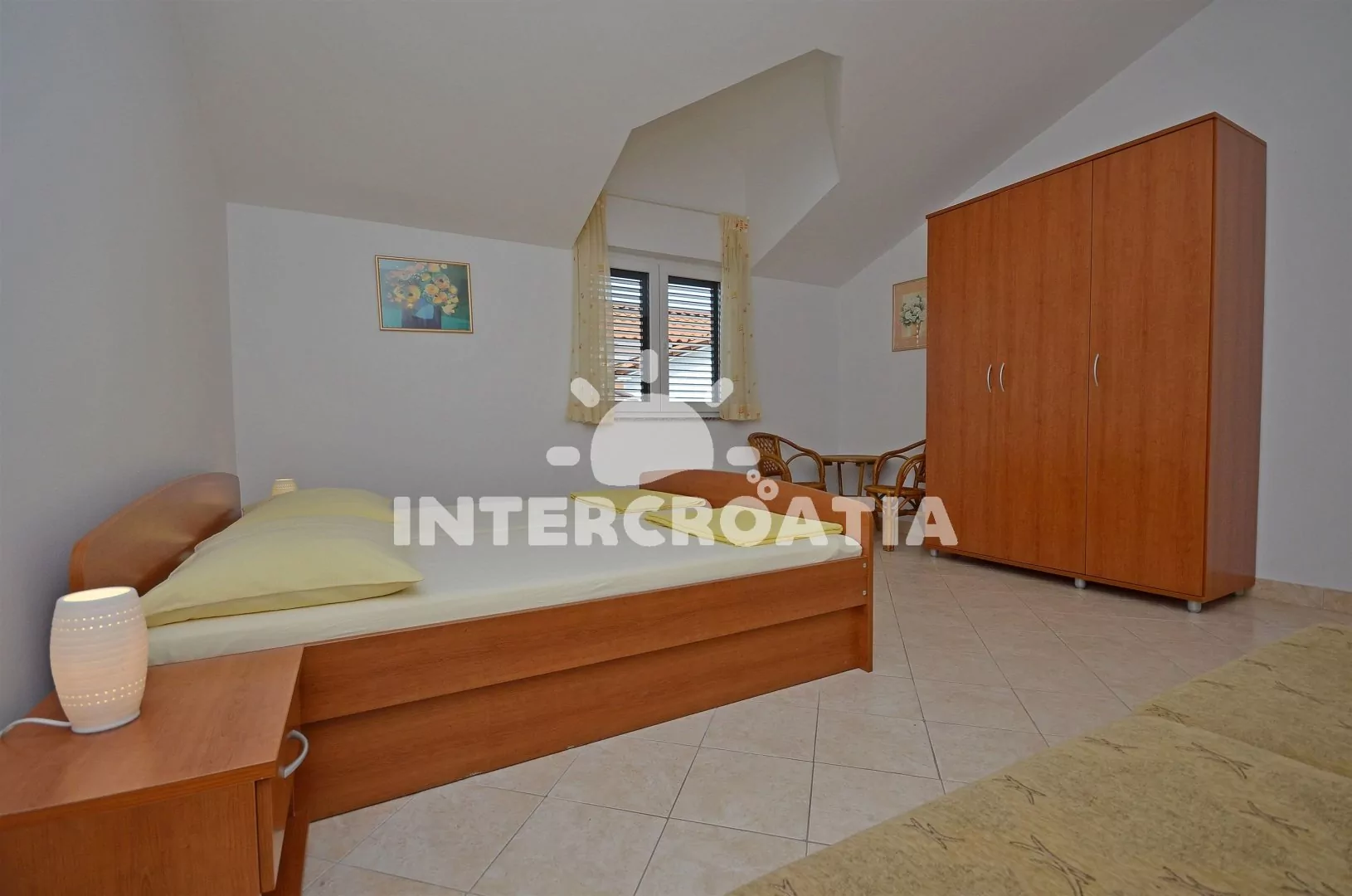 Apartmán (45 m2) s krytou terasou a výhledem na moře, se nachází v druhém patře domu. Obývací pokoj je spojený s kuchyní. Kuchyňská linka je vybavena dvouplotýnkovým sporákem, rychlovarnou konvicí, nádobím a lednicí s mrazákem. Obývací pokoj s jídelním stolem pro 4 osoby, pohovkou (rozložitelná na extra lůžko pro 2 osoby), televizí, klimatizací a vstupem na terasu. Ložnice je vybavena jedním dvoulůžkem. Koupelna se sprchovým koutem, umyvadlem a wc. Hostům je k dispozici parkování u objektu zdarma.