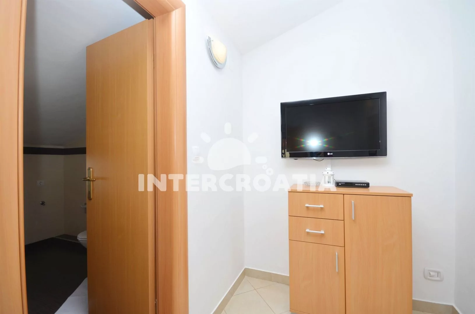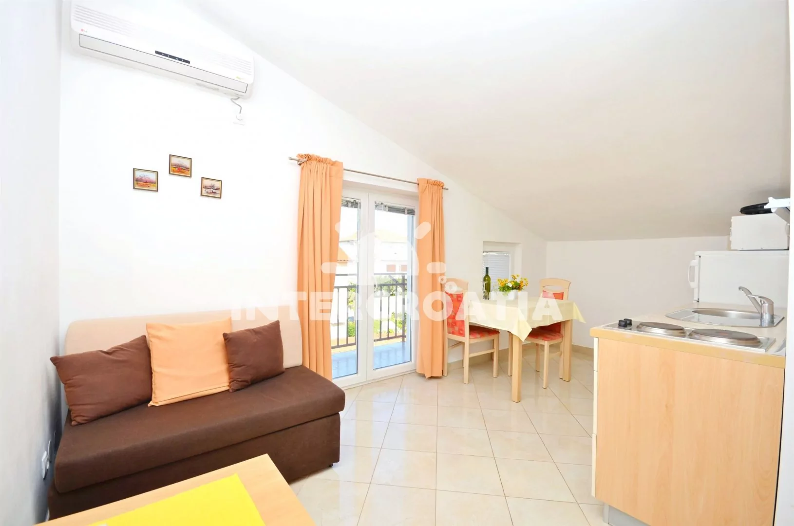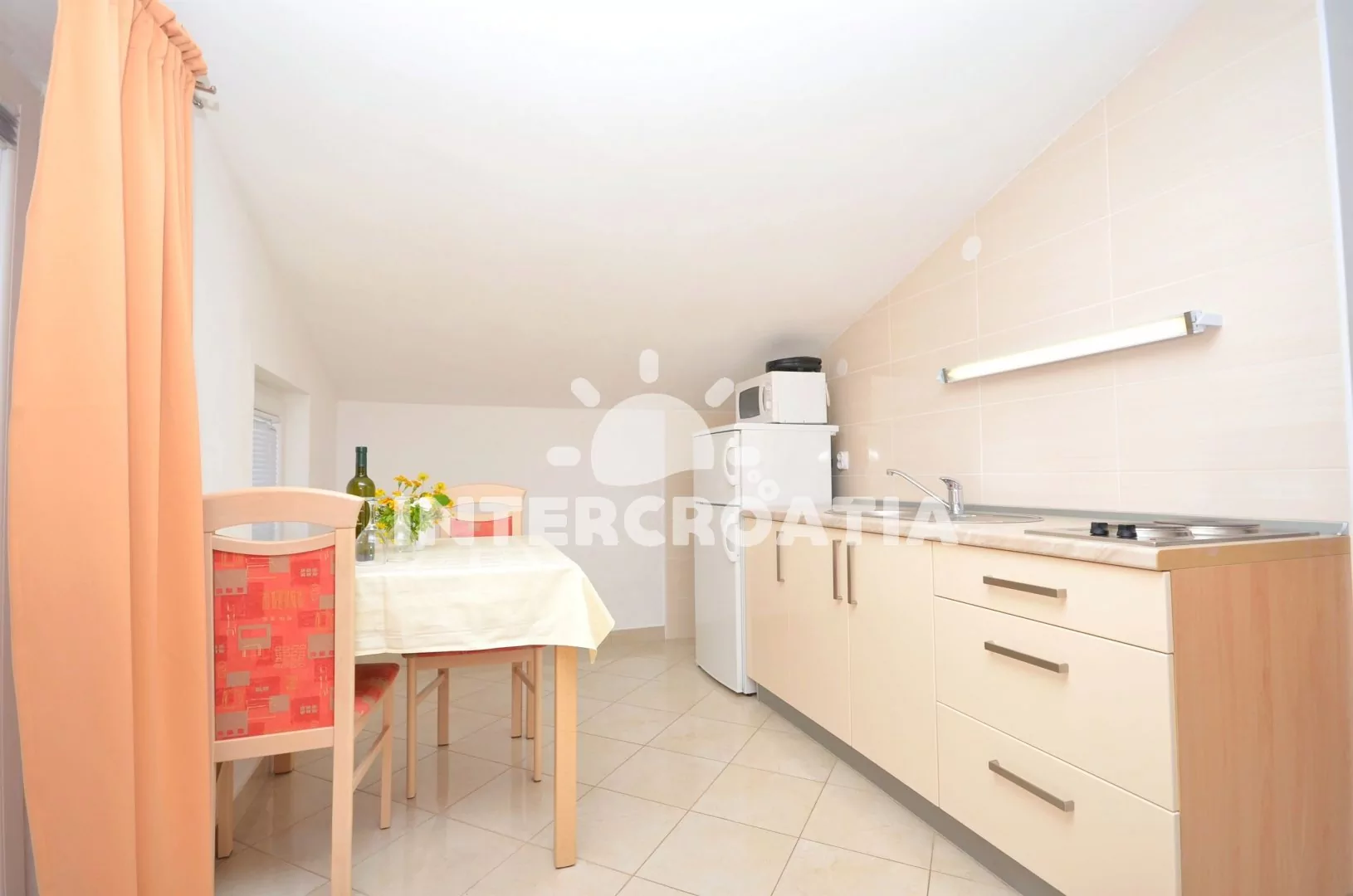 Podkrovní apartmán je vhodný pro 2 až 3 osoby, disponuje vlastním balkonem s posezením a společnou terasou s druhým apartmánem. Obývací pokoj je spojený s kuchyní. Kuchyňská linka je vybavena dvouplotýnkovým sporákem, mikrovlnnou troubou, rychlovarnou konvicí, kávovarem, toustovačem, nádobím a lednicí s mrazákem. Obývací pokoj s jídelním stolem pro 3 osoby, pohovkou (rozložitelná na extra lůžko pro 1 osobu), televizí se satelitním programem, klimatizací a vstupem na balkon. Ložnice je vybavena jedním dvoulůžkem. Koupelna se sprchovým koutem, umyvadlem, fénem a wc. Hostům je k dispozici parkování u objektu zdarma.