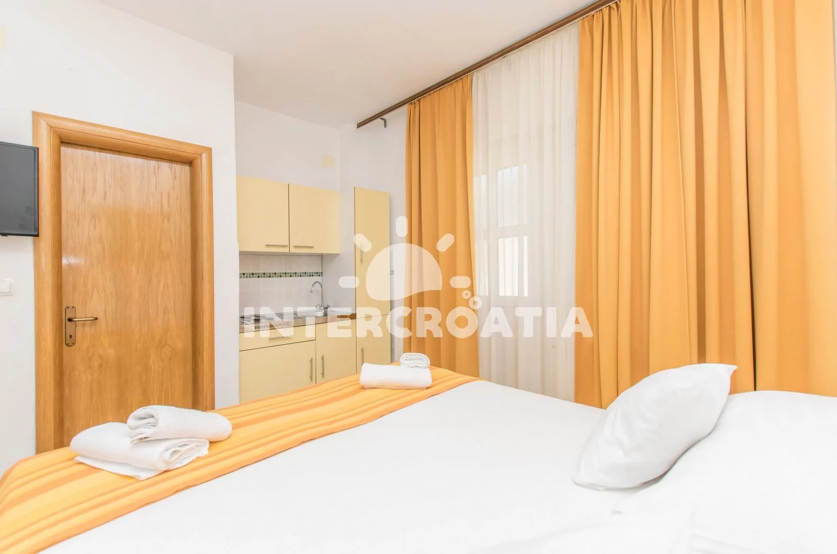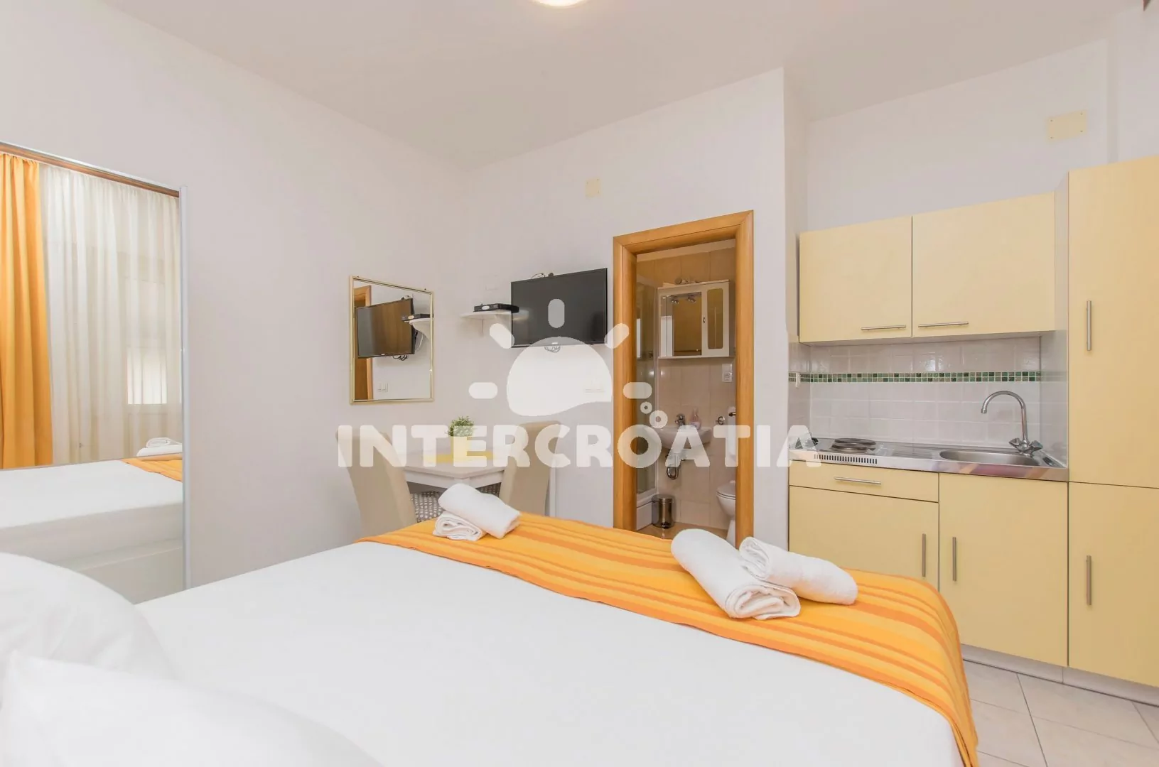 Apartmán typu studio s vlastní terasou a výhledem do zahrady. Apartmán je umístěný v přízemí vily a je vhodný pro 2 osoby. Obývací místnost je spojena s kuchyní. Kuchyňská linka je vybavena dvouplotýnkovým sporákem, rychlovarnou konvicí, kávovarem, toustovačem, nádobím a lednicí s mrazákem. Obývací místnost s jedním dvoulůžkem, televizí se satelitním programem a klimatizací. Koupelna se sprchovým koutem, umyvadlem a wc. Hostům je k dispozici parkování u objektu zdarma.