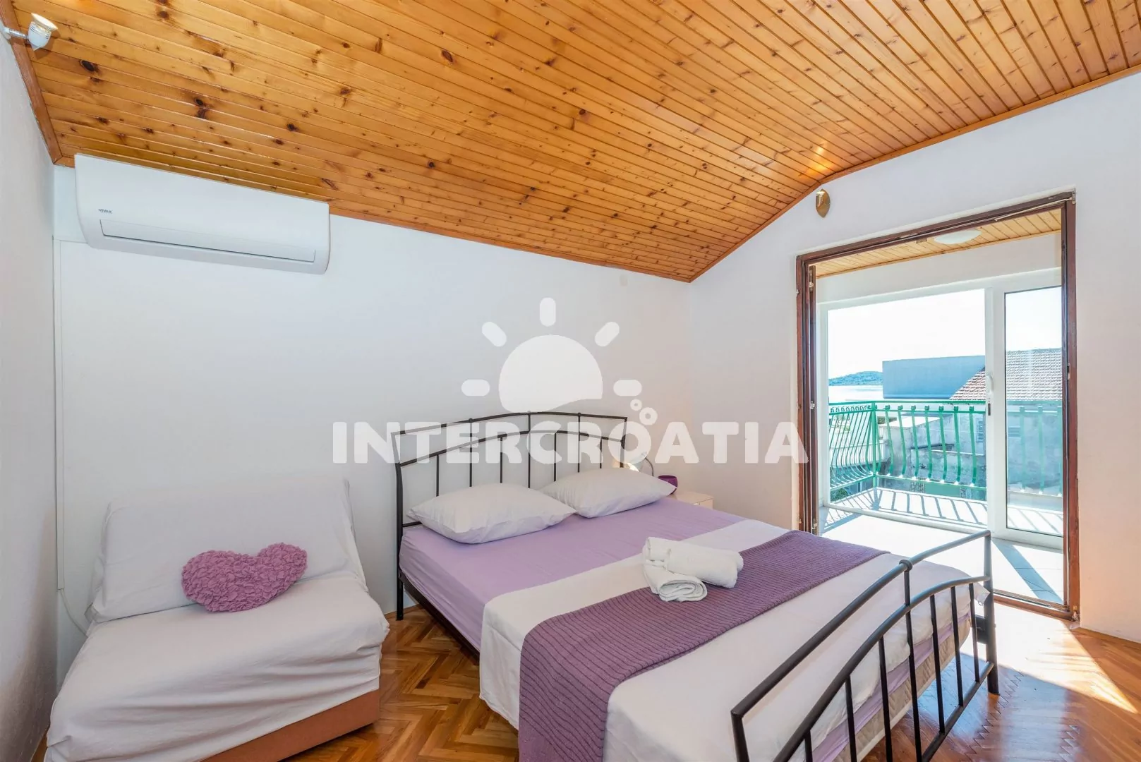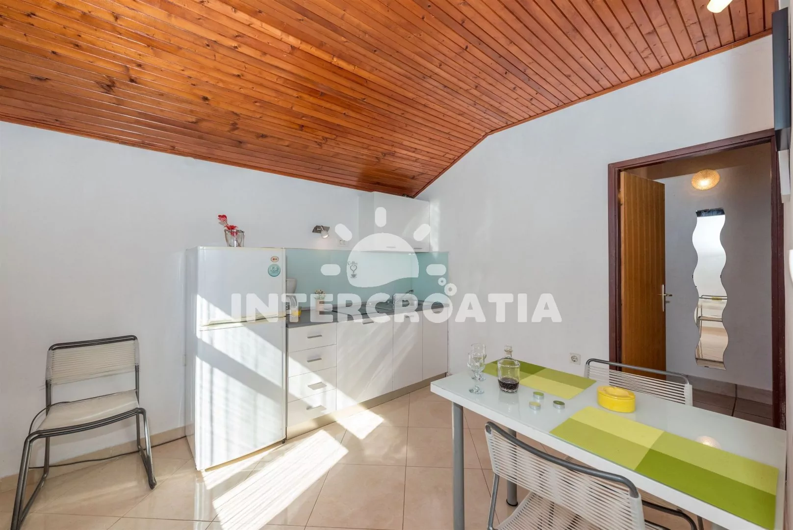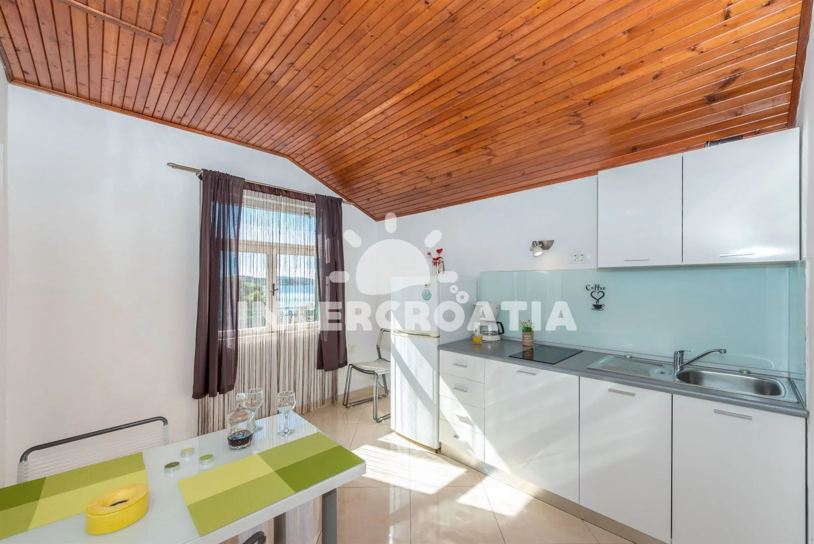 Jedinečný apartmán s terasou a balkonem nabízí výhled na moře a pláž, nachází se ve třetím patře vily a je vhodný pro 2 až 3 osoby. Kuchyň je vybavena jídelním stolem pro 3 osoby, kuchyňskou linkou se sklokeramickou varnou deskou, kávovarem, nádobím a lednicí s mrazákem. Ložnice je vybavena jedním dvoulůžkem, pohovkou (rozložitelná na extra lůžko pro 1 osobu), televizí a klimatizací. Koupelna se sprchovým koutem, umyvadlem, fénem a wc. Hostům je k dispozici parkování u objektu zdarma.