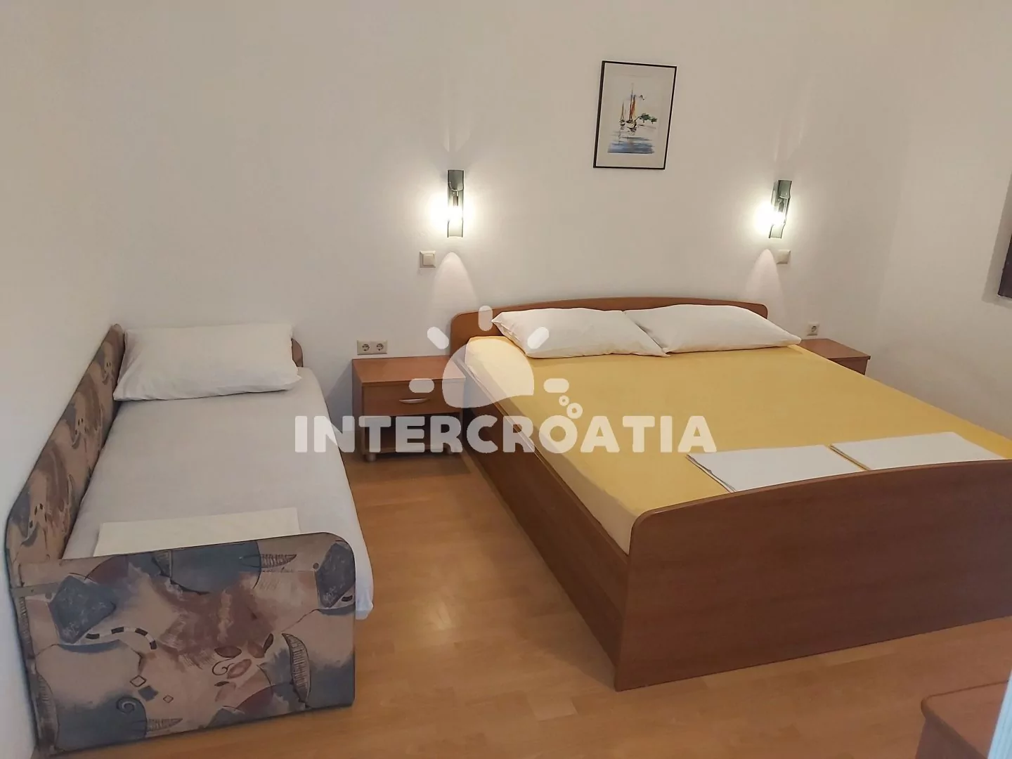 Přístavní město Vodice v Severní Dalmácii je situované 14 km severozápadně od Šibeniku. Ubytování se nachází 6 minut pěší chůze k čistému moři a oblázkové pláži.