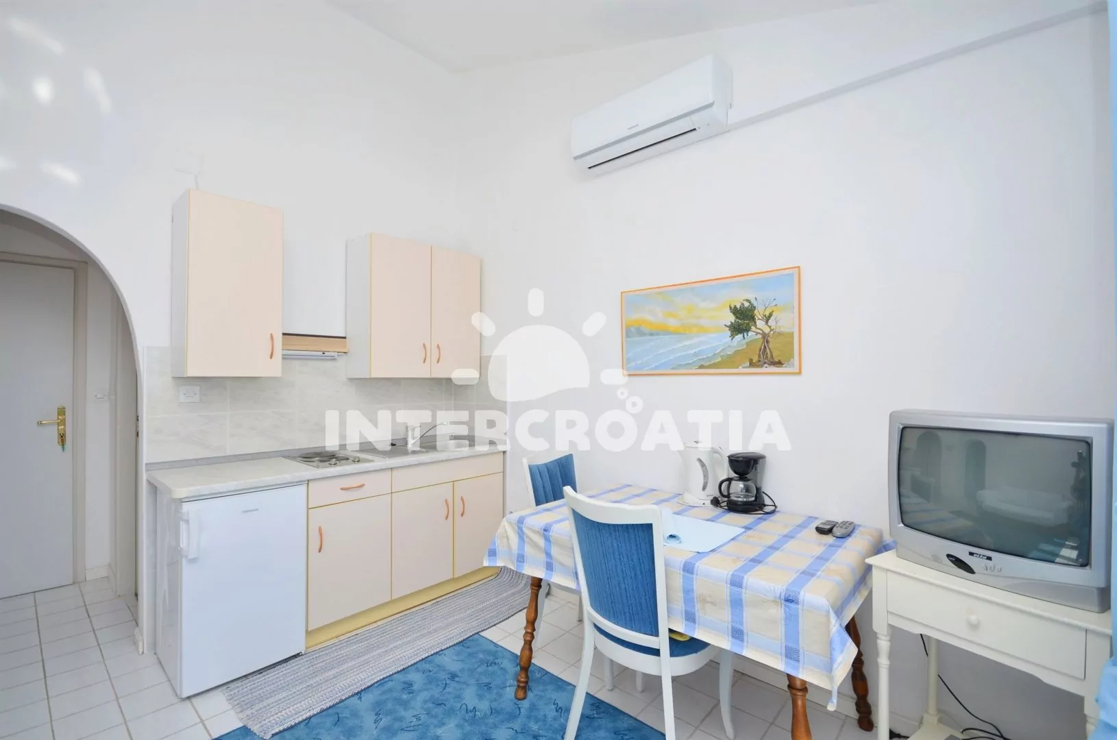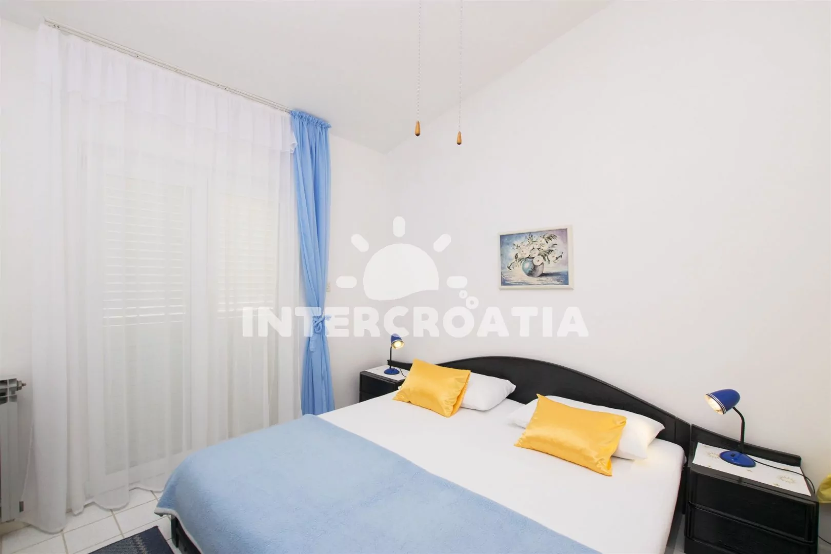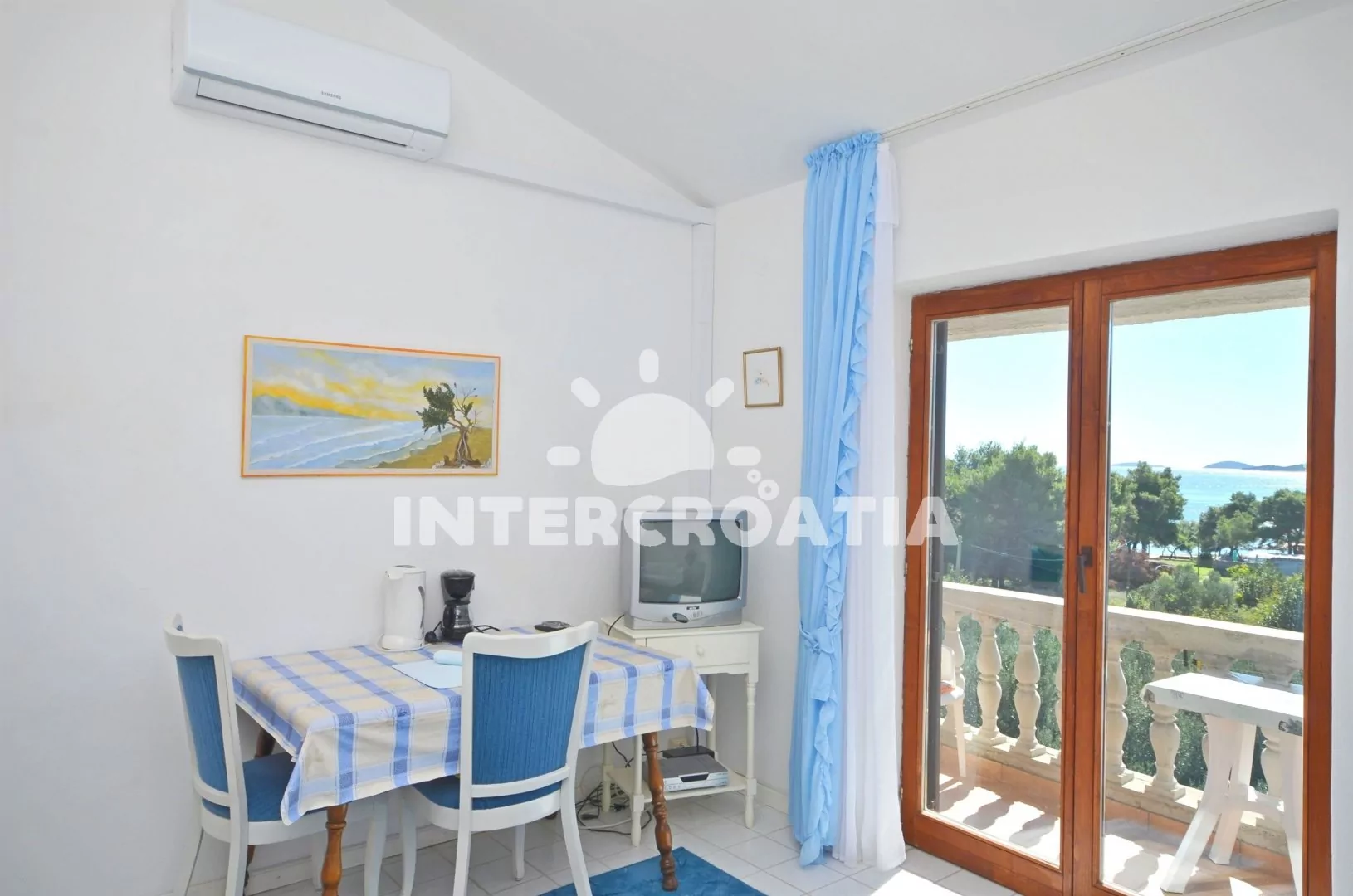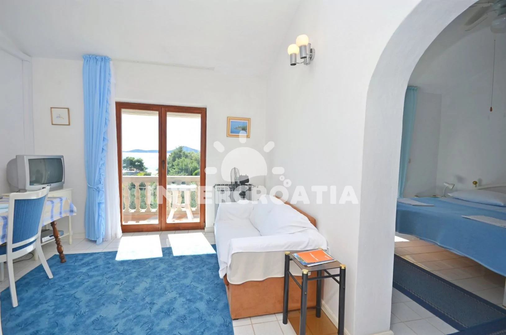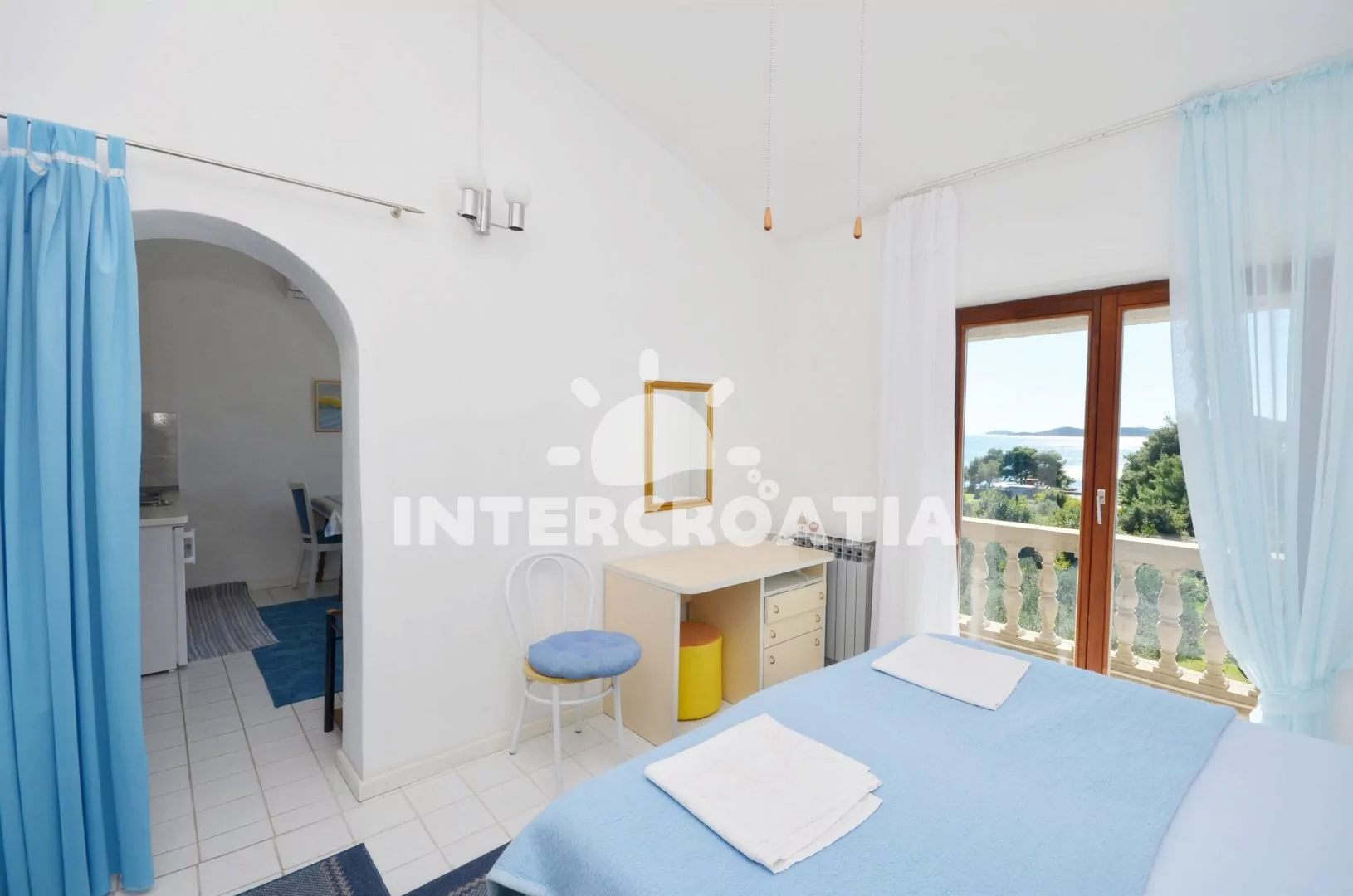 Apartmán s výhledem na moře a vlastním balkonem je vhodný pro 2 osoby. Obývací pokoj je spojený s kuchyní. Kuchyňská linka je vybavena dvouplotýnkovým sporákem, kávovarem, nádobím a lednicí s mrazákem. Obývací pokoj s jídelním stolem pro 3 osoby, pohovkou, klimatizaci, televizí se satelitním programem a vstupem na balkon. Ložnice je částečně oddělena od obývacího pokoje a je vybavena jedním dvoulůžkem a vstupem na balkon. Koupelna se sprchovým koutem, umyvadlem a wc. Hostům je k dispozici parkování u objektu zdarma.