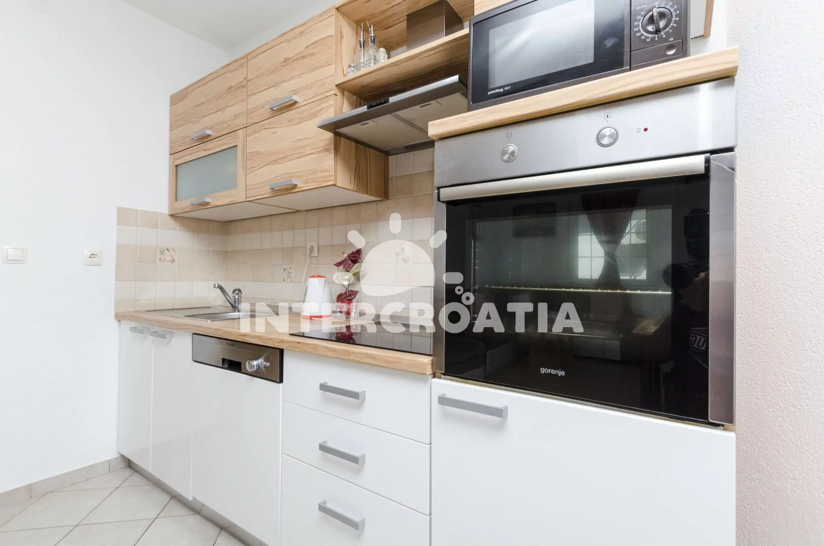 Apartmán (60 m2) s vlastní terasou se nachází v 1. patře domu a je vhodný pro 2 až 4 osoby. Obývací pokoj je spojený s kuchyní. Kuchyňská linka je vybavena sklokeramickou varnou deskou, digestoří,…