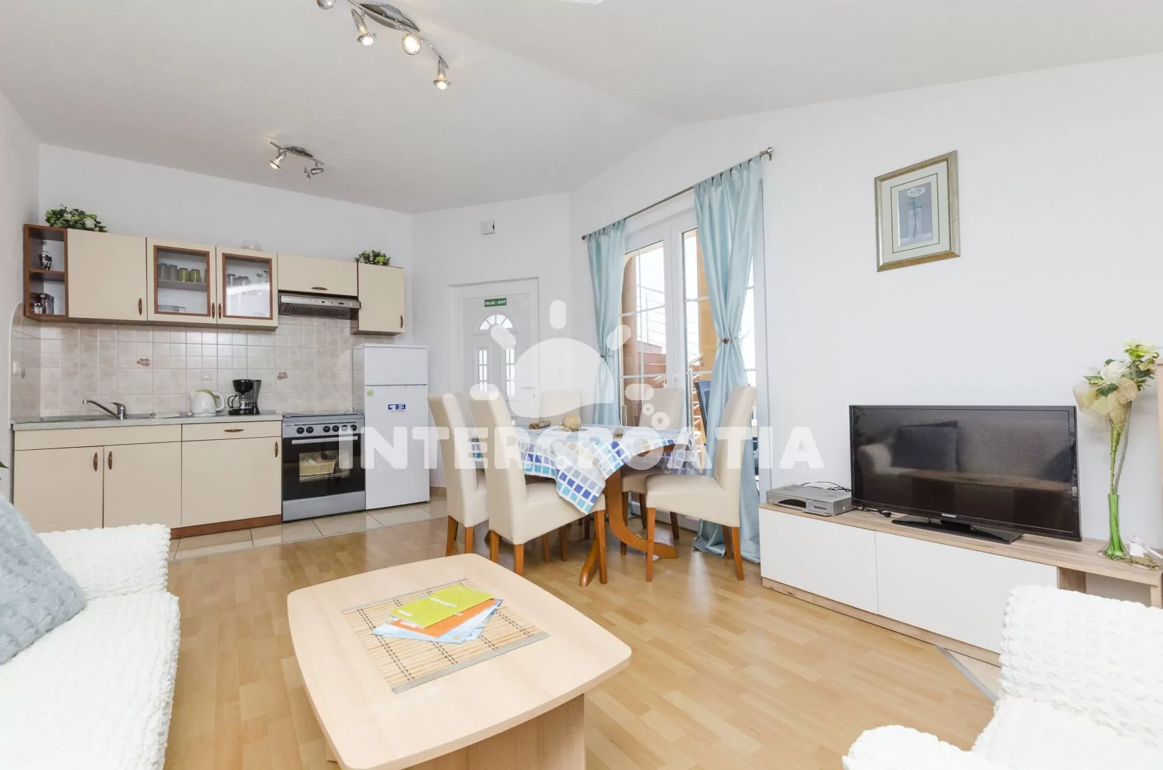 Apartmán (60 m2) s vlastní terasou se nachází v 2. patře domu a je vhodný pro 2 až 4 osoby. Obývací pokoj je spojený s kuchyní. Kuchyňská linka je vybavena varnou deskou, digestoří, troubou,…