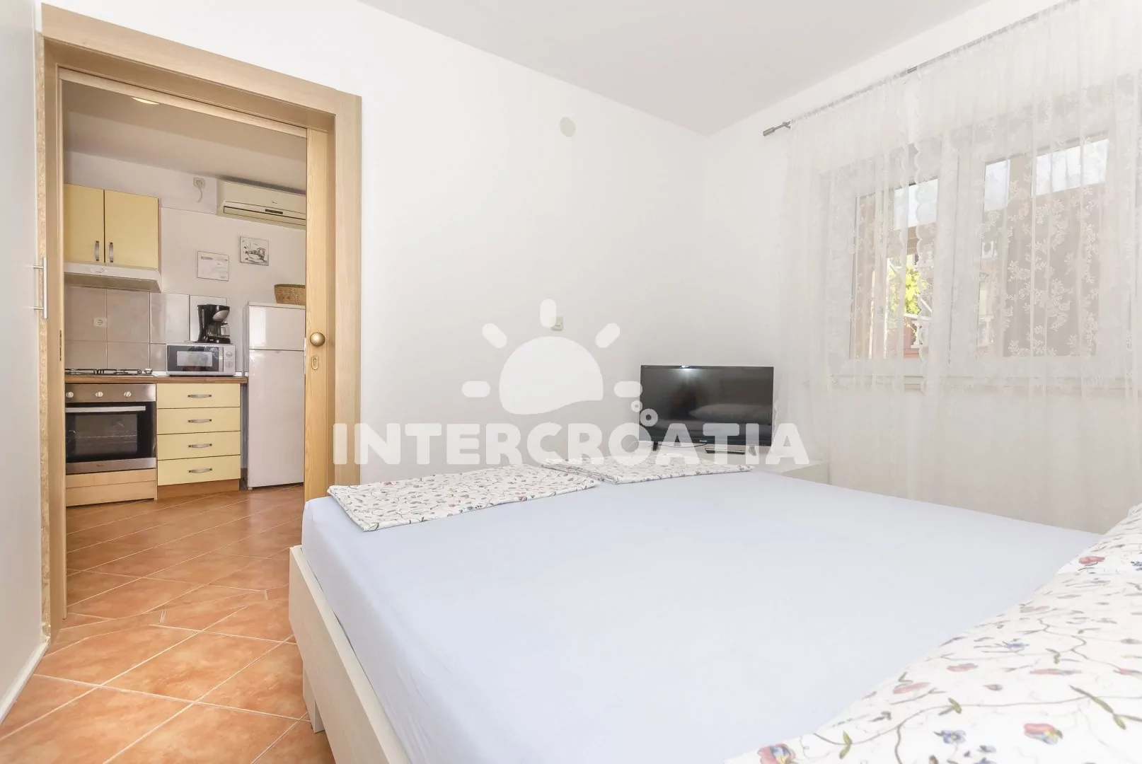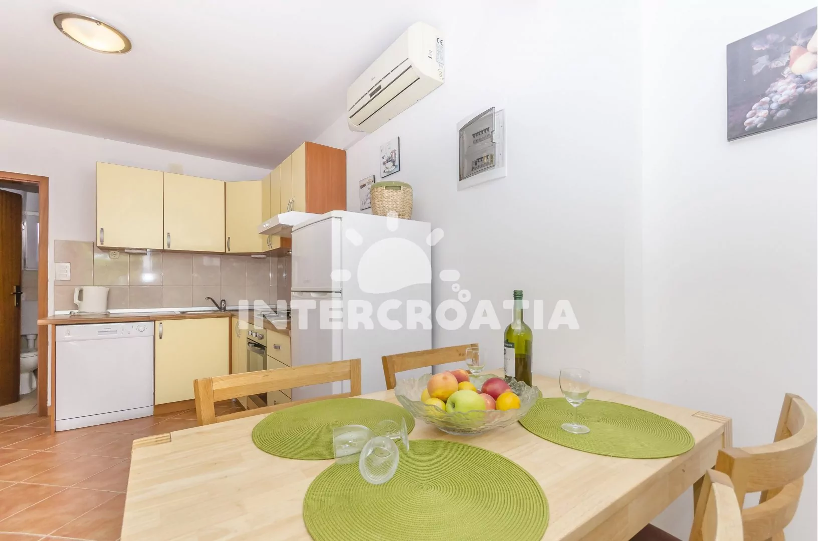 Apartmán (48 m2) s terasou a venkovním posezením se nachází v přízemí domu a je vhodný pro 4 osoby. Vstup: Kuchyň s jídelním stolem pro 4 osoby, kuchyňskou linkou s varnou deskou, digestoří, vestavěnou troubou, mikrovlnnou troubou, rychlovarnou konvicí, kávovarem, nádobím a lednicí s mrazákem, dále klimatizace a vstup na terasu. První ložnice s dvoulůžkem a televizí se satelitním programem. Druhá ložnice s dvoulůžkem. Koupelna se sprchovým koutem, umyvadlem, pračkou, fénem a wc. Hostům je k dispozici parkování u objektu zdarma.
