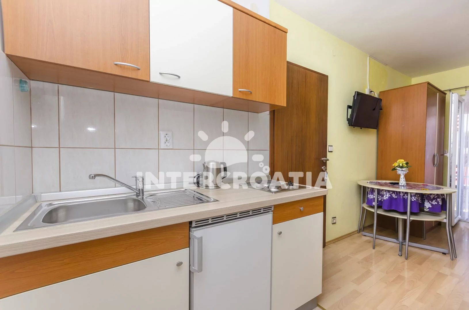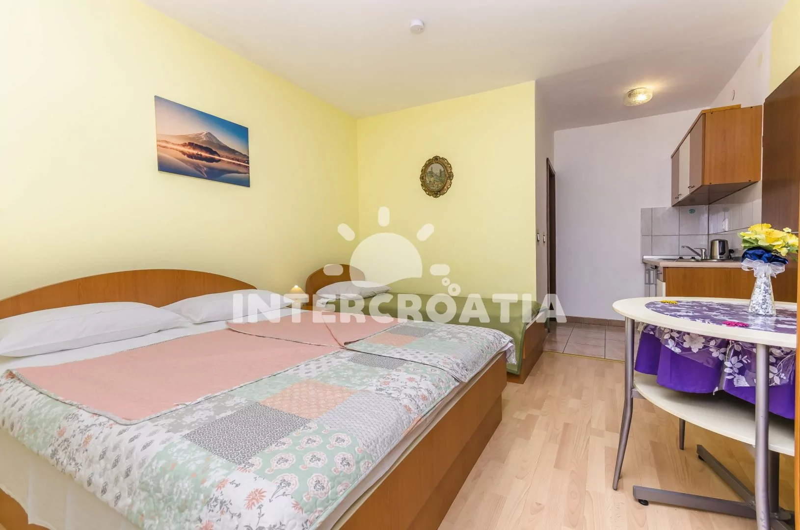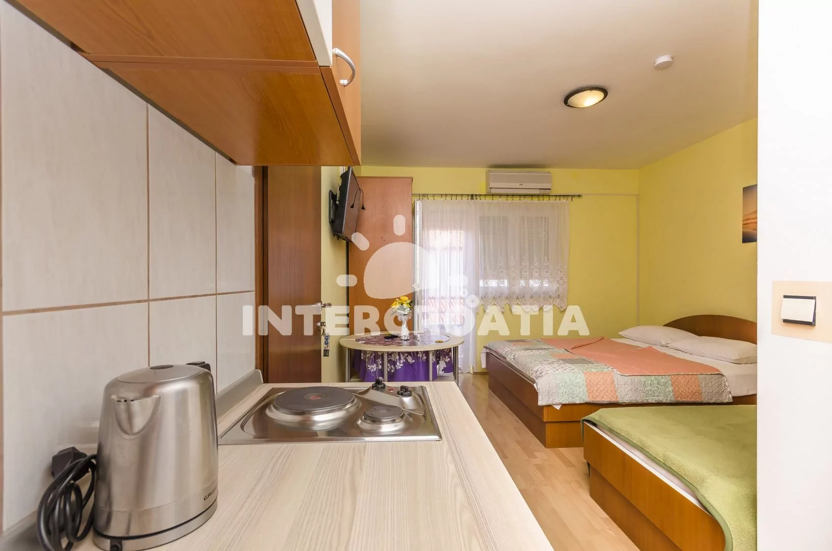Apartmán (28 m2) typu studio s vlastním balkonem. Apartmán se nachází v 1. patře domu a je vhodný pro až 3 osoby. Obývací místnost je spojena s kuchyní. Kuchyňská linka je vybavena dvouplotýnkovým vařičem, rychlovarnou konvicí, nádobím a lednicí s mrazákem. Obývací místnost s jídelním stolem, televizí, dvoulůžkem, jedním jednolůžkem, klimatizací a vstupem na balkon. Koupelna se sprchovým koutem, umyvadlem a wc. Hostům je k dispozici parkování u objektu zdarma.