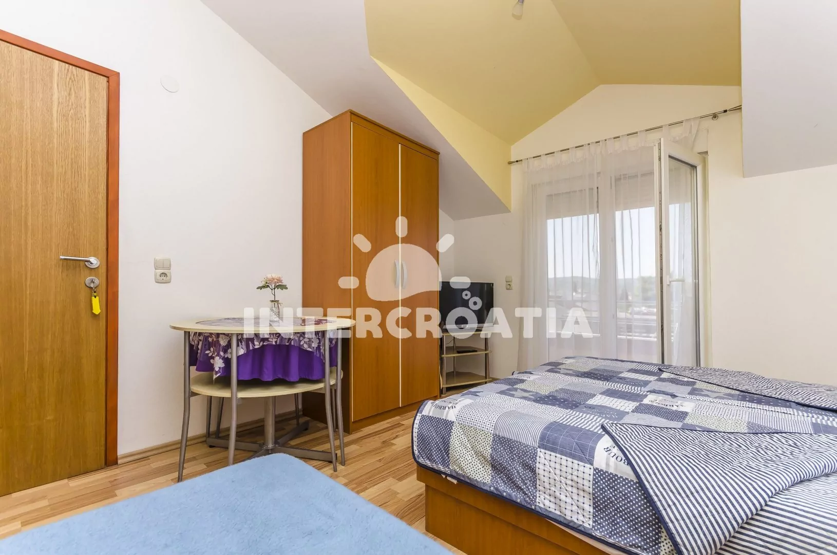 Podkrovní apartmán (28 m2) typu studio s vlastním balkonem je vhodný pro až 3 osoby. Obývací místnost je spojena s kuchyní. Kuchyňská linka je vybavena dvouplotýnkovým vařičem, rychlovarnou konvicí, nádobím a lednicí s mrazákem. Obývací místnost s jídelním stolem, televizí, dvoulůžkem, jedním jednolůžkem, klimatizací a vstupem na balkon. Koupelna se sprchovým koutem, umyvadlem a wc. Hostům je k dispozici parkování u objektu zdarma.
