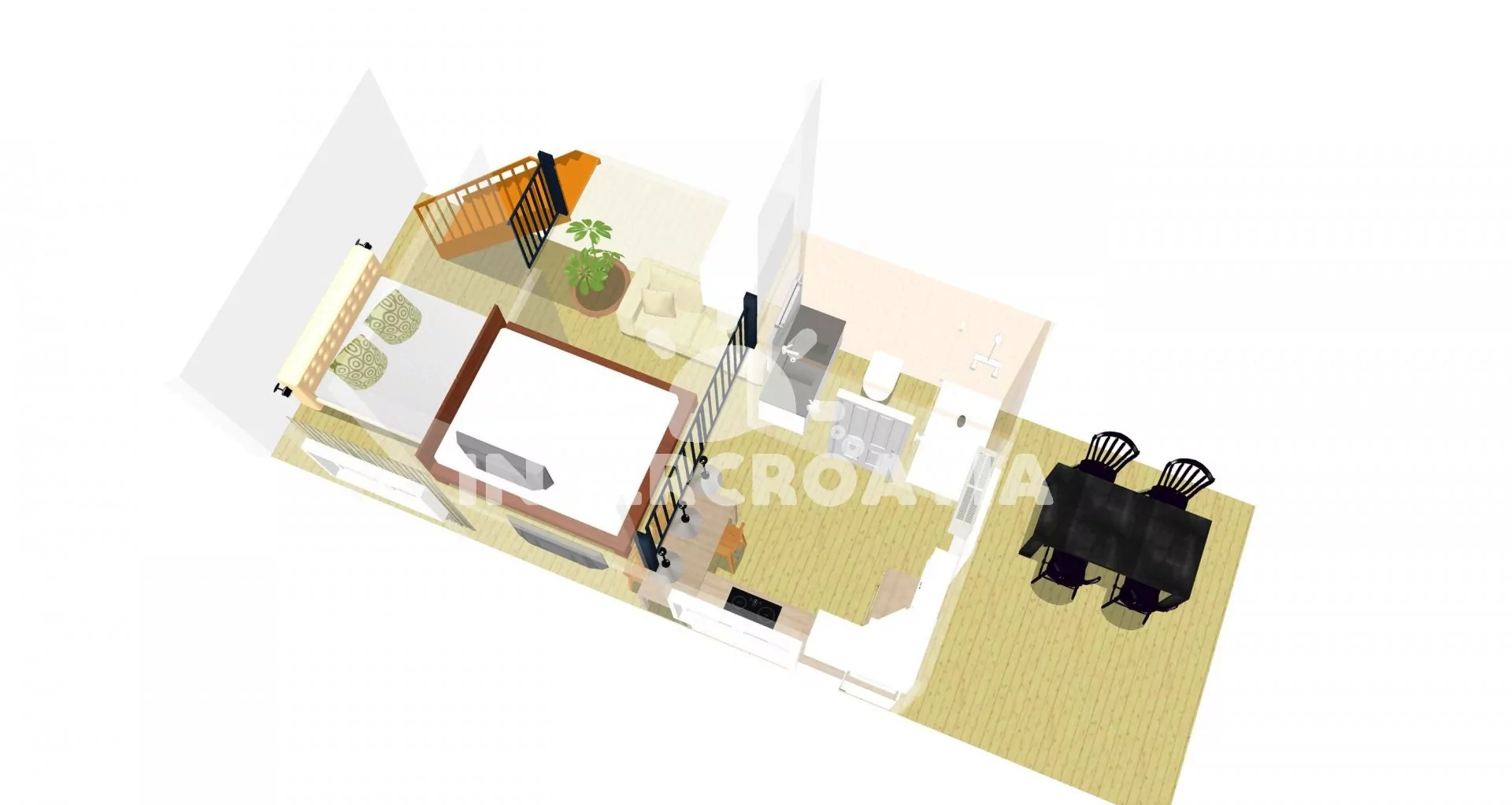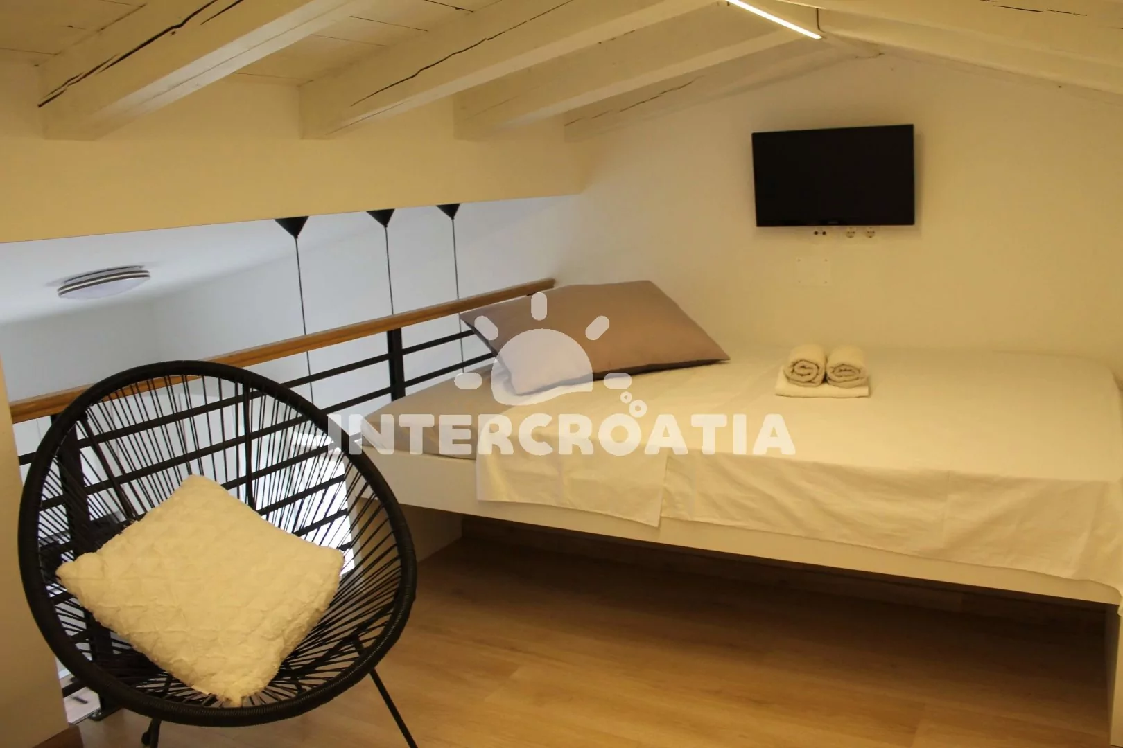Apartmán ve dvou patrech (37 m2) s vlastní terasou je vhodný pro 2 až 3 osoby. Obývací pokoj je spojený s kuchyní. Kuchyňská linka je vybavena varnou deskou, myčkou na nádobí, mikrovlnnou troubou,…