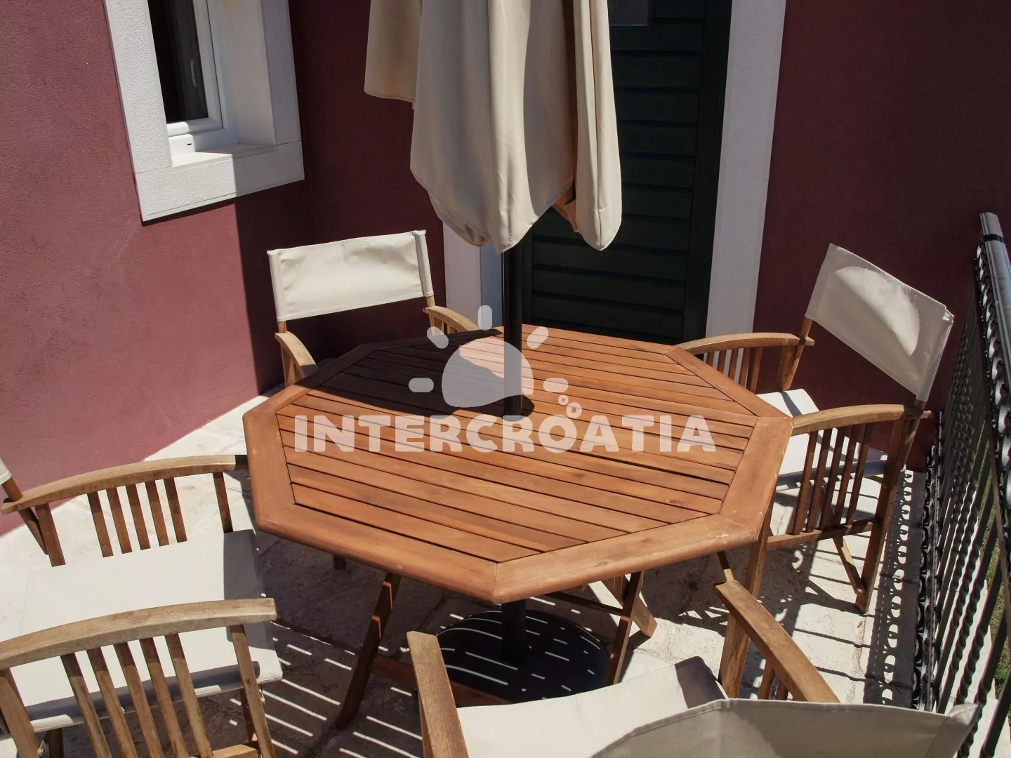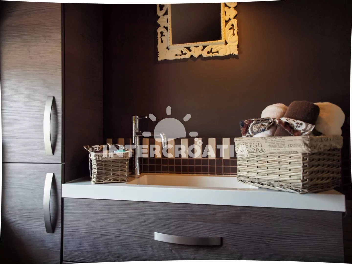 Vkusně zařízený apartmán (43 m) s terasou a výhledem na moře se nachází v přízemí vily a je vhodný pro 2 až 4 osoby. Obývací pokoj je spojený s kuchyní. Kuchyňská linka je vybavena sklokeramickou varnou deskou, vestavěnou troubou, myčkou na nádobí, mikrovlnnou troubou, rychlovarnou konvicí, kávovarem, toustovačem, nádobím a lednicí s mrazákem. Obývací pokoj s jídelním stolem pro 4 osoby, pohovkou (rozložitelná na extra lůžko pro 2 osoby), televizí se satelitním programem, radiem, klimatizací a vstupem na terasu. Ložnice s dvoulůžkem a sejfem. Koupelna se sprchovým koutem, umyvadlem, fénem a wc. Hostům je k dispozici parkování u objektu zdarma.