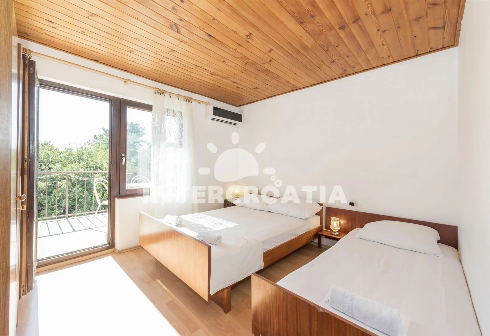Apartmán (70 m2) s terasou a venkovním posezením se nachází v 2. patře vily a je vhodný pro až 6 osob. Obývací místnost je spojena s kuchyní. Kuchyňská linka je vybavena sporákem s troubou, digestoří, myčkou na nádobí, kávovarem, rychlovarnou konvicí, kávovarem, nádobím a lednicí s mrazákem. Obývací místnost s jídelním stolem pro 6 osob a televizí se satelitním programem. Tři samostatné ložnice jsou vybaveny vždy s dvoulůžkem, klimatizací a vstupem na terasu. Dvě koupelny se sprchovým koutem, umyvadlem a wc. Pračka, žehlička a fén k dispozici na požádání. Parkování u objektu.