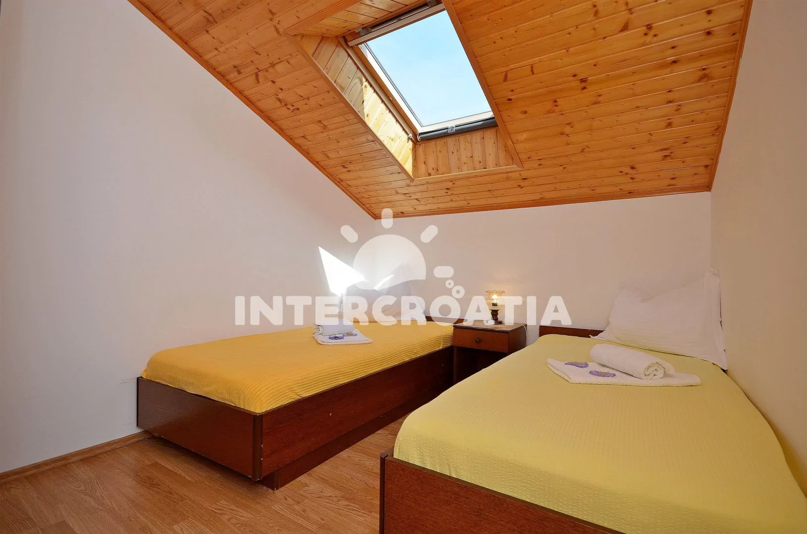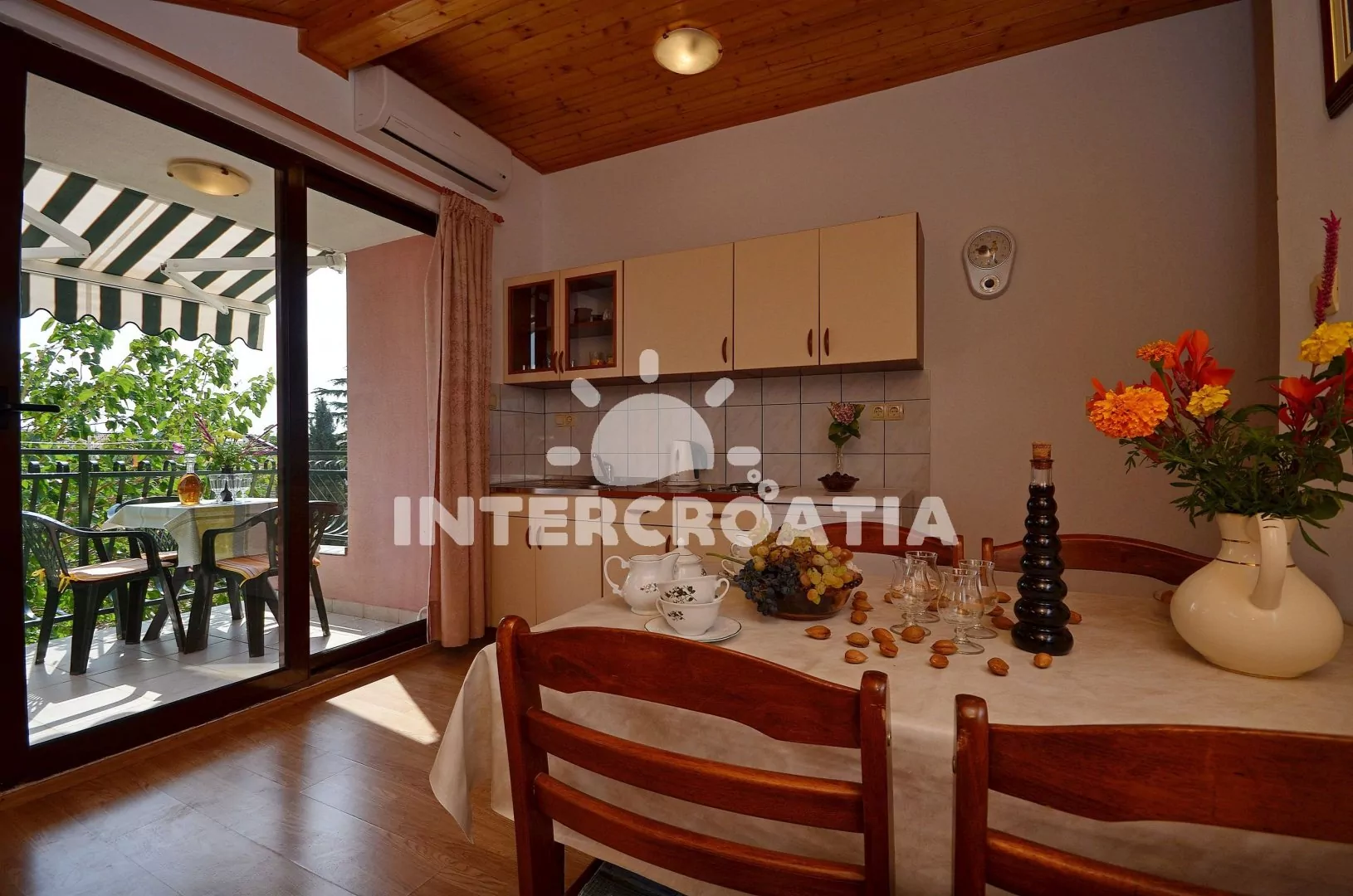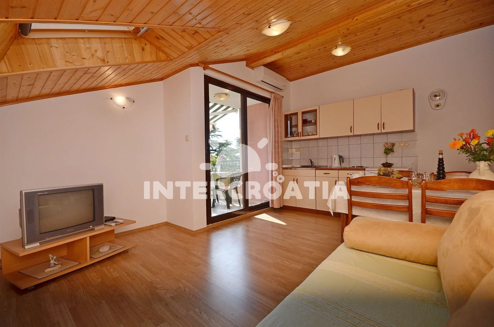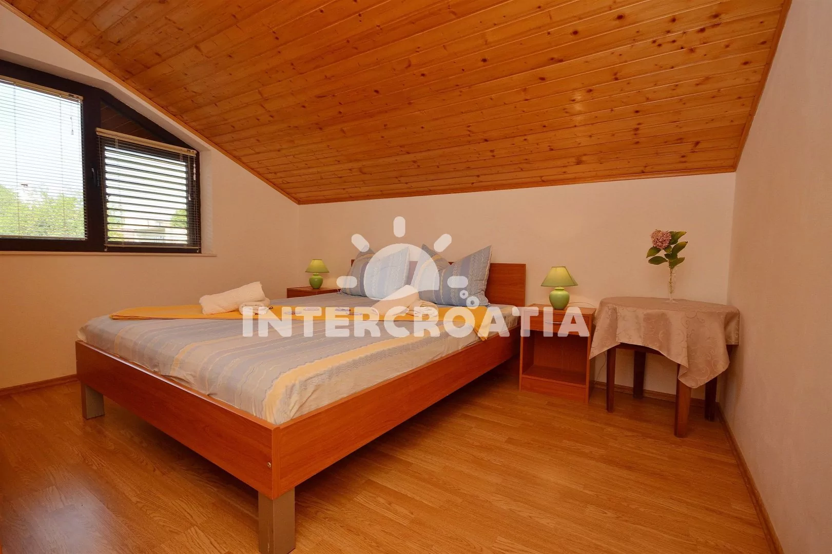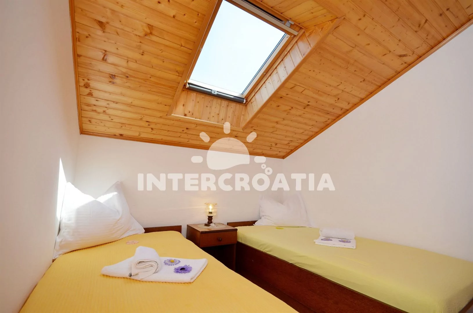Apartmán (48 m2) s balkonem a výhledem na moře se nachází v 2. patře domu a je vhodný pro 4 až 5 osob. Obývací pokoj je spojený s kuchyní. Kuchyňská linka je vybavena dvouplotýnkovým vařičem, rychlovarnou konvicí, kávovarem, nádobím a lednicí s mrazákem. Obývací pokoj s jídelním stolem pro 4 osoby, pohovkou (rozložitelná na extra lůžko pro 1 osobu), televizí se satelitním programem, klimatizací a vstupem na balkon. První ložnice s dvoulůžkem. Druhá ložnice s dvěma jednolůžky. Koupelna se sprchovým koutem, umyvadlem, fénem a wc. Hostům je k dispozici parkování u objektu zdarma.