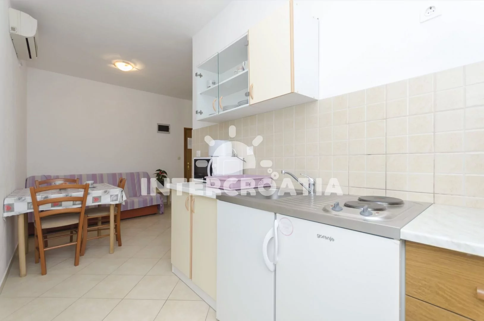 Apartmán (30 m2) s balkonem a posezením se nachází v 1. patře domu a je vhodný pro 2 až 3 osoby. Obývací pokoj je spojený s kuchyní. Kuchyňská linka je vybavena dvouplotýnkovým vařičem, rychlovarnou konvicí, kávovarem, nádobím a lednicí s mrazákem, mikrovlnná trouba na požádání. Obývací pokoj s jídelním stolem pro 3 osoby, pohovkou (rozložitelná na extra lůžko pro 1 osobu), televizí a klimatizací. Ložnice s dvoulůžkem a vstupem na balkon. Koupelna se sprchovým koutem, umyvadlem a wc. Hostům je k dispozici parkování u objektu zdarma.