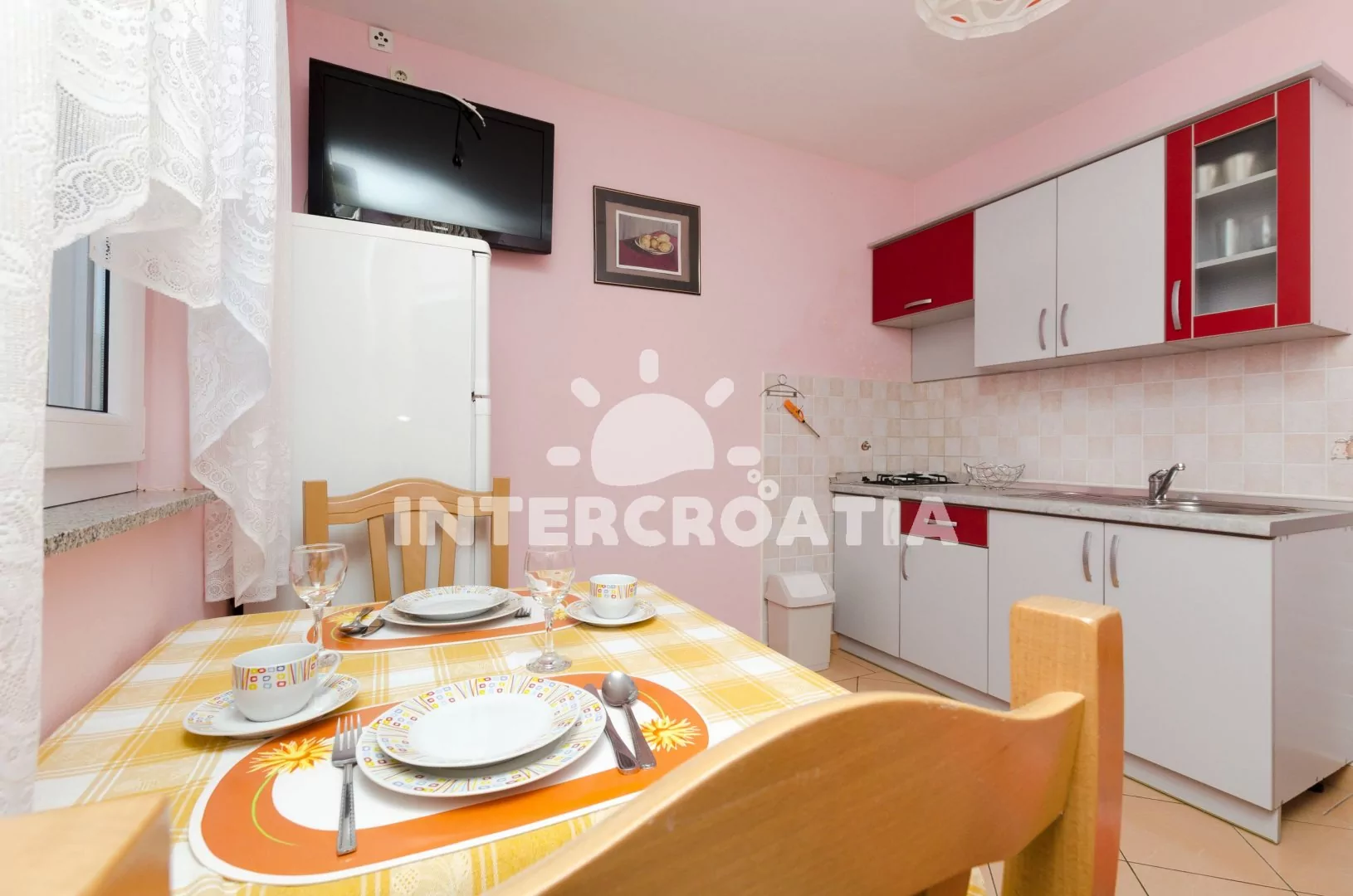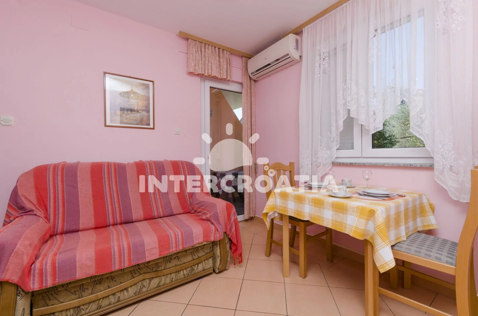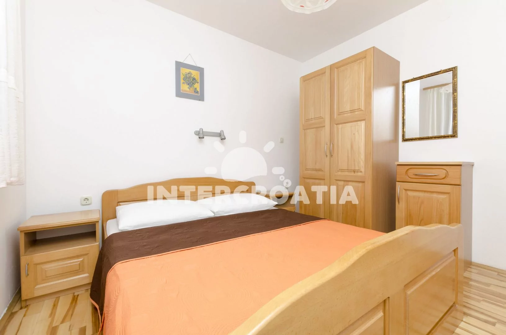 Apartmán (55 m2) s balkonem a venkovním posezením se nachází v 1. patře domu a je vhodný pro 4 až 6 osob. Obývací pokoj je spojený s kuchyní. Kuchyňská linka je vybavena dvouplotýnkovým vařičem, nádobím a lednicí s mrazákem. Obývací pokoj s jídelním stolem, pohovkou (rozložitelná na extra lůžko pro 2 osoby), televizí se satelitním programem, klimatizací a vstupem na balkon. První ložnice s dvoulůžkem. Druhá ložnice s dvěma jednolůžky. Koupelna se sprchovým koutem, umyvadlem a wc. Hostům je k dispozici parkování u objektu zdarma.